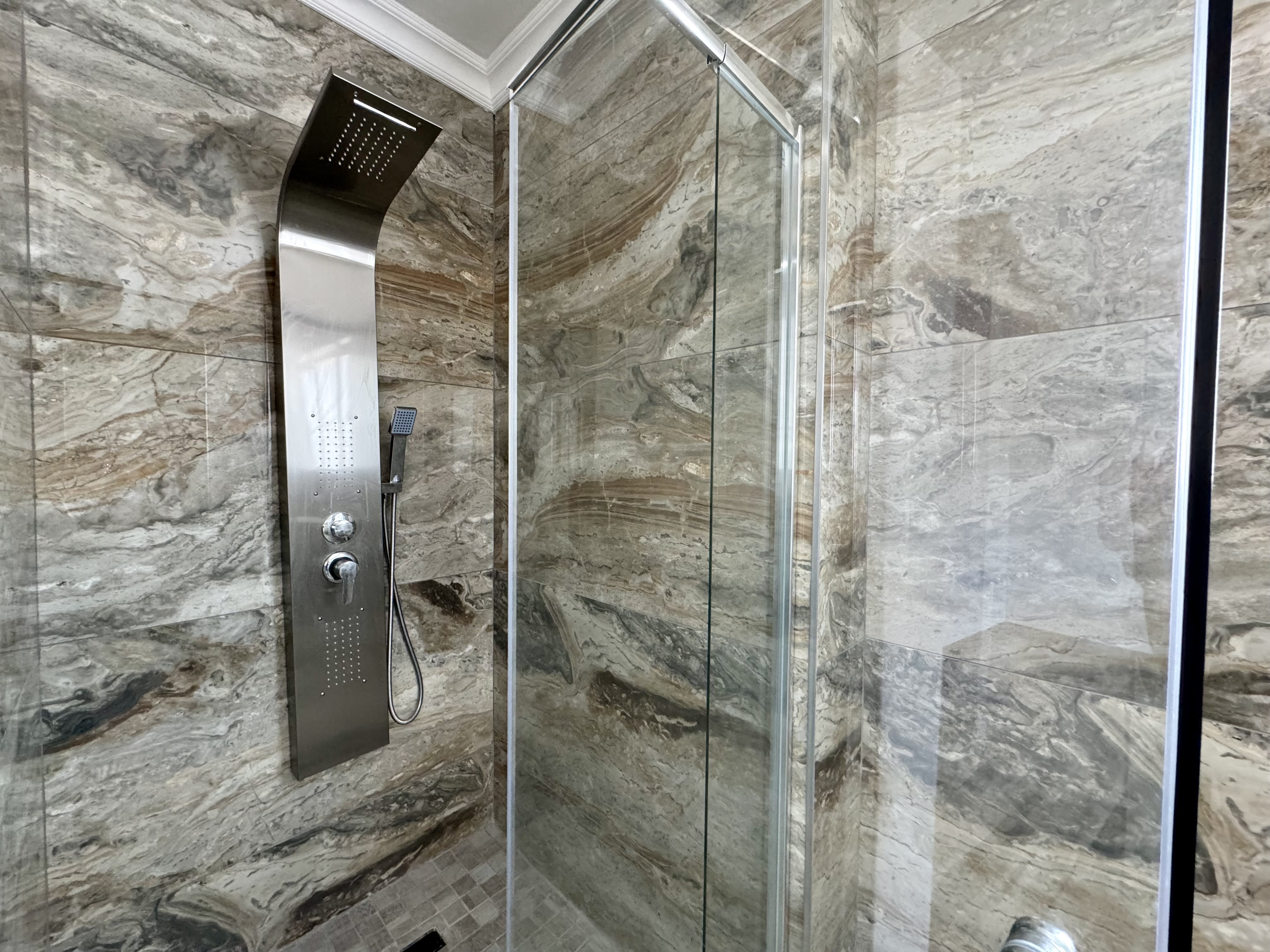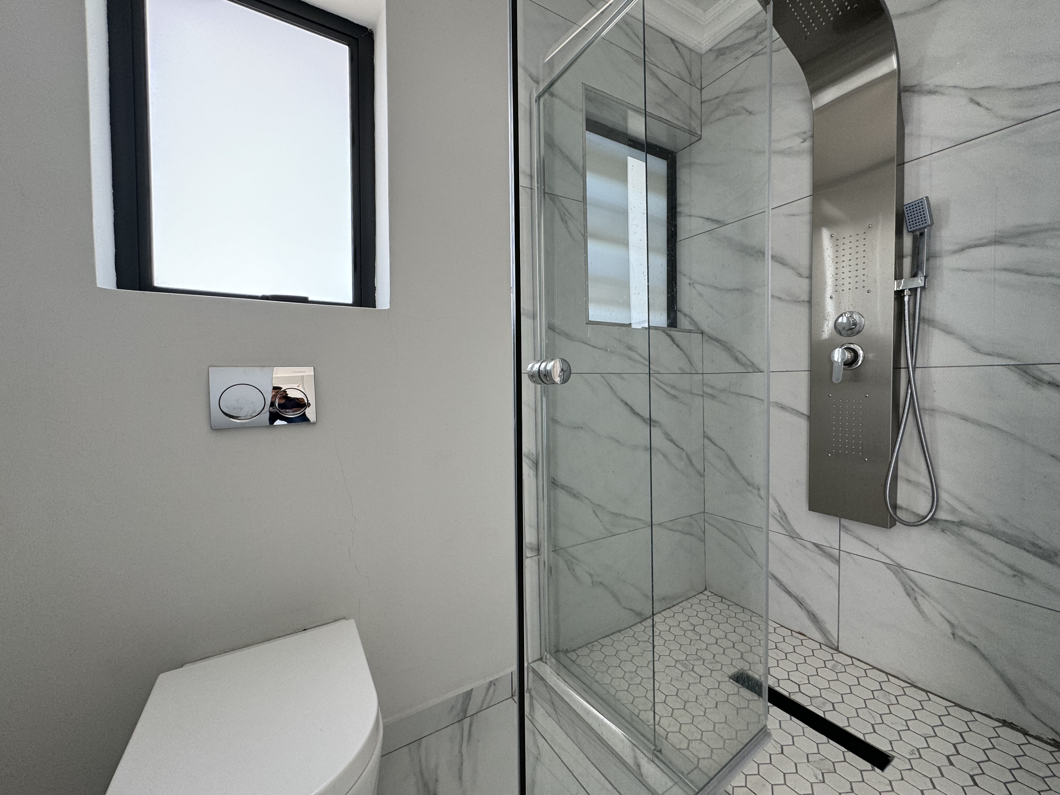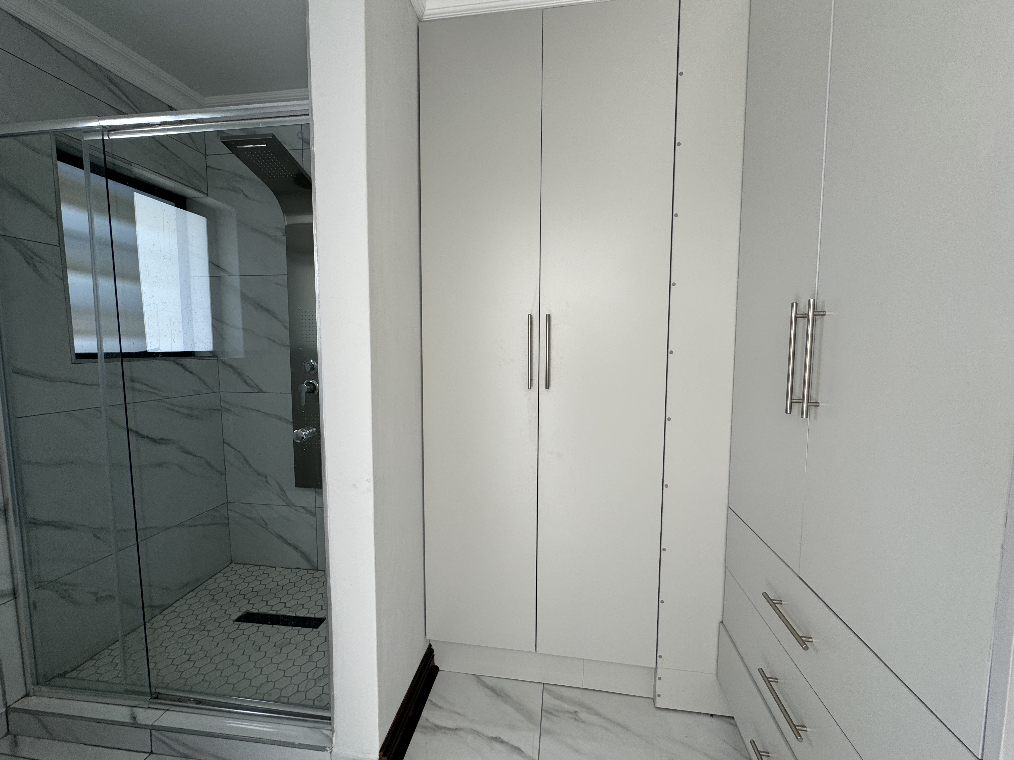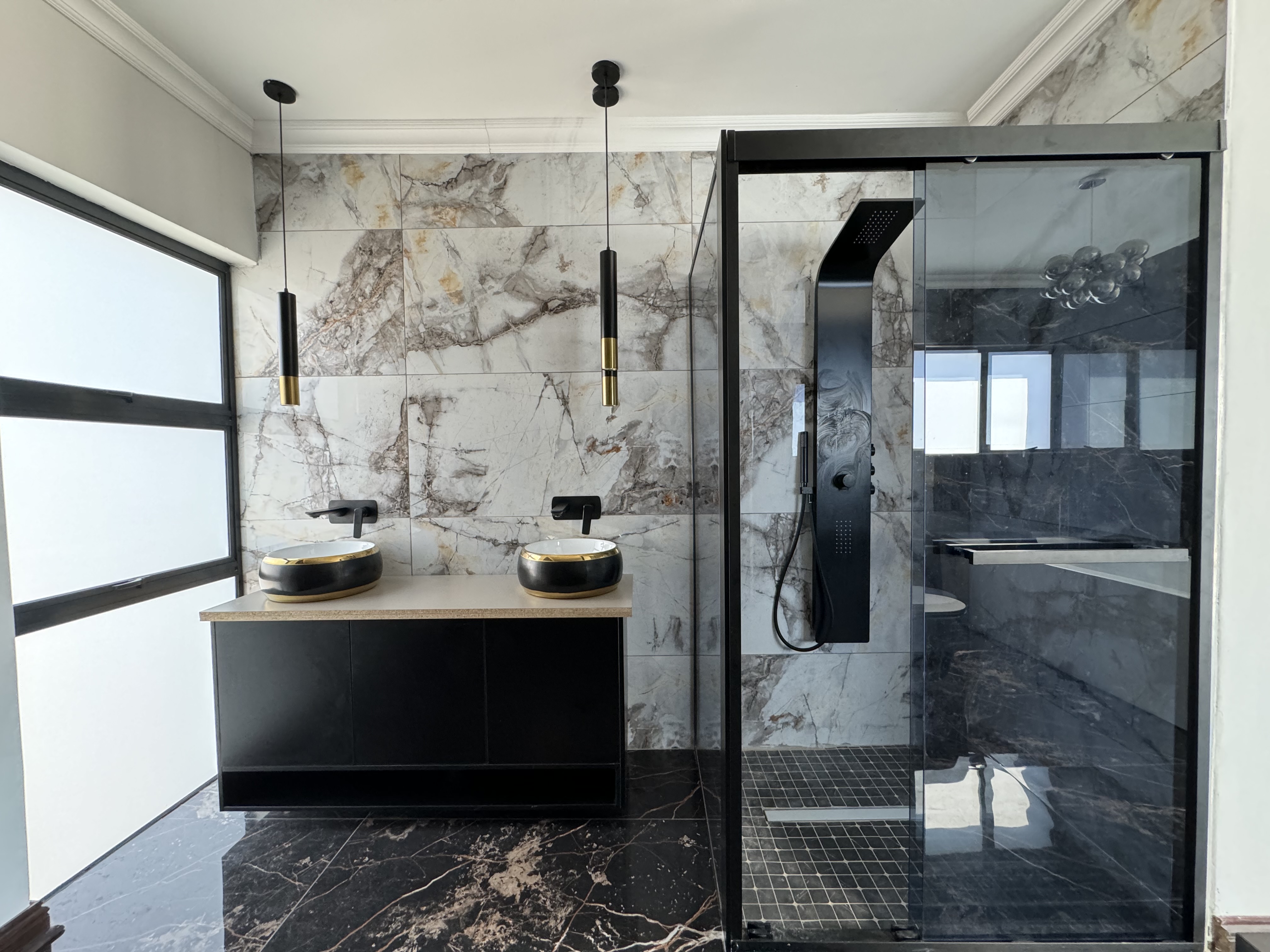 Step through the front door into a bright and welcoming entrance hall, where polished white marble floors reflect the abundance of natural light. On the ground floor, a private en-suite guest bedroom offers comfort and convenience, complemented by a separate powder room for visitors.