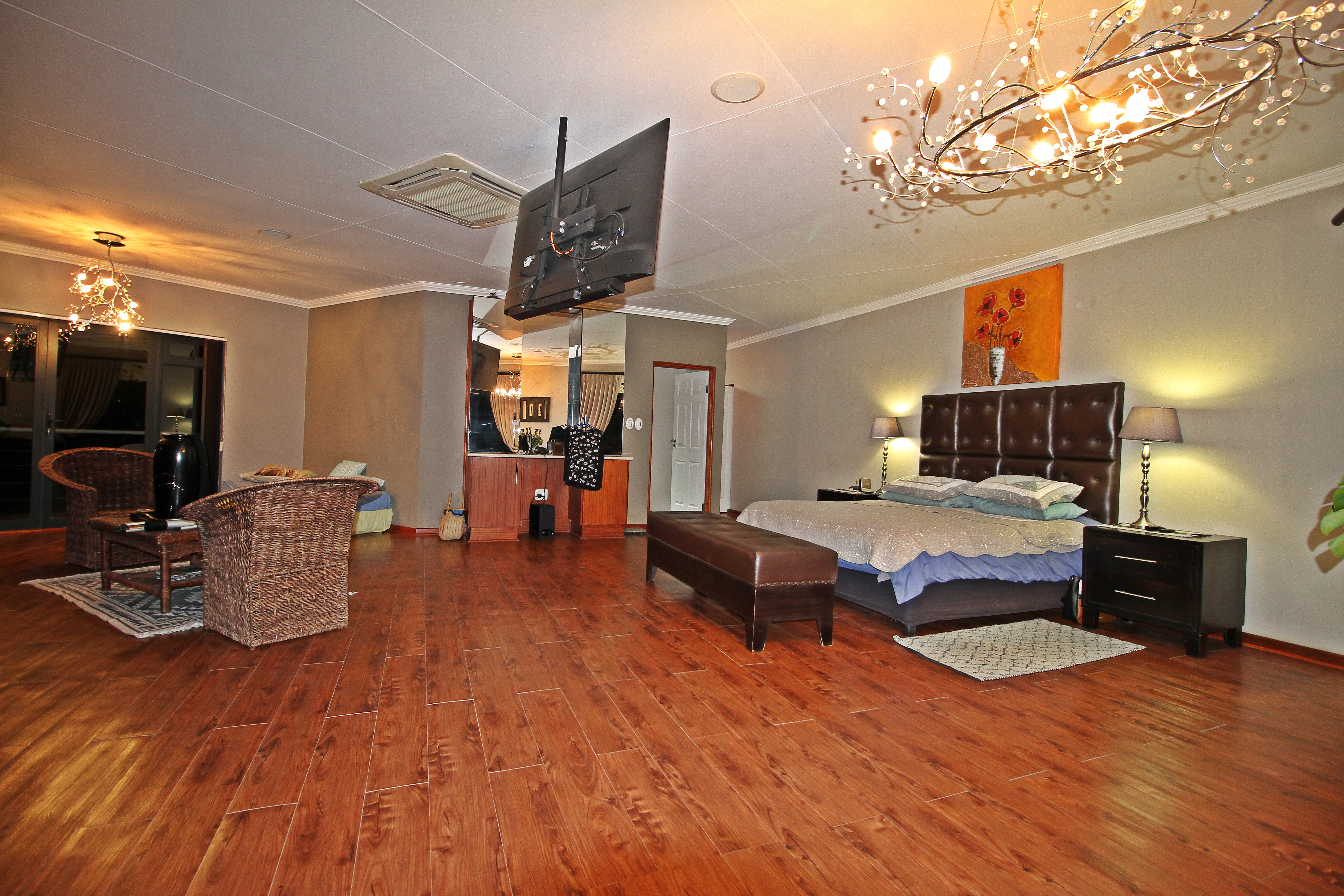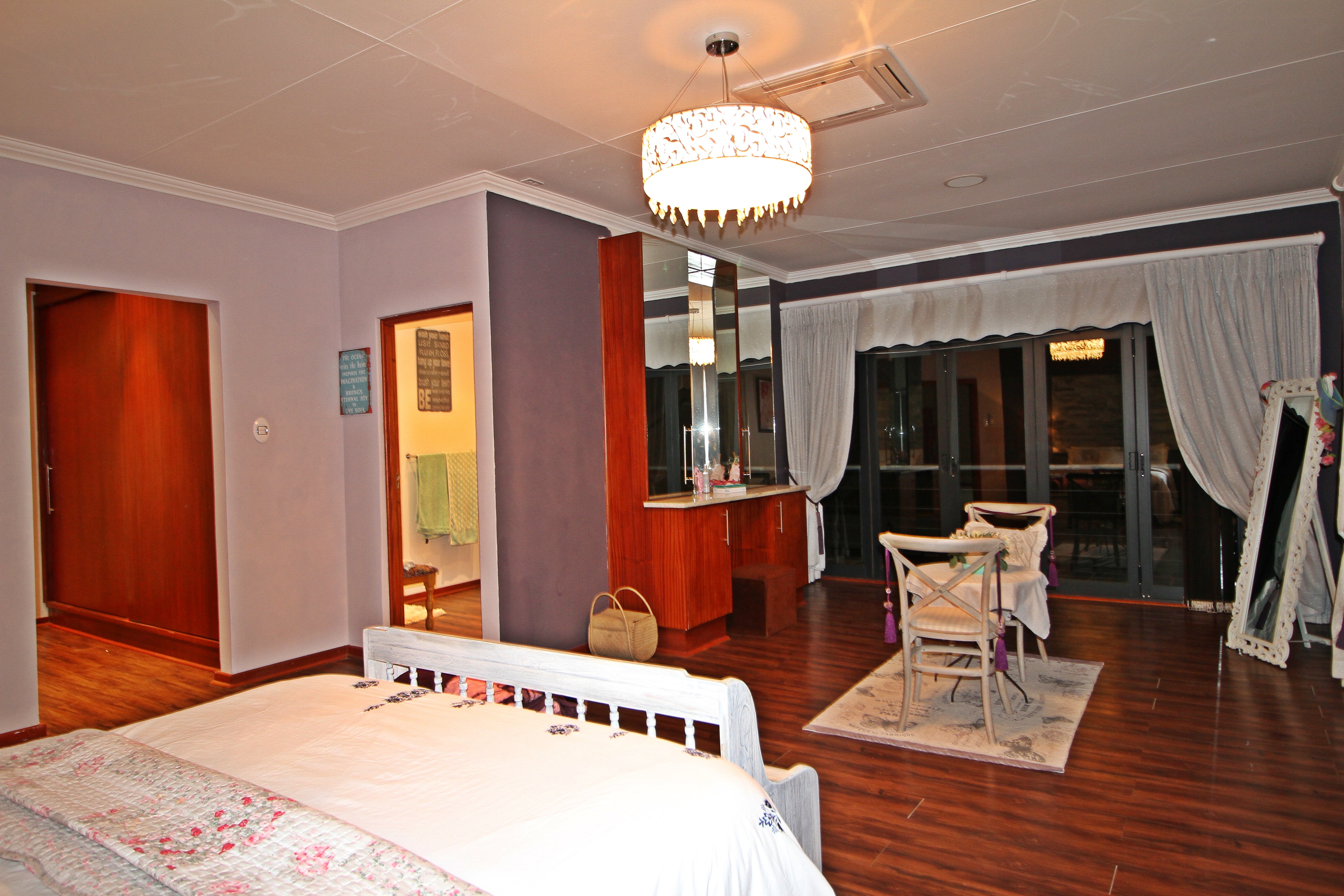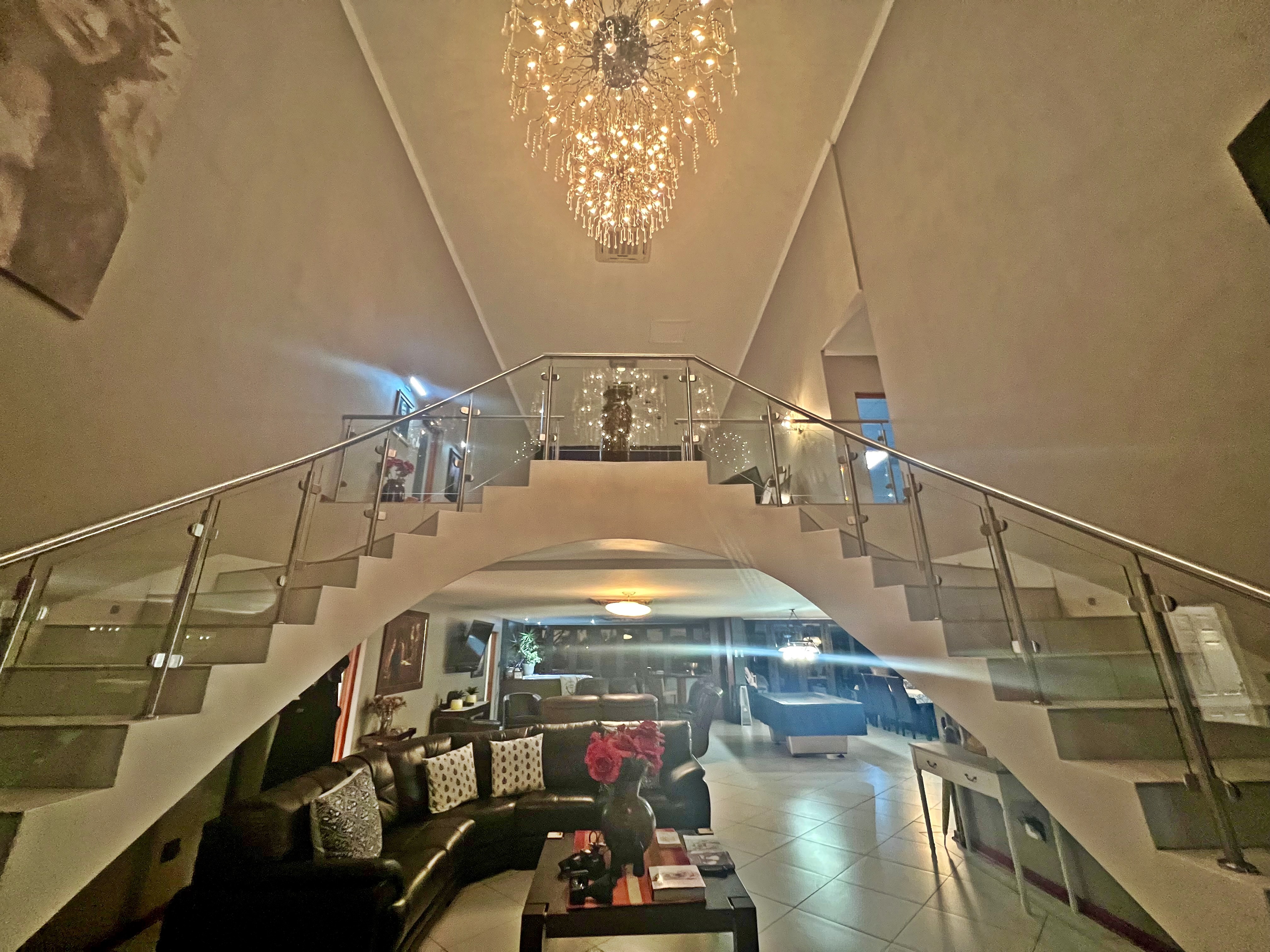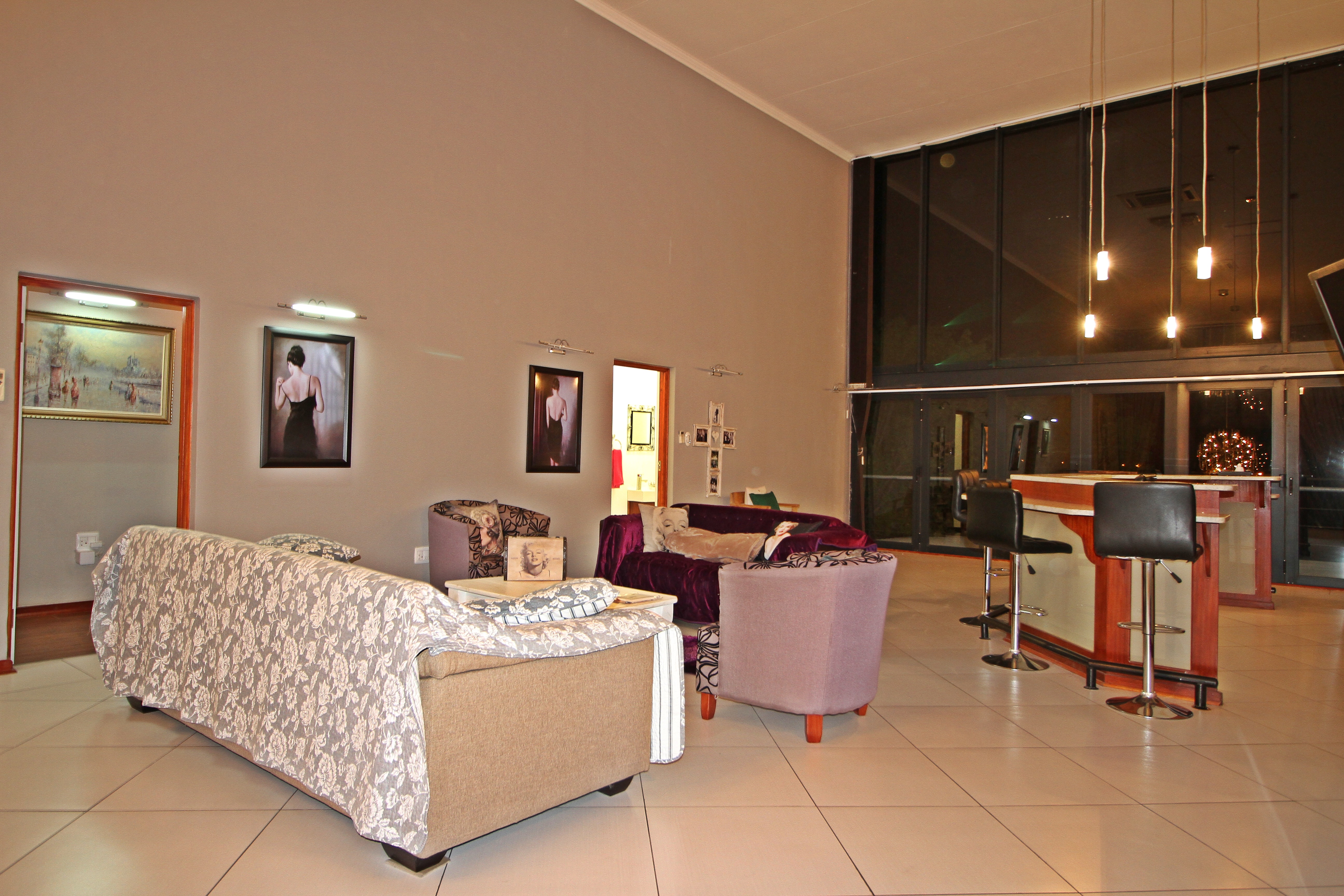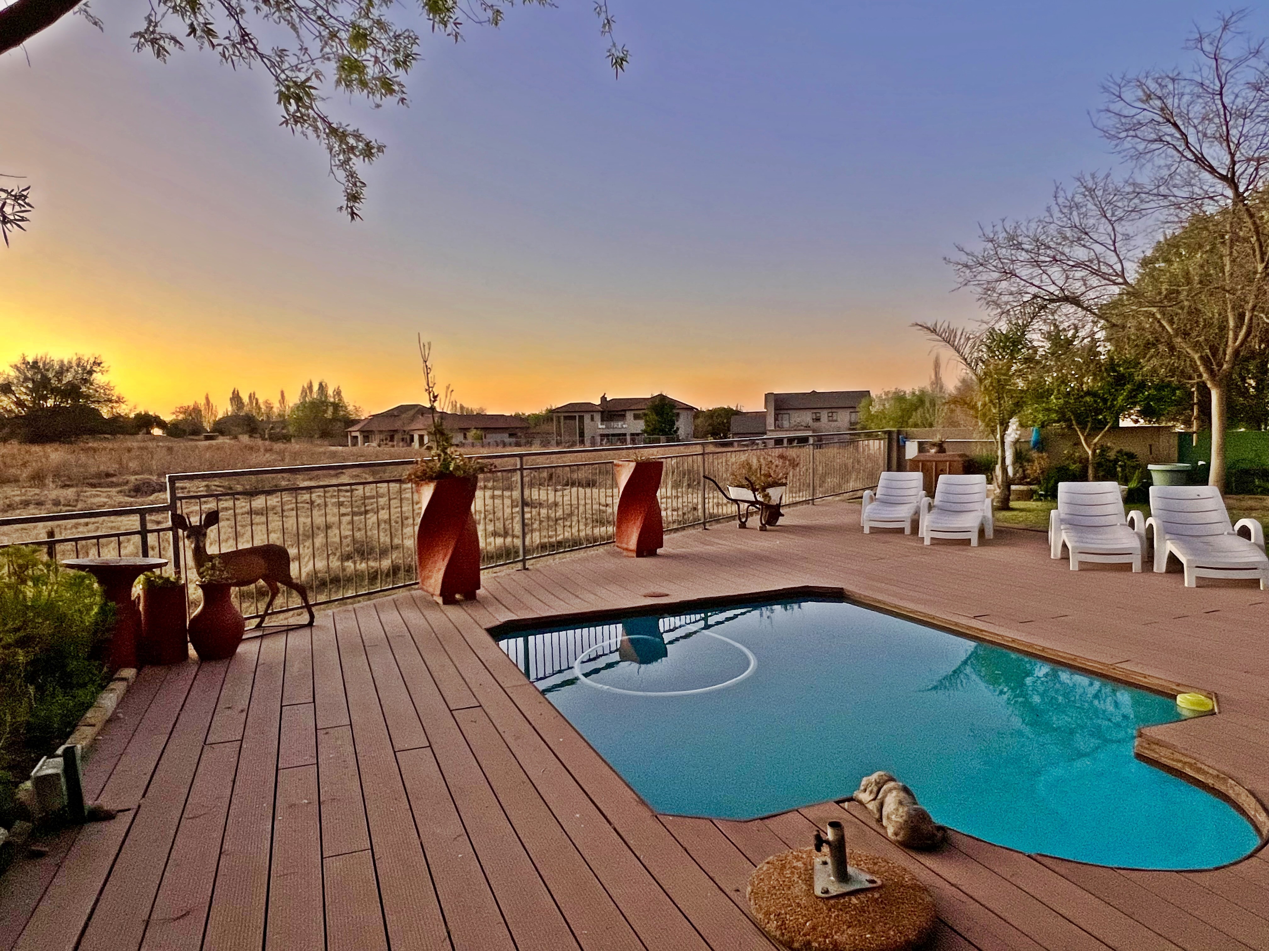 This desirable 5-bedroom family home for sale it fit for a queen, surpasses all expectations of proportion and innovations and is ideally situated, boasting stunning panoramic views of a lush green area within the prestigious Woodland Hills Wildlife Estate. Nestled at the end of a serene street featuring only 9 residences, tranquility and privacy is guaranteed. Upon entering the property, you'll be greeted by a grandiose staircase with the most beautiful chandeliers, that sets the tone for the elegant and spacious interior, complete with contemporary finishes throughout. The open-plan layout effortlessly connects the various living spaces, creating a welcoming ambiance that's perfect for both family gatherings and entertaining friends. The residence offers an array of entertainment options, including a bar and jacuzzi area overlooking a veranda equipped with a built-in braai section, swimming pool, and louvre roof. The natural beauty of the area is enhanced by the presence of nearby wildlife roaming on your doorstep. The open plan kitchen is a Master chef’s dream with its generous cupboard space, granite countertops, gas hob, and even a water connection for your refrigerator. The convenience continues with a spacious pantry and a well-appointed laundry room featuring an external door for easy access. An additional highlight an added extra, is the attached staff accommodation with an en-suite bathroom. The house encompasses a total of 5 super spacious bedrooms, each boasting a luxurious en-suite bathroom and walk-in closet. The master suite has a huge walk in closet and can seat its own lounge suite for your convenience. Glass doors in each bedroom allow abundant natural light to illuminate the space. With 3 bedrooms located upstairs and 2 downstairs, the layout offers flexibility and privacy, making it perfect for accommodating guests. All the upstairs spaces, including the gym area (complete with gym equipment) and an office space and pyjama lounge, provide access to the sprawling balcony. Upstairs also features another bar with a guest toilet, serving as a great spot for intimate gatherings. Modern amenities are prevalent throughout the home, including air conditioning and surround sound systems in every room. Five flat-screen TVs are thoughtfully placed throughout the house. The property is equipped with both a solar geyser and an UPS system that powers essential lights and appliances. With three 5000-liter water tanks and an irrigation system in place, the house is well-prepared to handle water needs. The home's functionality extends to its four spacious garages, which include an additional work area. The sought after estate also offers a range of amenities such as a tennis court, horse stables, walking, cycling and dog trails, putt-putt course, as well as jungle gyms for a comprehensive lifestyle experience. Don’t hesitate a moment longer. Phone Annette now to schedule your private viewing appointment.