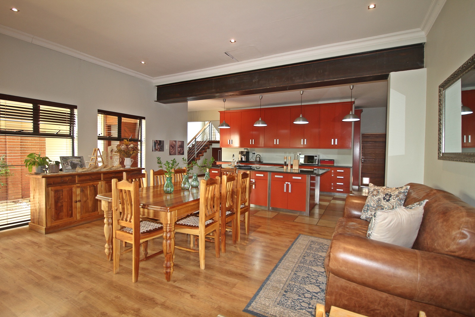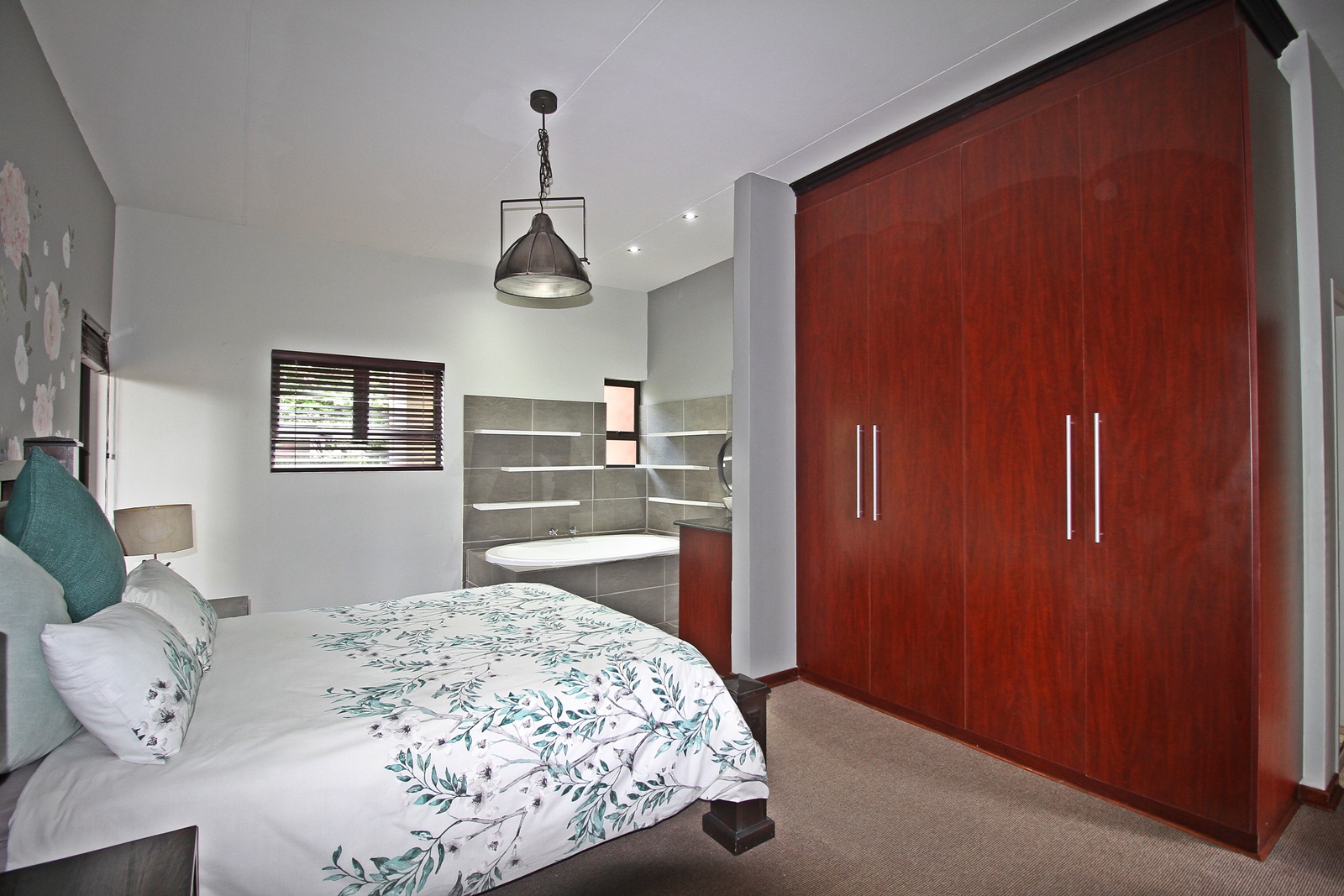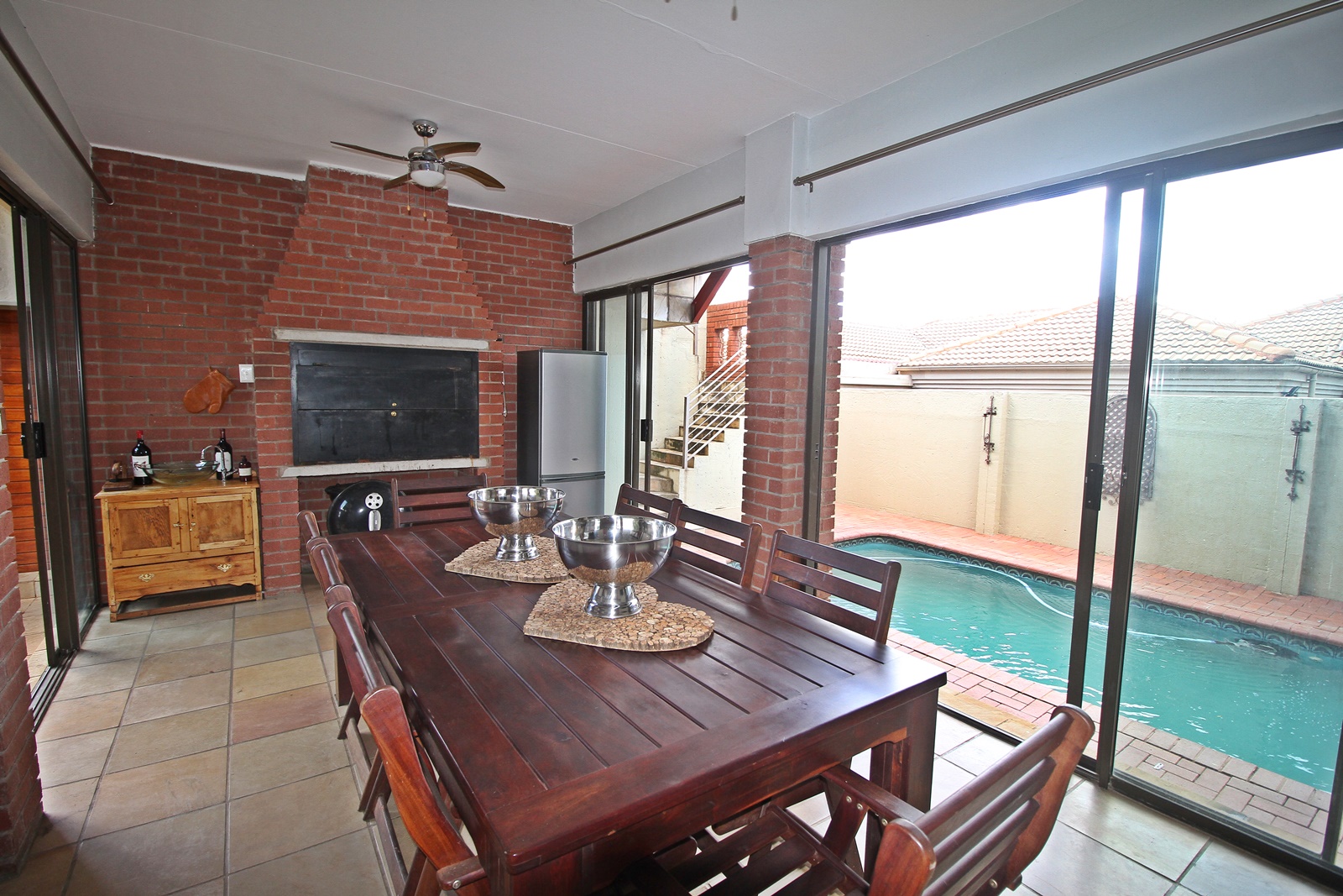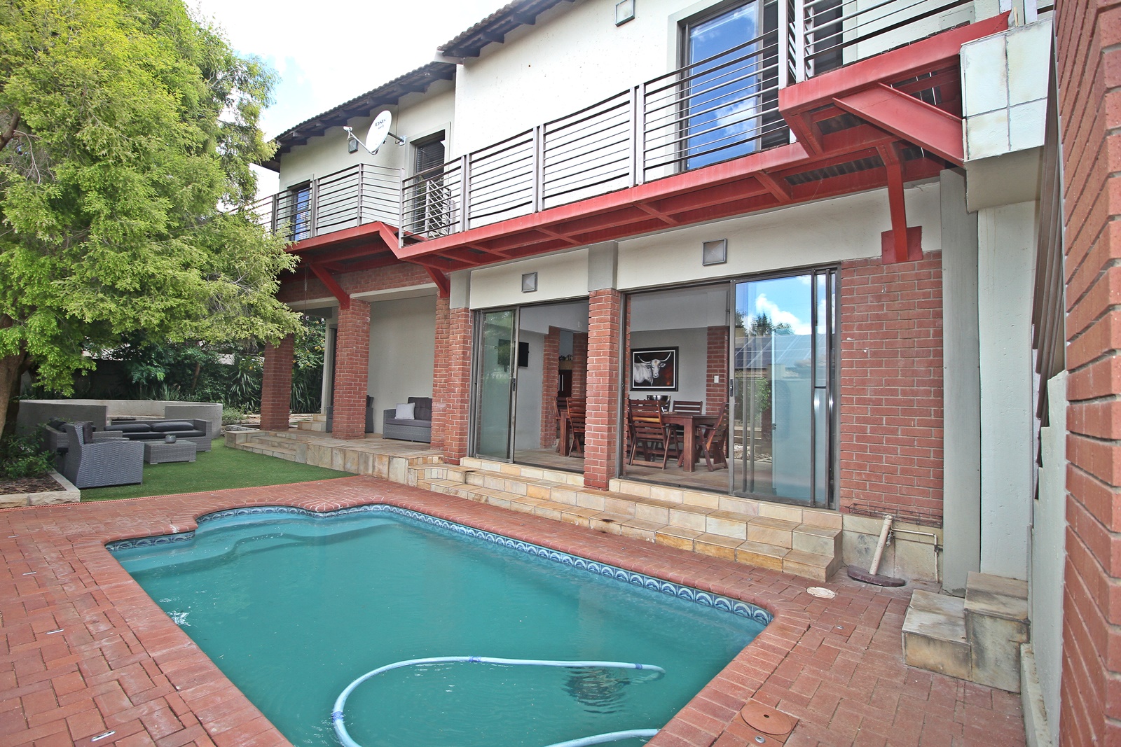 This stunning north-facing double-storey home offers an exceptional lifestyle in the sought-after Woodland Hills Wildlife Estate. With its thoughtful design, generous proportions, and seamless indoor-outdoor flow, this 4-bedroom property provides the ideal setting for modern family living. From the moment you step inside, you're greeted with a sense of privacy and space. The entrance hall leads into a beautifully planned open-plan living area featuring an air-conditioned lounge, dining room, and a gourmet kitchen complete with a scullery — perfect for the aspiring home chef. The living areas radiate a calm and inviting atmosphere, ideal for both relaxed evenings and entertaining. Also on the ground floor is a guest suite with an open-plan en-suite bathroom, plus a separate guest toilet for added convenience. The indoor braai room, fitted with its own basin and TV port, flows out to a sparkling pool and boma area — the perfect backdrop for summer gatherings and storytelling under the stars. Upstairs, the main bedroom is a true sanctuary. Enjoy breathtaking views from your private balcony, and unwind in the spacious walk-in closet and luxurious full en-suite bathroom. Adjacent to the main suite is a fully equipped cinema room with a snack bar and basin — perfect for movie nights at home. The third bedroom offers a walk-in closet, open-plan bathroom, and private balcony, while the fourth bedroom includes a dedicated study area and a bathroom with a double shower. A cozy pajama lounge provides additional space for kids to play or relax with friends. Additional features include: Three neat garages with electric doors Full staff accommodation and an outdoor bathroom Lush, irrigated, and fully walled garden for easy maintenance Prime location opposite the communal tennis court and outdoor gym Walking distance to a nearby shopping center This immaculate property truly combines luxury, practicality, and location — making it an outstanding choice for any family. Contact Annette today to schedule your private viewing. Don’t miss out on this exceptional opportunity!