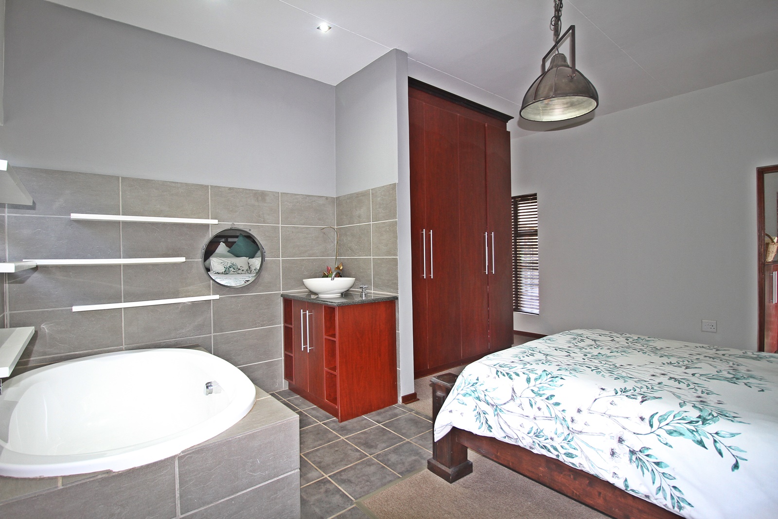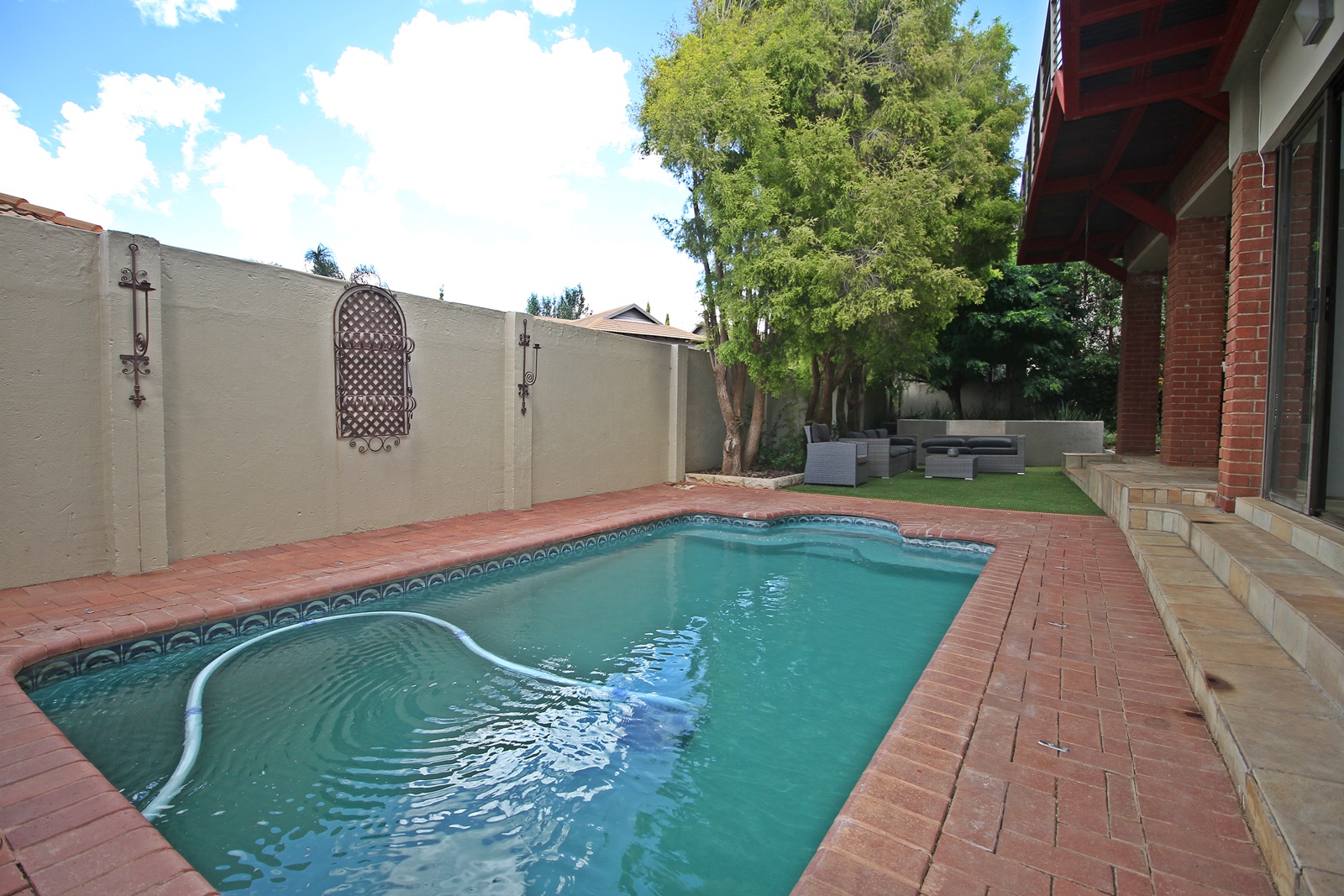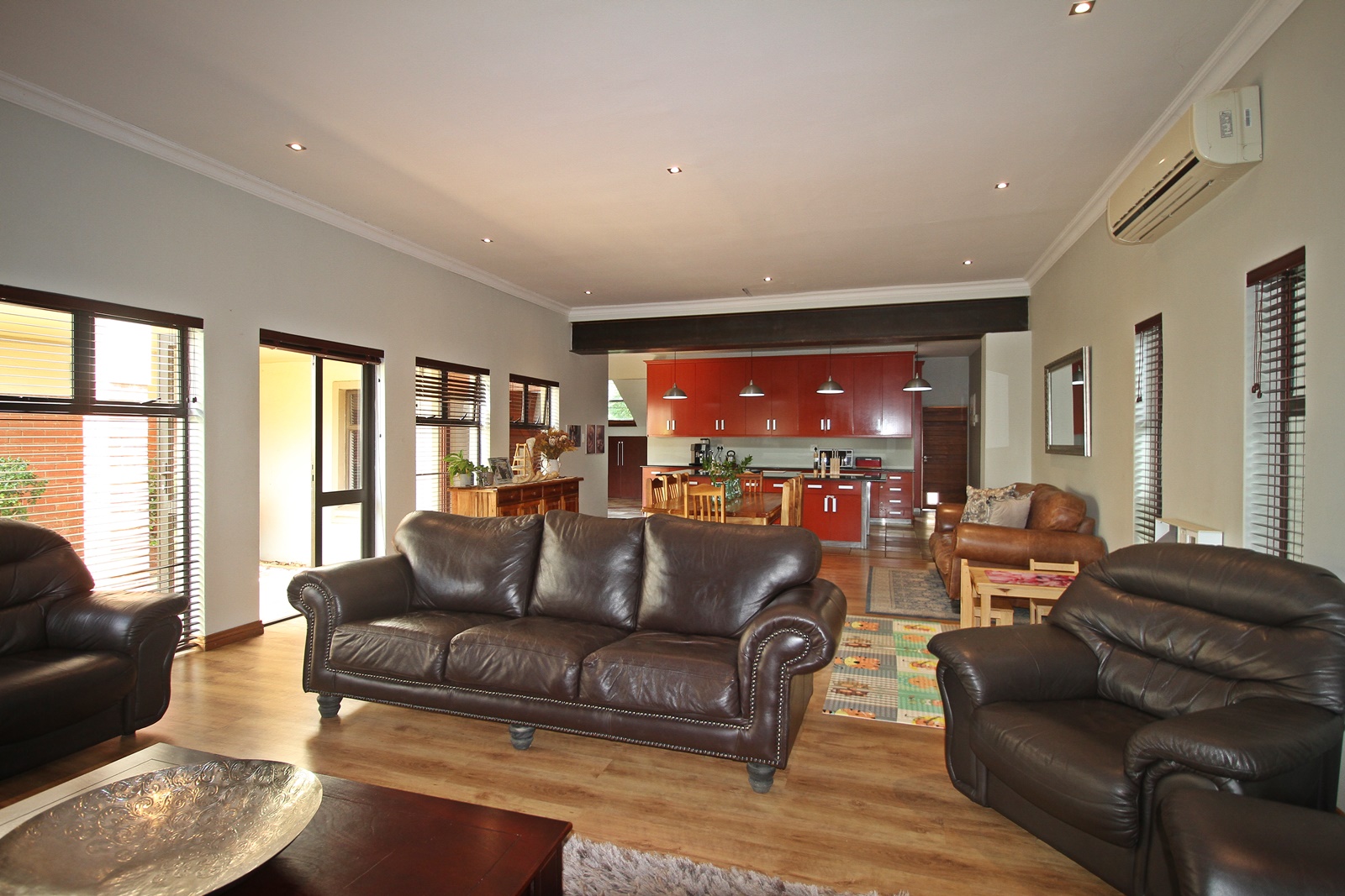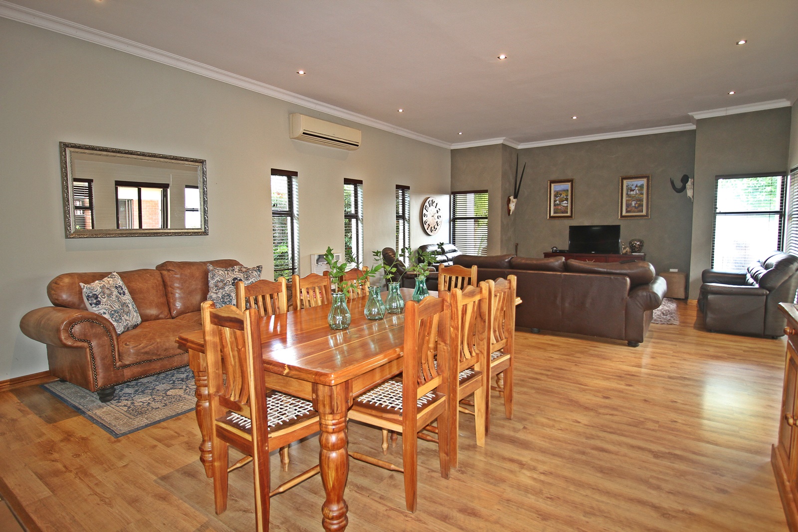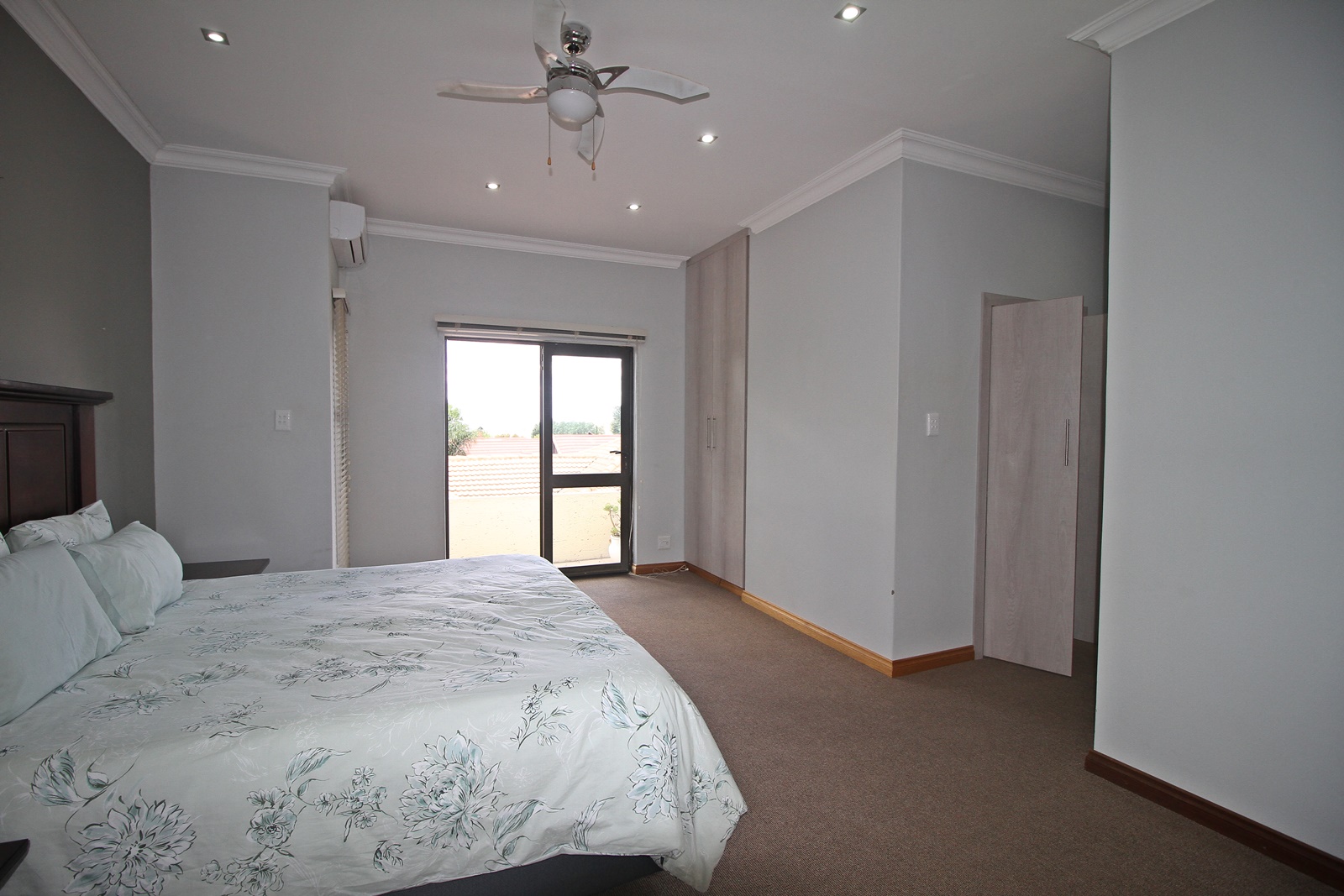 This stunning north-facing double-storey home offers an exceptional lifestyle in the sought-after Woodland Hills Wildlife Estate. With its thoughtful design, generous proportions, and seamless indoor-outdoor flow, this 4-bedroom property provides the ideal setting for modern family living. From the moment you step inside, you're greeted with a sense of privacy and space. The entrance hall leads into a beautifully planned open-plan living area featuring an air-conditioned lounge, dining room, and a gourmet kitchen complete with a scullery — perfect for the aspiring home chef. The living areas radiate a calm and inviting atmosphere, ideal for both relaxed evenings and entertaining. Also on the ground floor is a guest suite with an open-plan en-suite bathroom, plus a separate guest toilet for added convenience. The indoor braai room, fitted with its own basin and TV port, flows out to a sparkling pool and boma area — the perfect backdrop for summer gatherings and storytelling under the stars. Upstairs, the main bedroom is a true sanctuary. Enjoy breathtaking views from your private balcony, and unwind in the spacious walk-in closet and luxurious full en-suite bathroom. Adjacent to the main suite is a fully equipped cinema room with a snack bar and basin — perfect for movie nights at home. The third bedroom offers a walk-in closet, open-plan bathroom, and private balcony, while the fourth bedroom includes a dedicated study area and a bathroom with a double shower. A cozy pajama lounge provides additional space for kids to play or relax with friends. Additional features include: Three neat garages with electric doors Full staff accommodation and an outdoor bathroom Lush, irrigated, and fully walled garden for easy maintenance Prime location opposite the communal tennis court and outdoor gym Walking distance to a nearby shopping center This immaculate property truly combines luxury, practicality, and location — making it an outstanding choice for any family. Contact Annette today to schedule your private viewing. Don’t miss out on this exceptional opportunity!