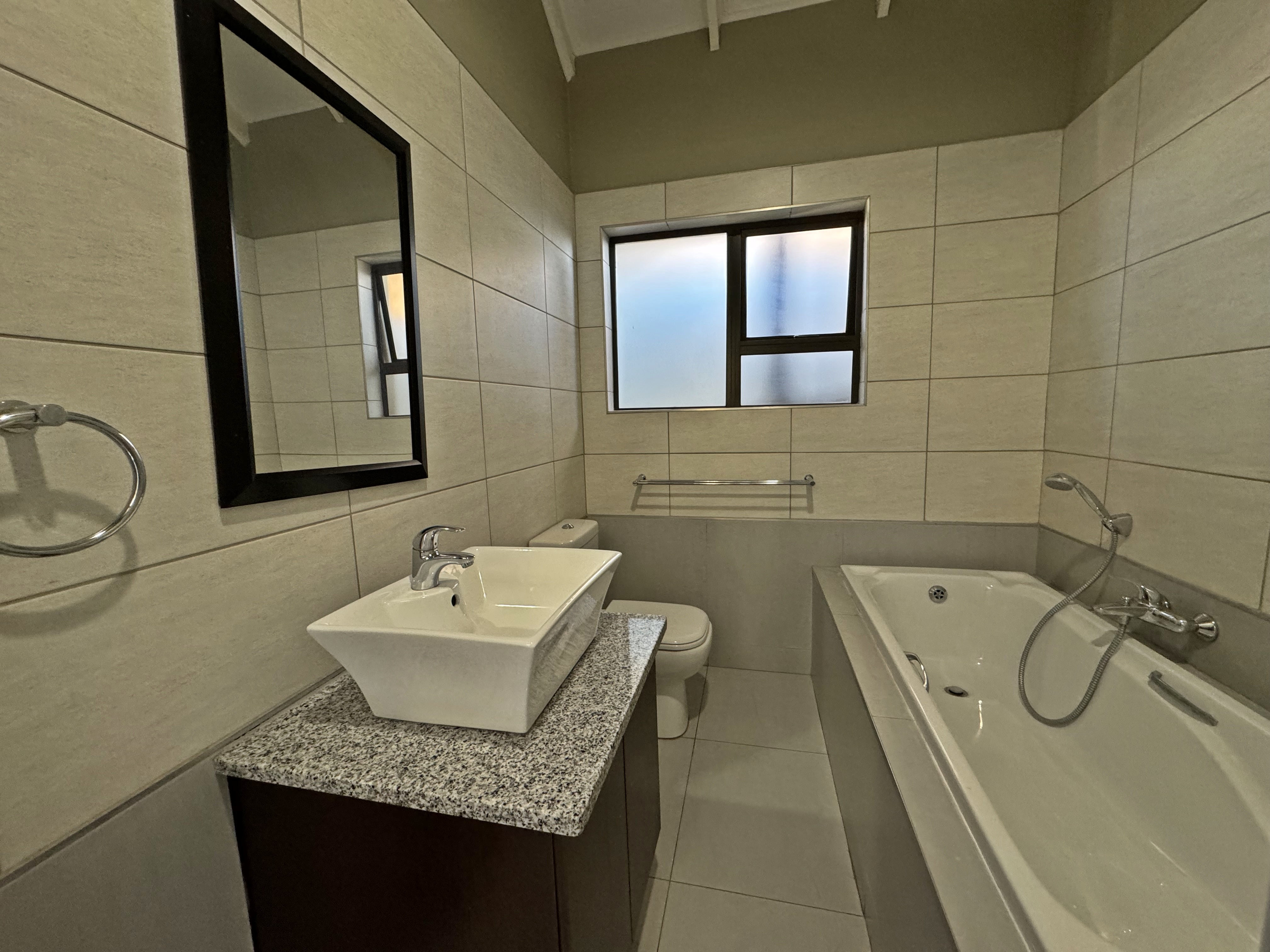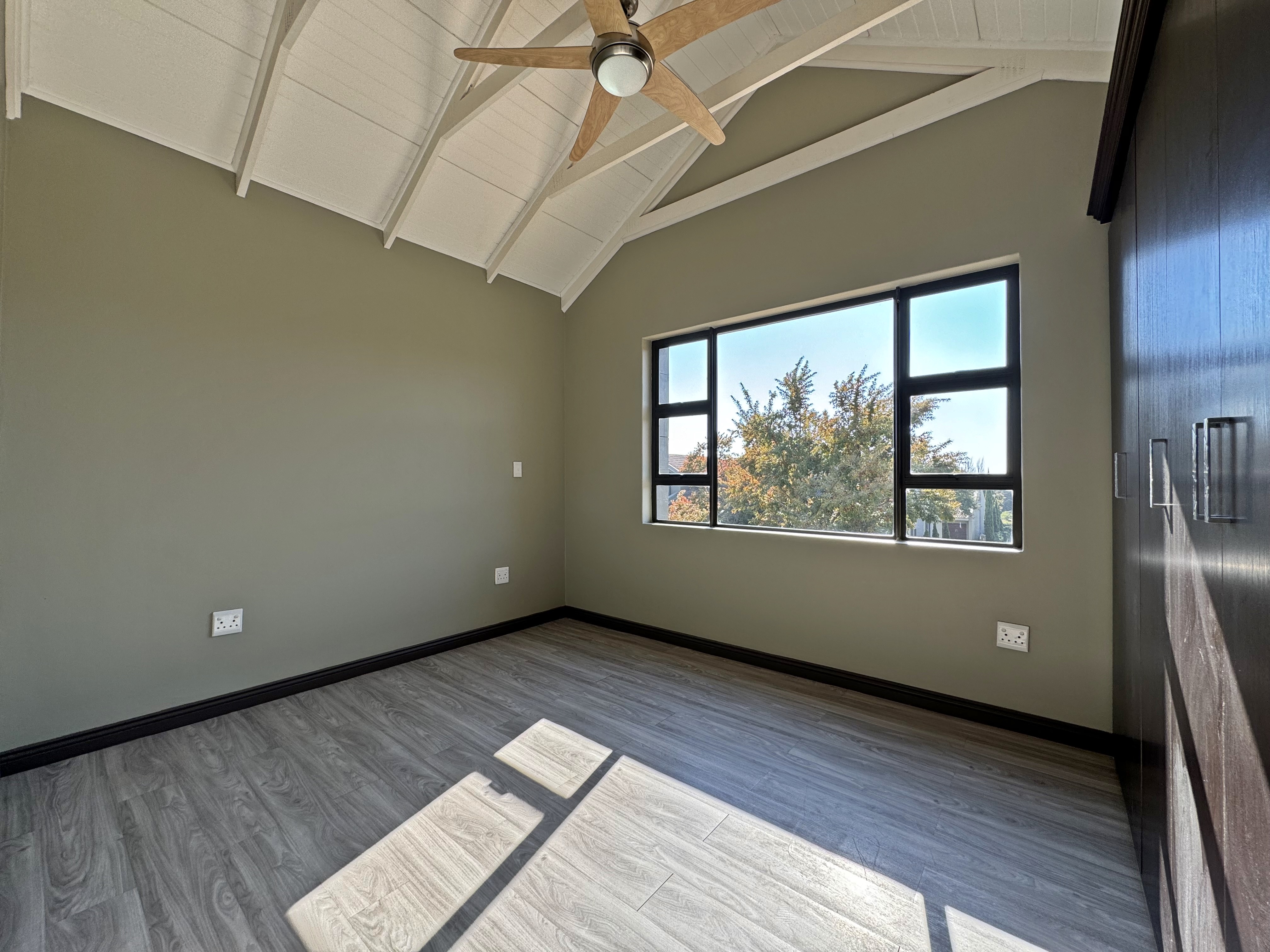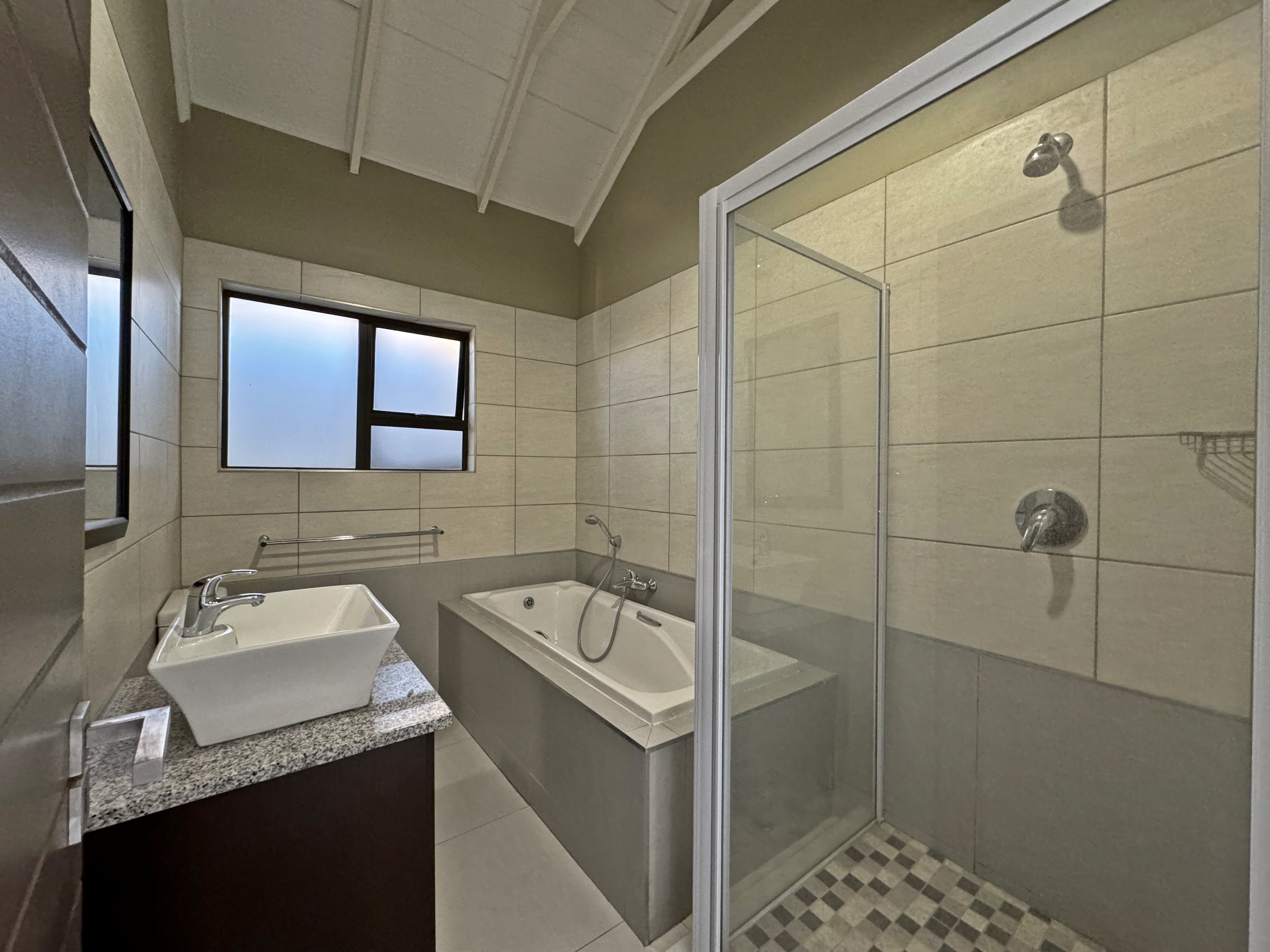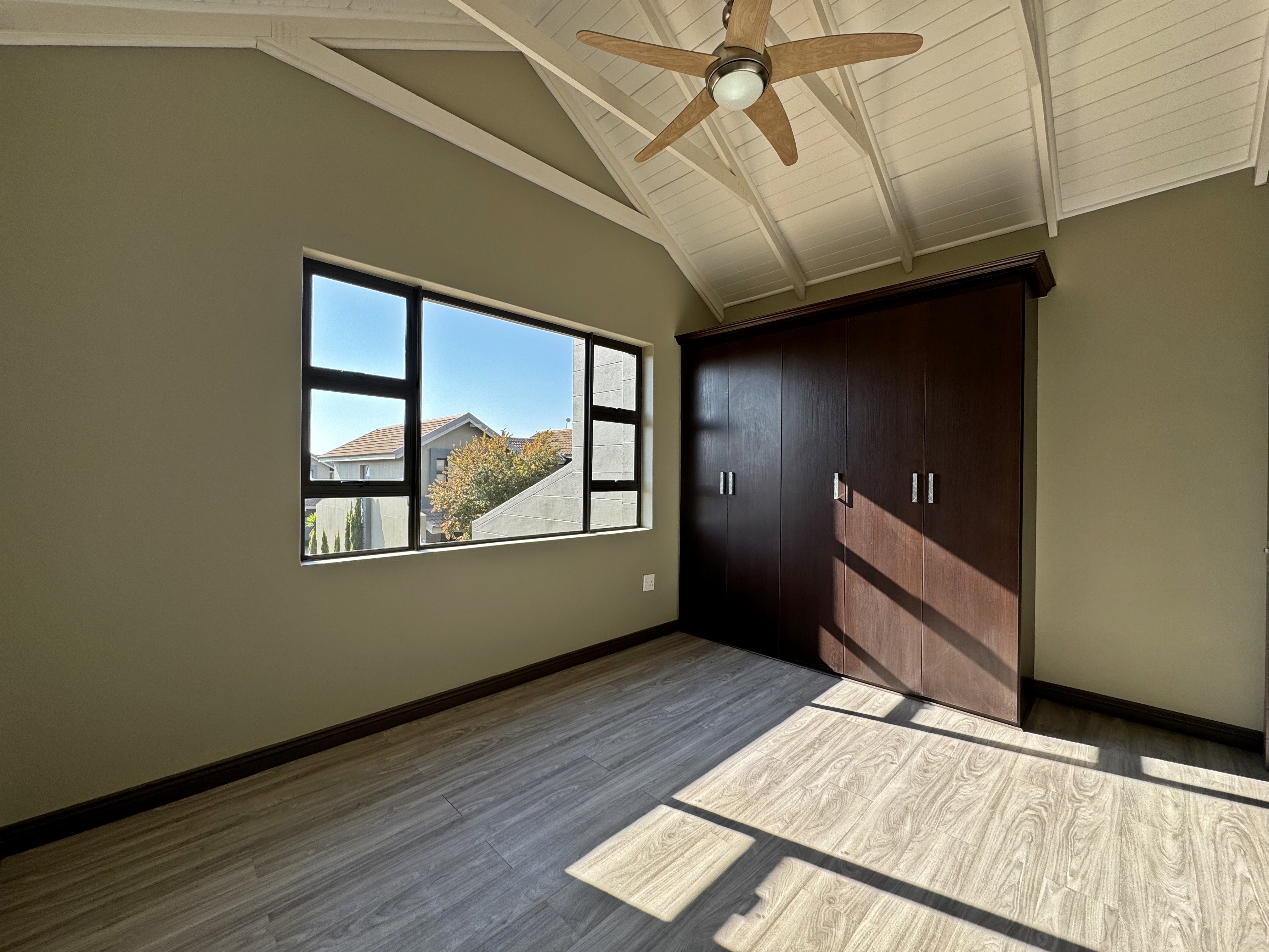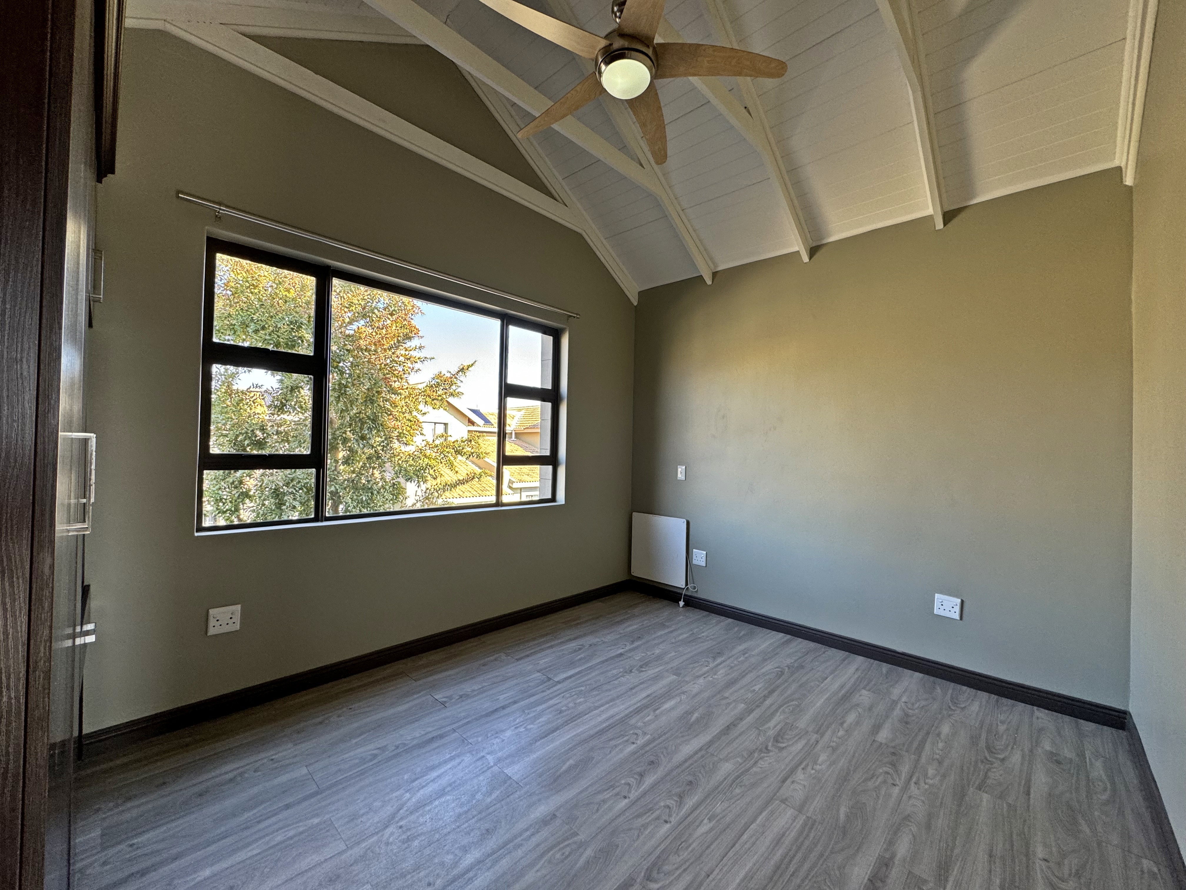 Discover the perfect blend of style, comfort, and functionality in this immaculate double-storey townhouse, ideally situated in a sought-after complex. The spacious open-plan living and dining area sets the tone for modern living, seamlessly connecting to an entertainment room with a built-in braai and large stacking doors that lead to a beautifully landscaped garden. Designed for both relaxation and entertaining, this indoor-outdoor space is a true highlight. The sleek kitchen is a chef’s dream, featuring granite countertops, a gas hob, and a practical scullery for added convenience. A guest bathroom on the main floor ensures comfort for both residents and visitors. The downstairs master suite provides a private retreat with its own en-suite bathroom, while upstairs you’ll find two generously sized bedrooms sharing a stylish full bathroom. Ample storage throughout the home makes organizing a breeze. Contemporary finishes such as vinyl flooring and modern blinds enhance the property’s sophisticated aesthetic. A double automated garage with direct access to the home includes a dedicated laundry area and additional storage. This townhouse offers a perfect balance of elegance and practicality – an ideal choice for discerning buyers seeking a secure and stylish lifestyle. Contact Annette Kasselman today to arrange a private viewing.