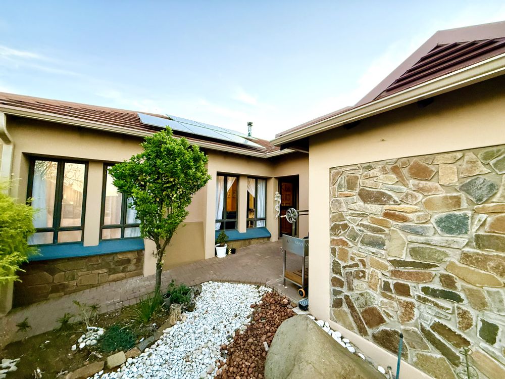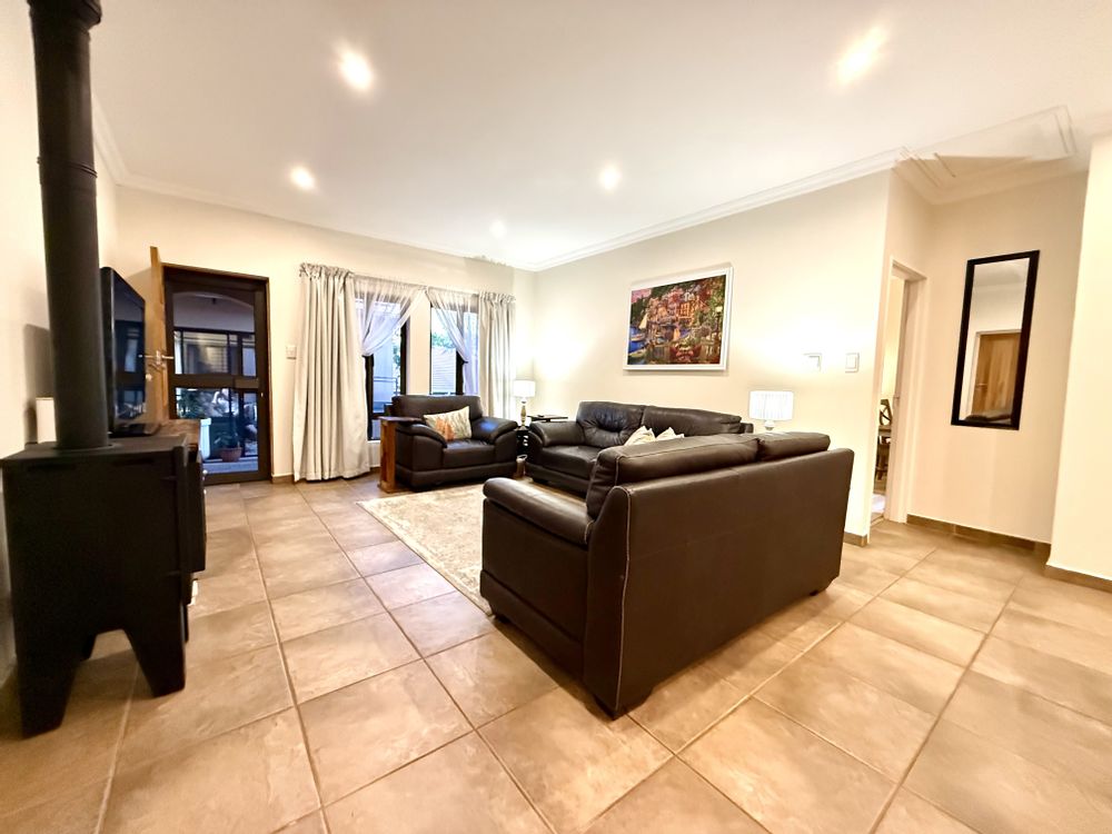 Additional upgrades include new vanities and wash basins in both bathrooms, all-new LED light fittings, a top-of-the-range Bosch gas stove, newly tiled kitchen walls, and modern blinds throughout. The home is also equipped with a Geyserwise system, a charming Gasco wood-burning stove in the lounge, and a full solar setup — including a 5kW Sunsynk inverter, 5kW Sunsynk battery, and six solar panels — ensuring energy efficiency and convenience.