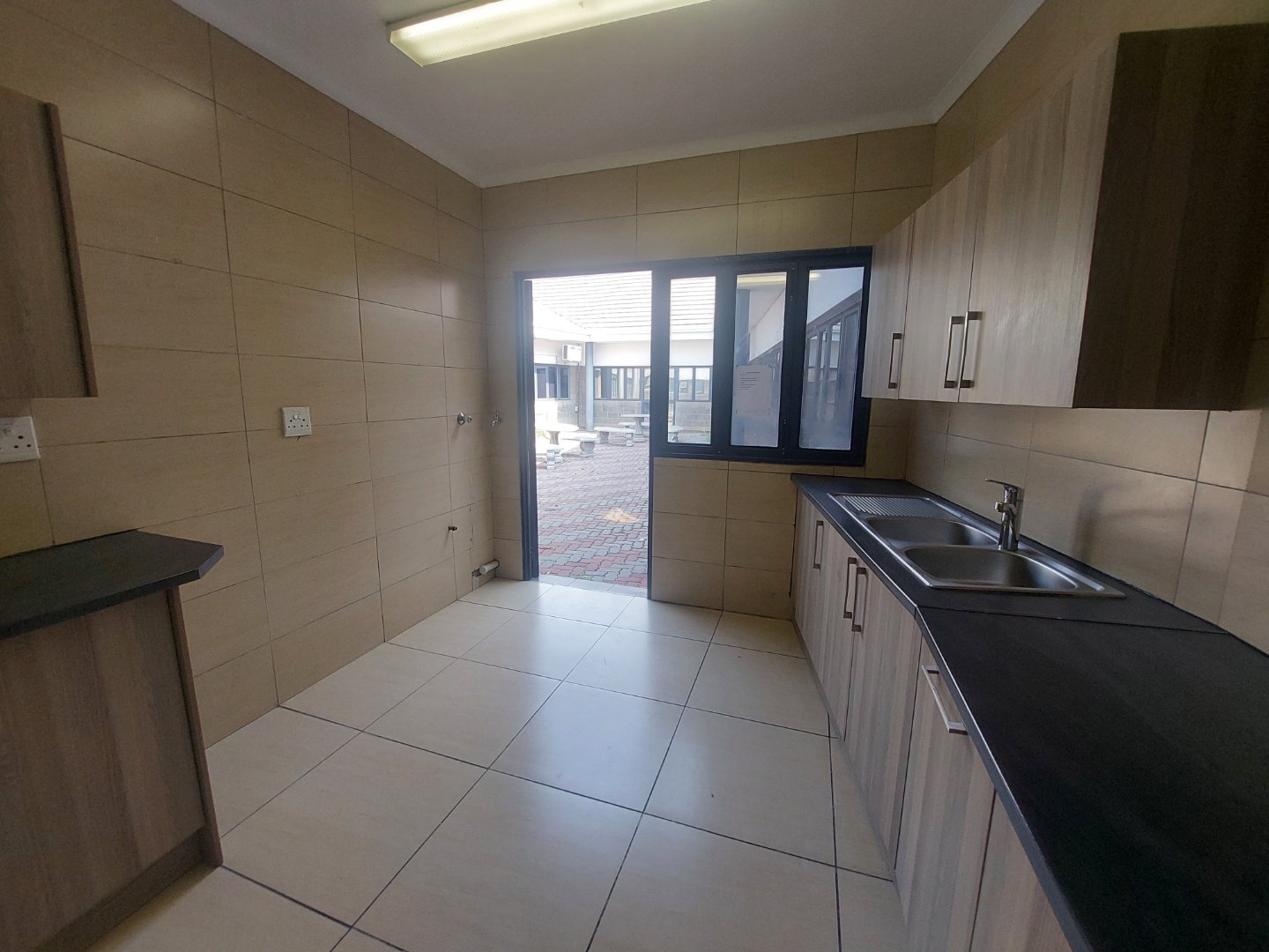 The front half of the building opens onto lush, landscaped gardens teeming with birdlife, complemented by an expansive balcony with a built-in braai—ideal for functions or informal meetings. A large boardroom, training room, or canteen area offers adaptable space for various operational needs. A fully equipped kitchen opens onto a central courtyard, providing a pleasant breakout area for staff.