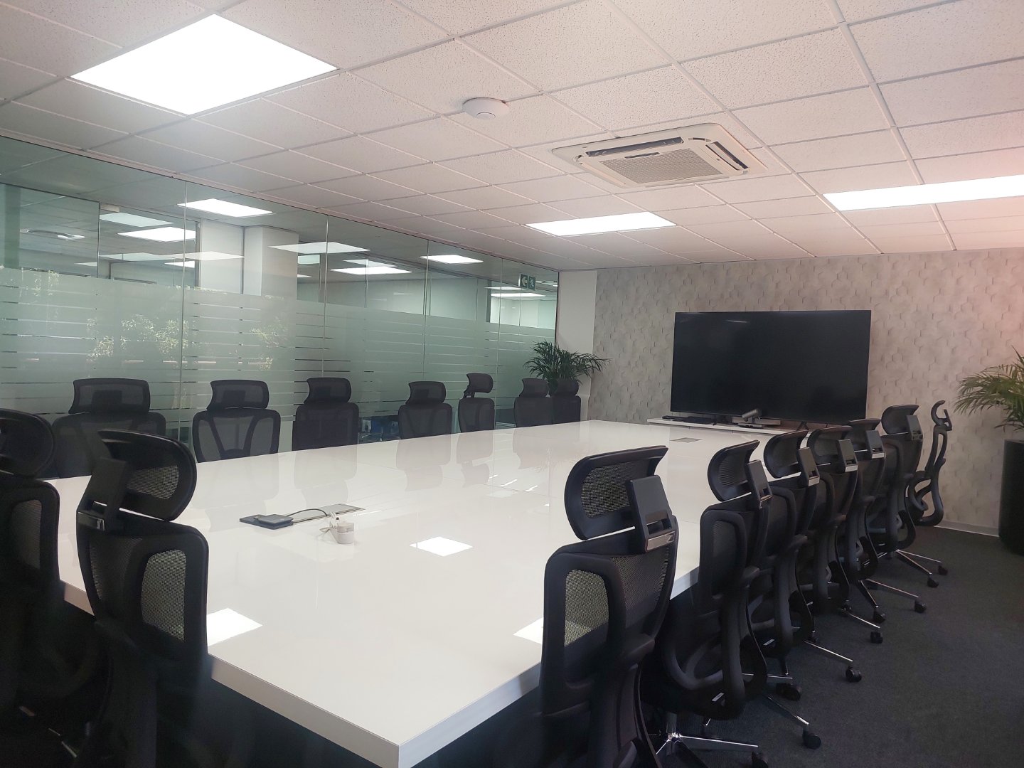 The office comprises eight private offices accommodating 13–15 staff members, as well as a large executive boardroom that comfortably seats up to 18 people. The boardroom is equipped with a large flat-screen TV, presentation equipment, and direct access to an entertainment balcony overlooking a serene lake surrounded by lush gardens and trees — the perfect setting for business meetings and informal gatherings. The space also includes LED lighting, shared kitchen and canteen facilities, and a welcoming reception area.