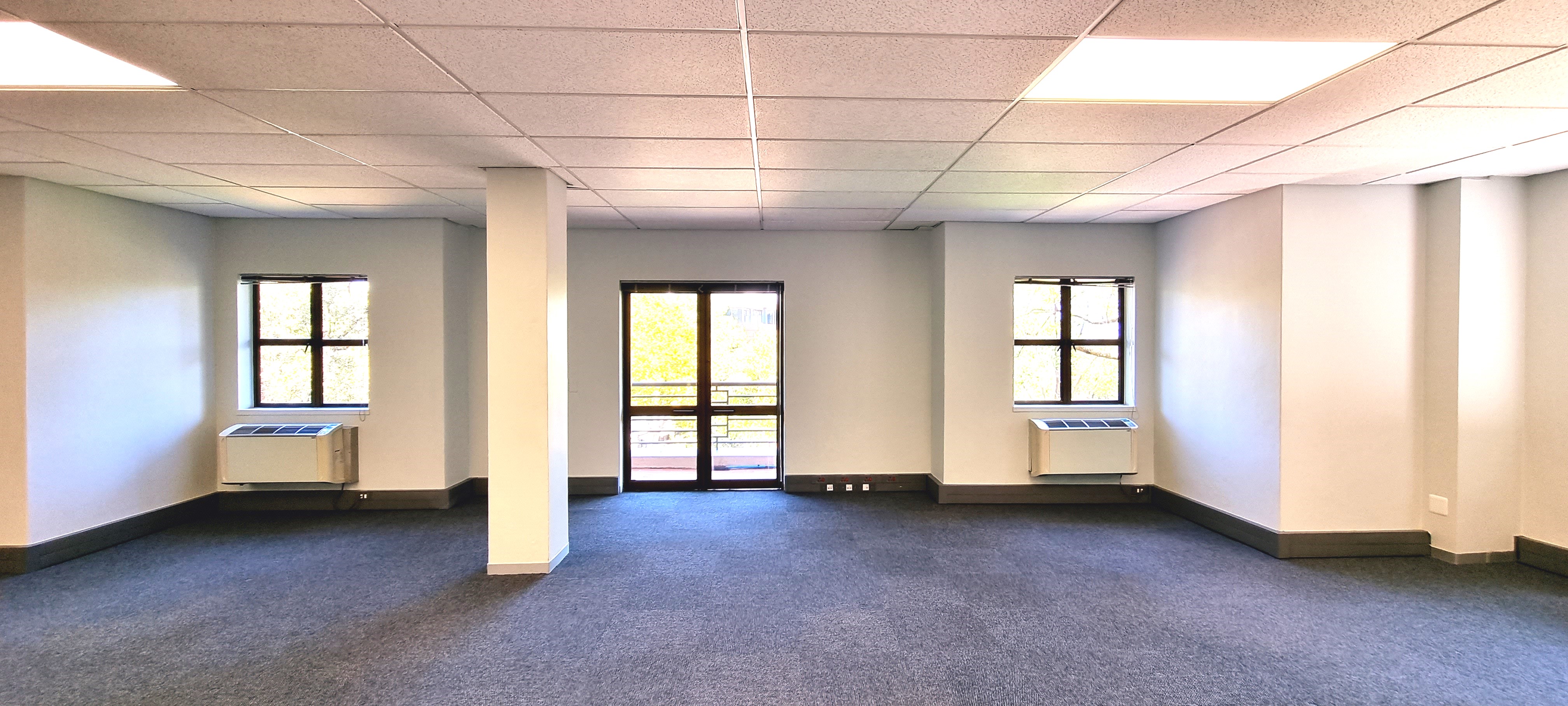 The office space features abundant glass and natural light, creating a bright and open atmosphere, while the spacious kitchen,