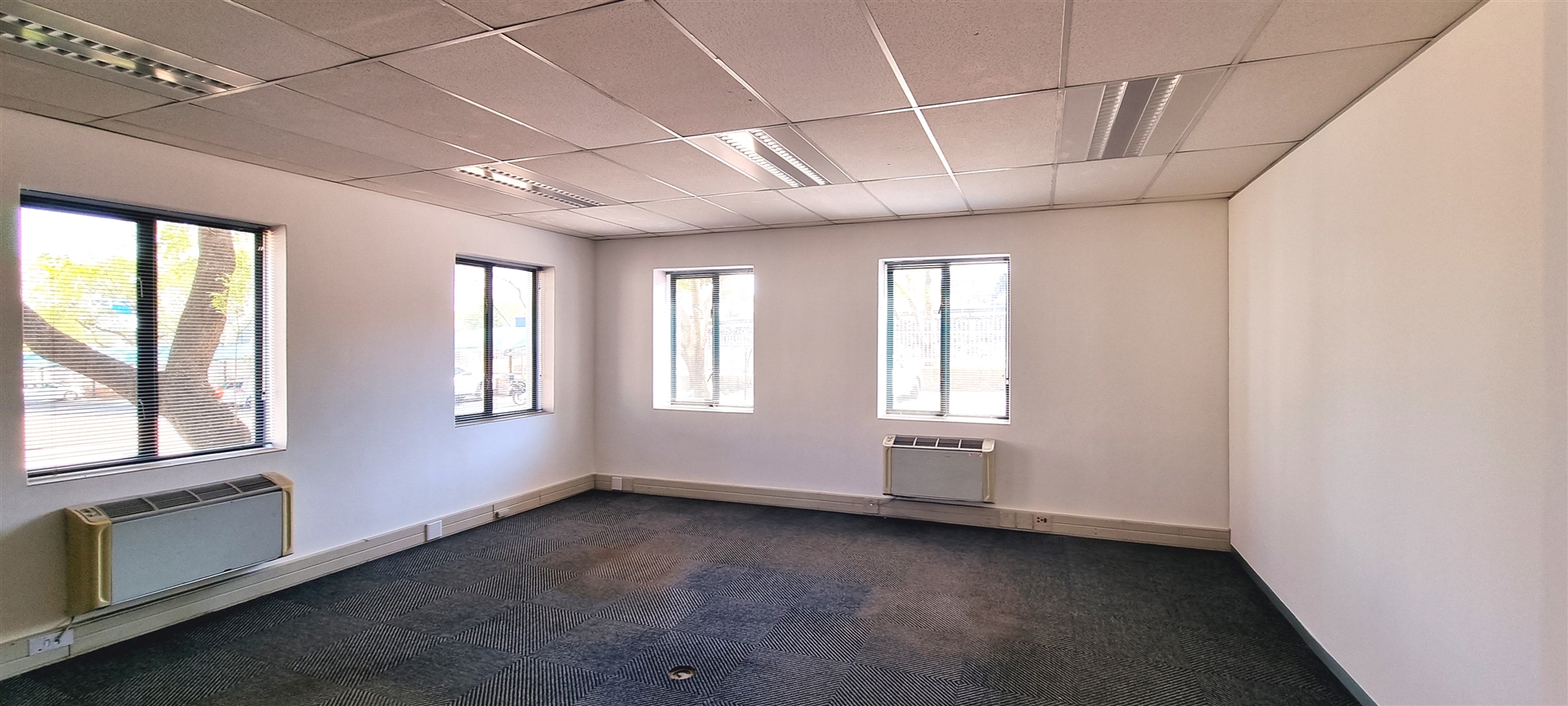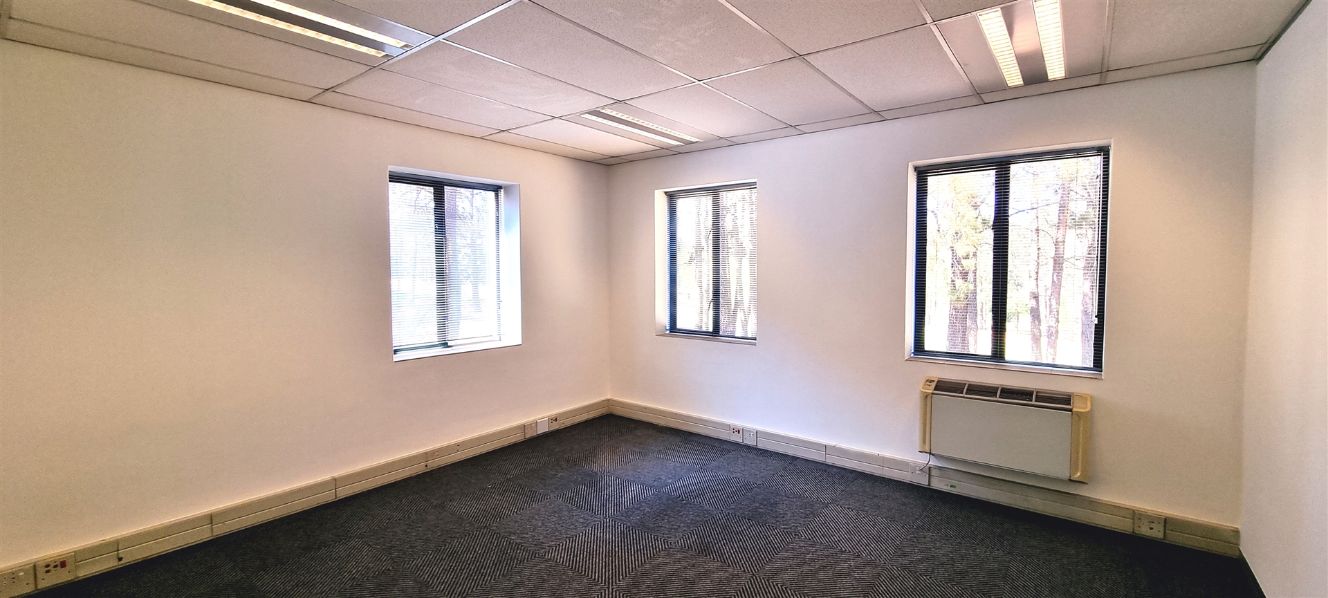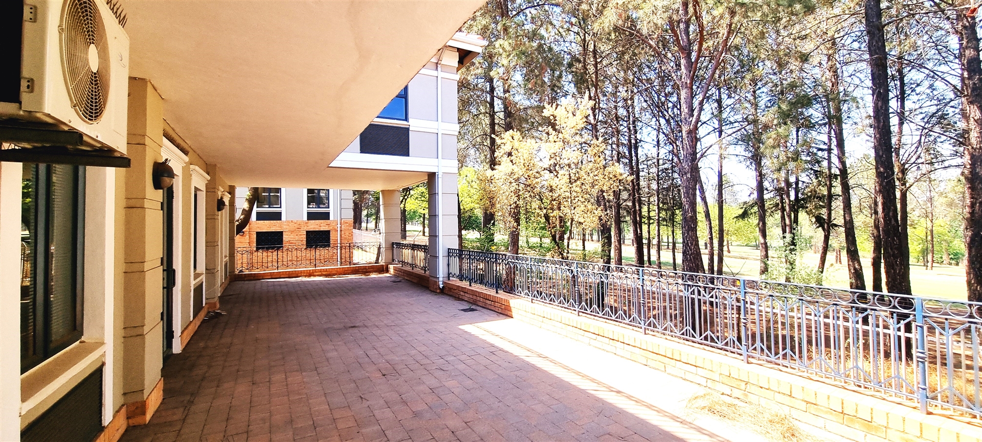 The secure office park is surrounded by well-established gardens, enhancing the professional yet tranquil atmosphere.