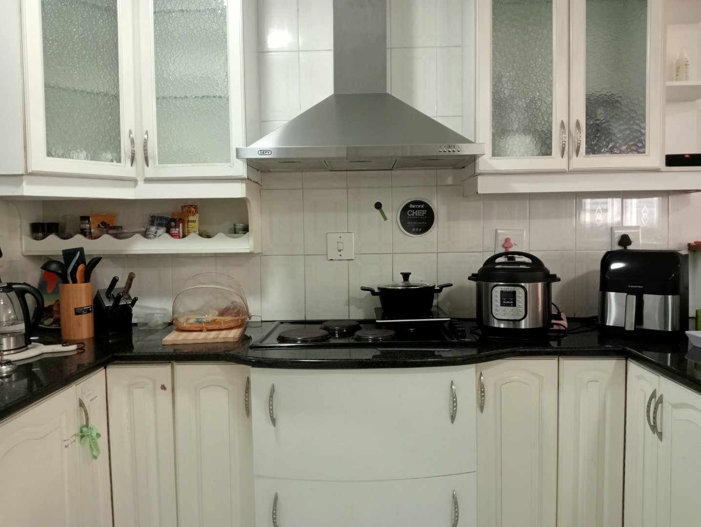 Fully fitted modern kitchen with granite countertops, double sink, ample cupboard space, built-in oven & stove with extractor