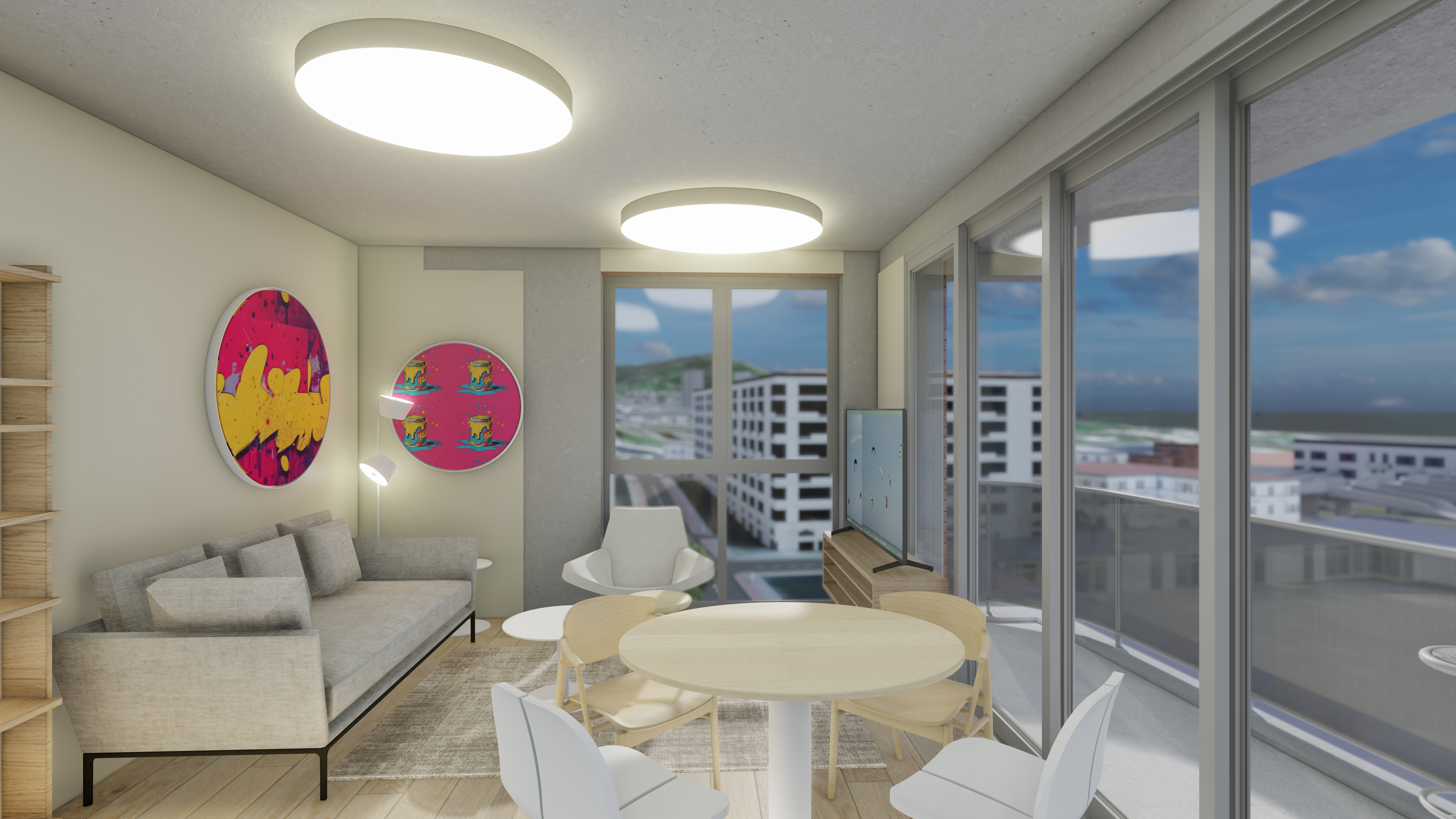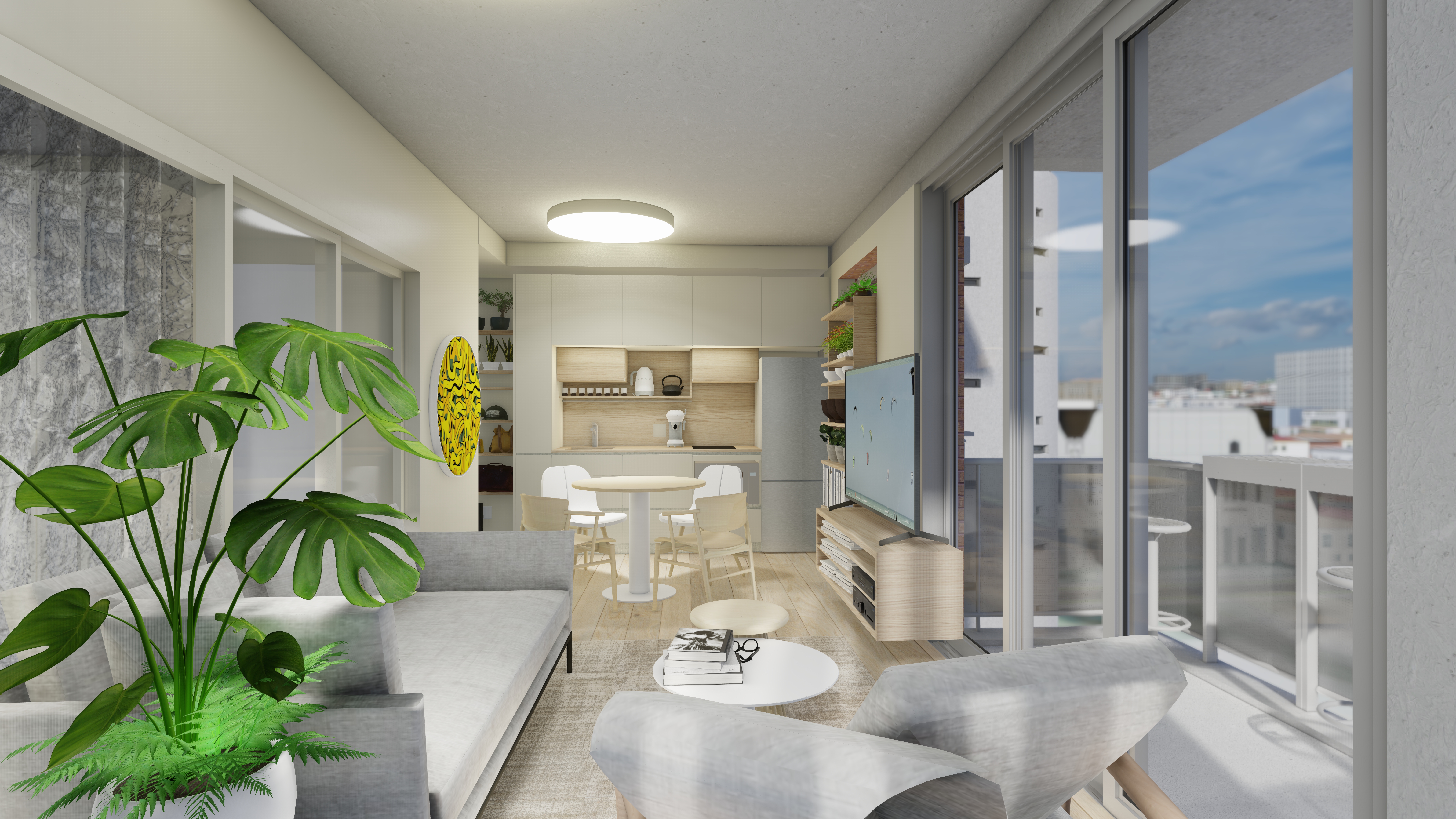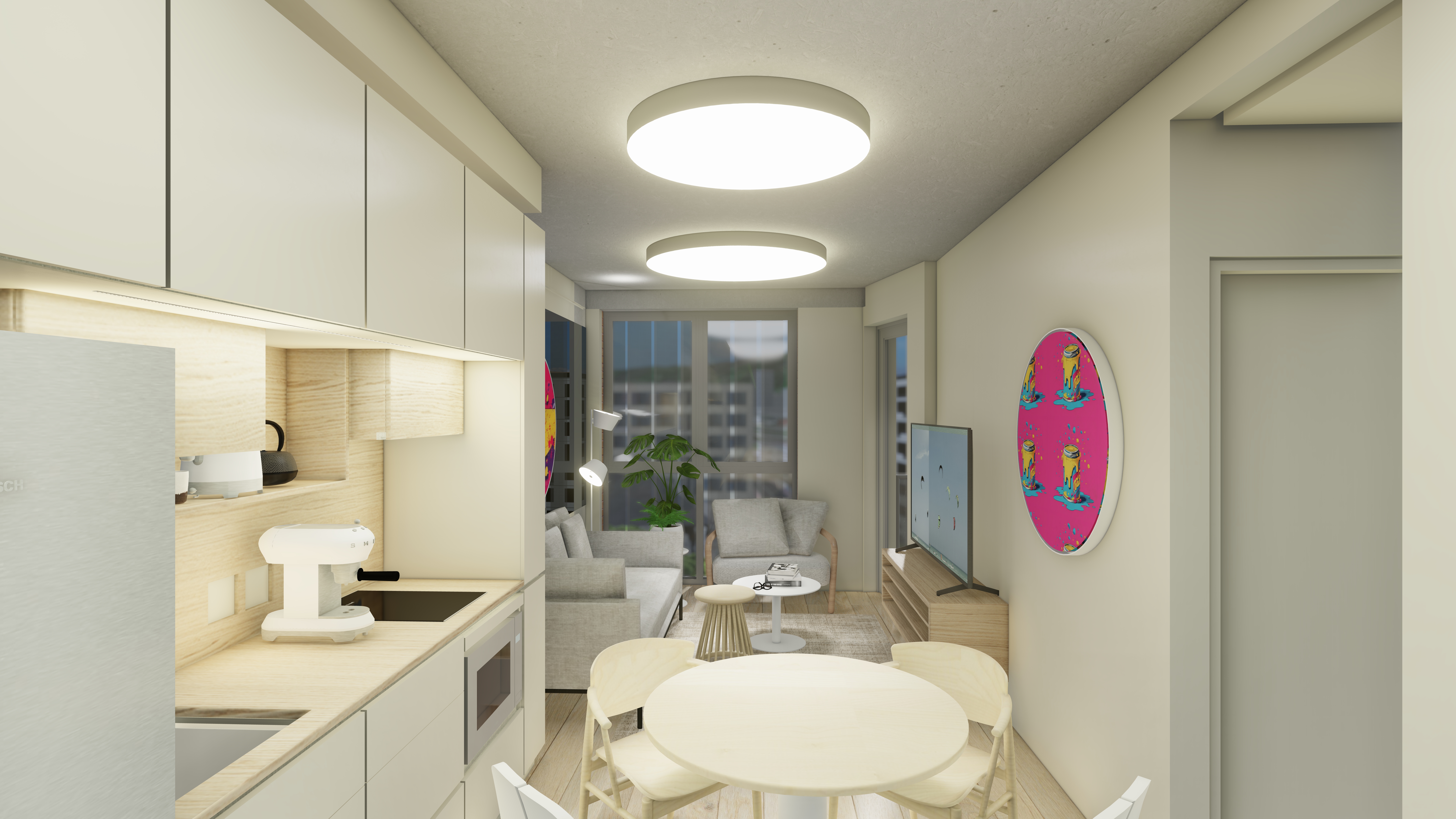 The unit has a white wooden front door with laminate or vinyl flooring throughout. There are exposed concrete soffit and bulkheads with shadow line cornice in living areas.