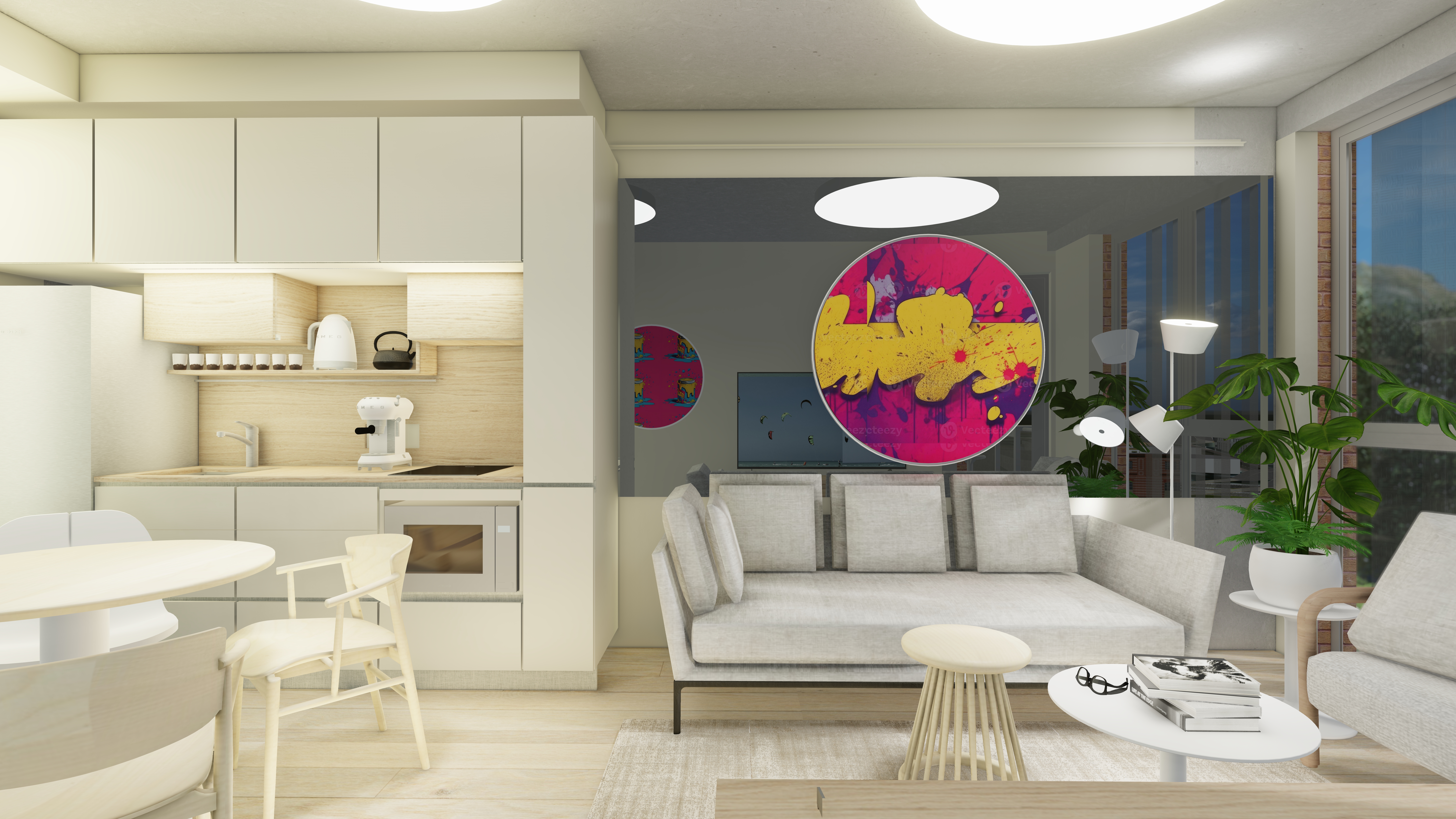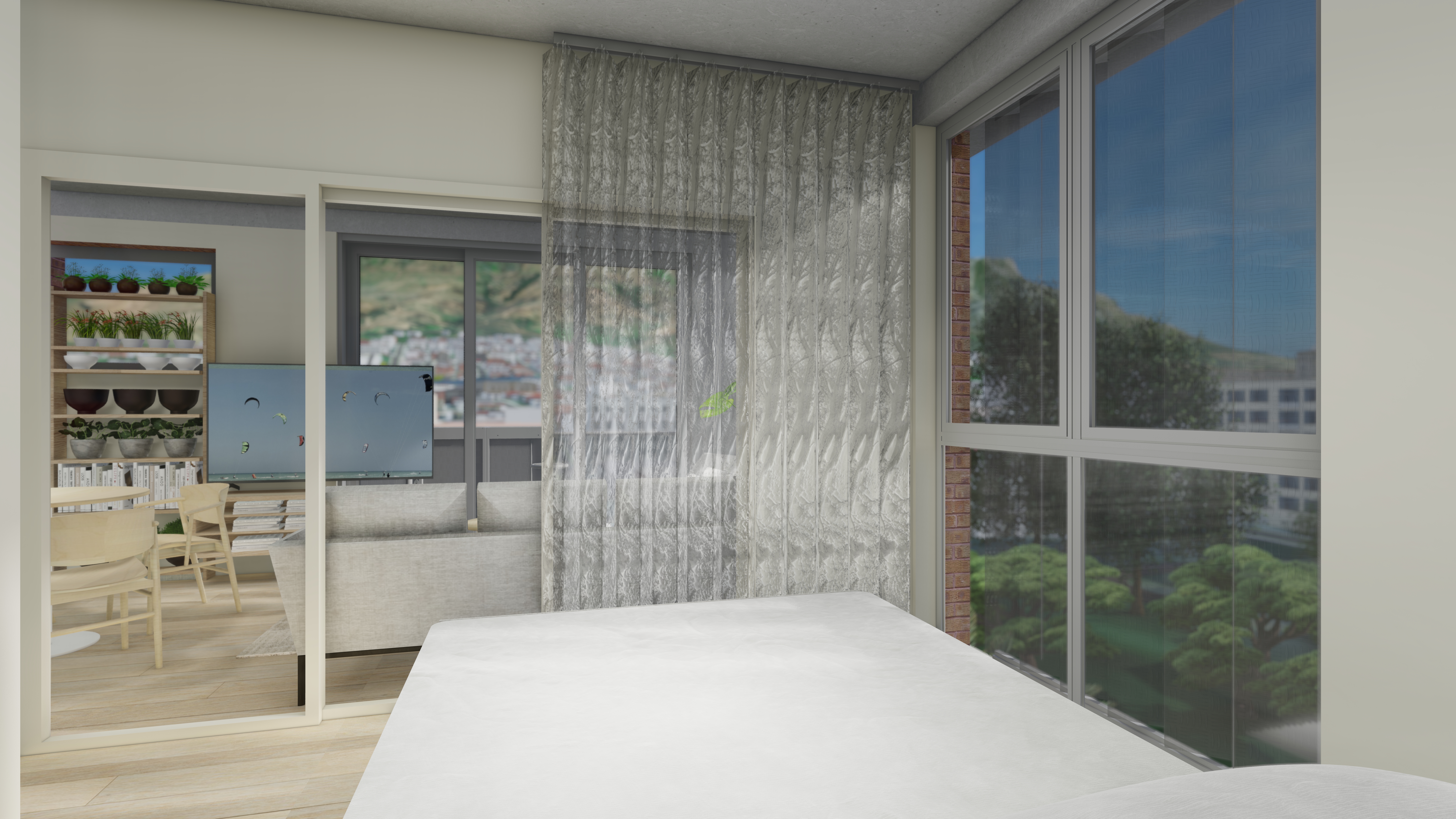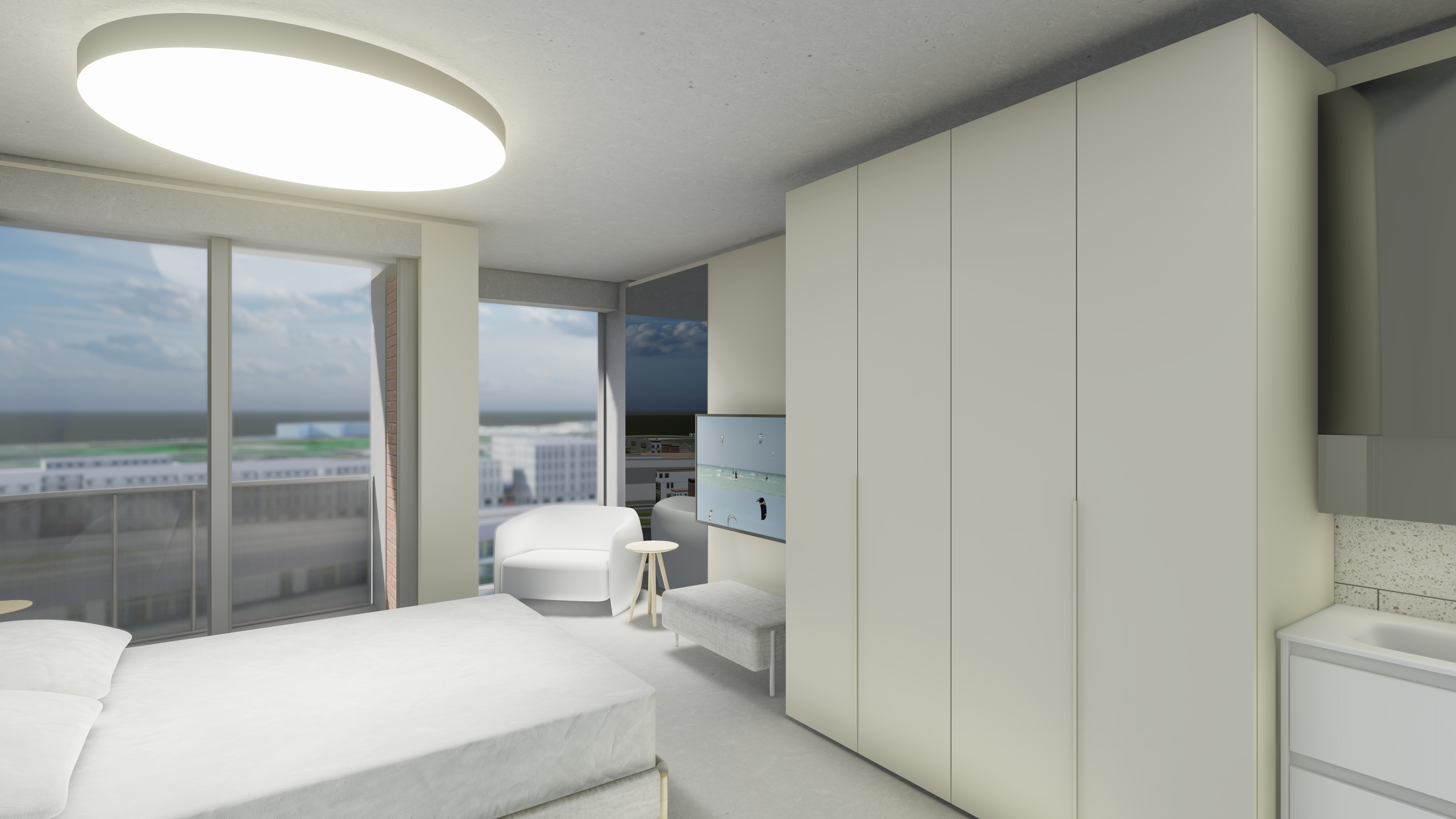 The unit has a white wooden front door with laminate or vinyl flooring throughout. There are exposed concrete soffit and bulkheads with shadow line cornice in living areas.