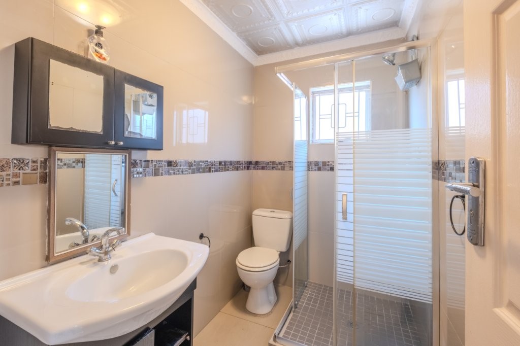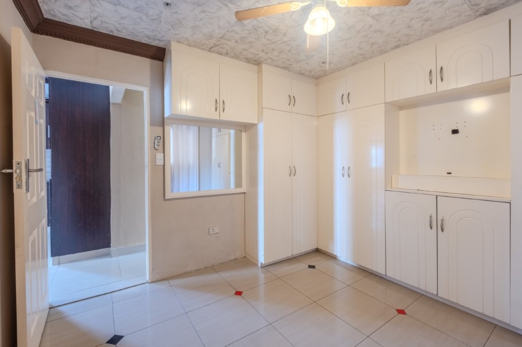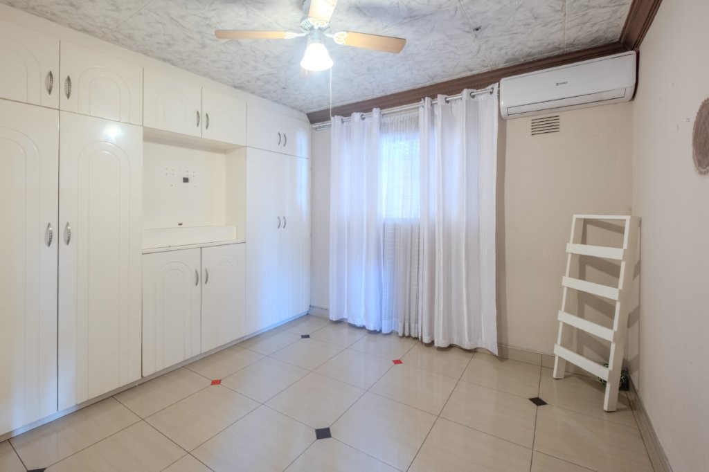 The air-conditioned main bedroom is a true retreat, complete with built-in cupboards, a private en-suite bathroom, and an additional space that can serve as a dressing room or home office. Glass sliding doors open directly onto the poolside area, offering seamless indoor-outdoor living.