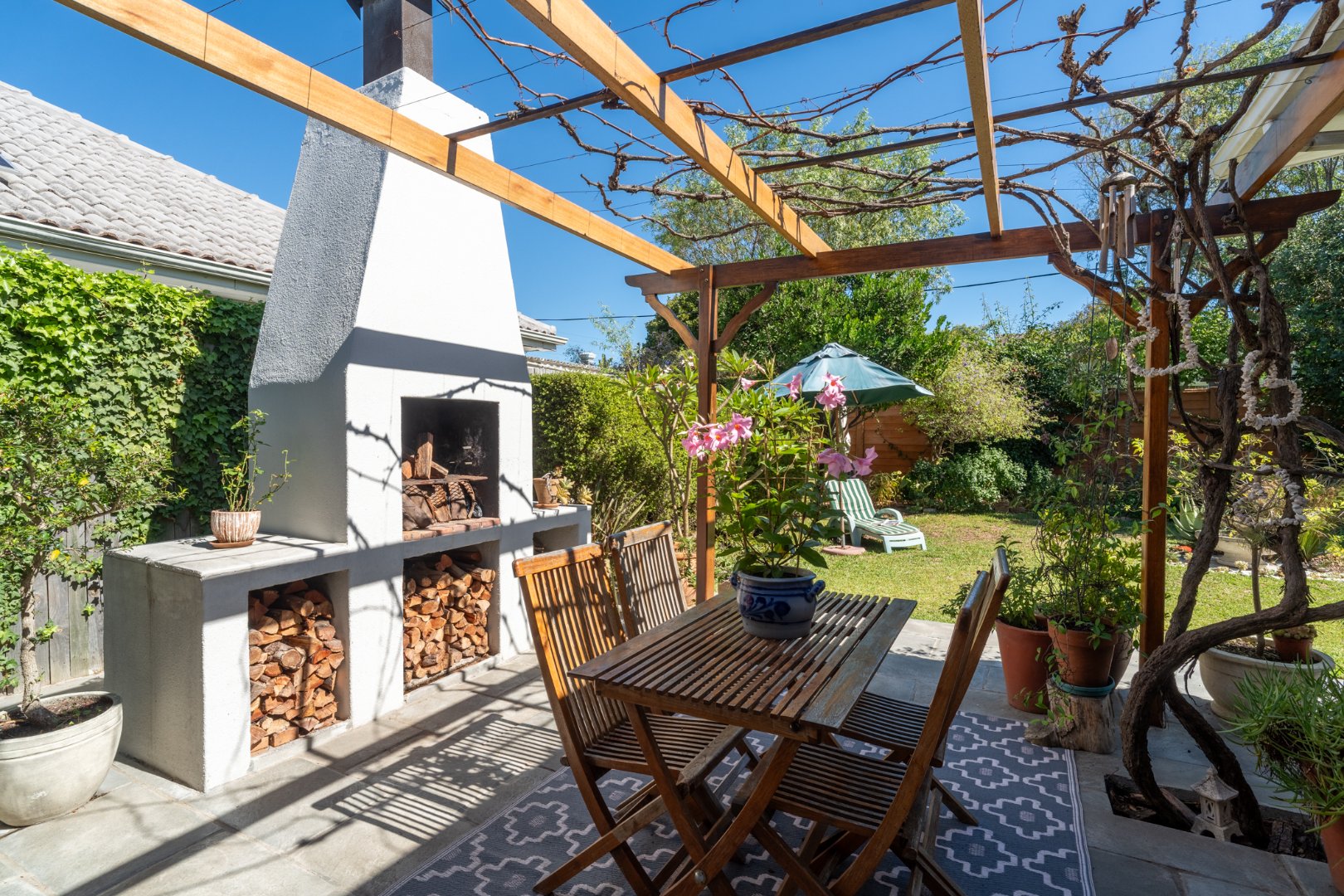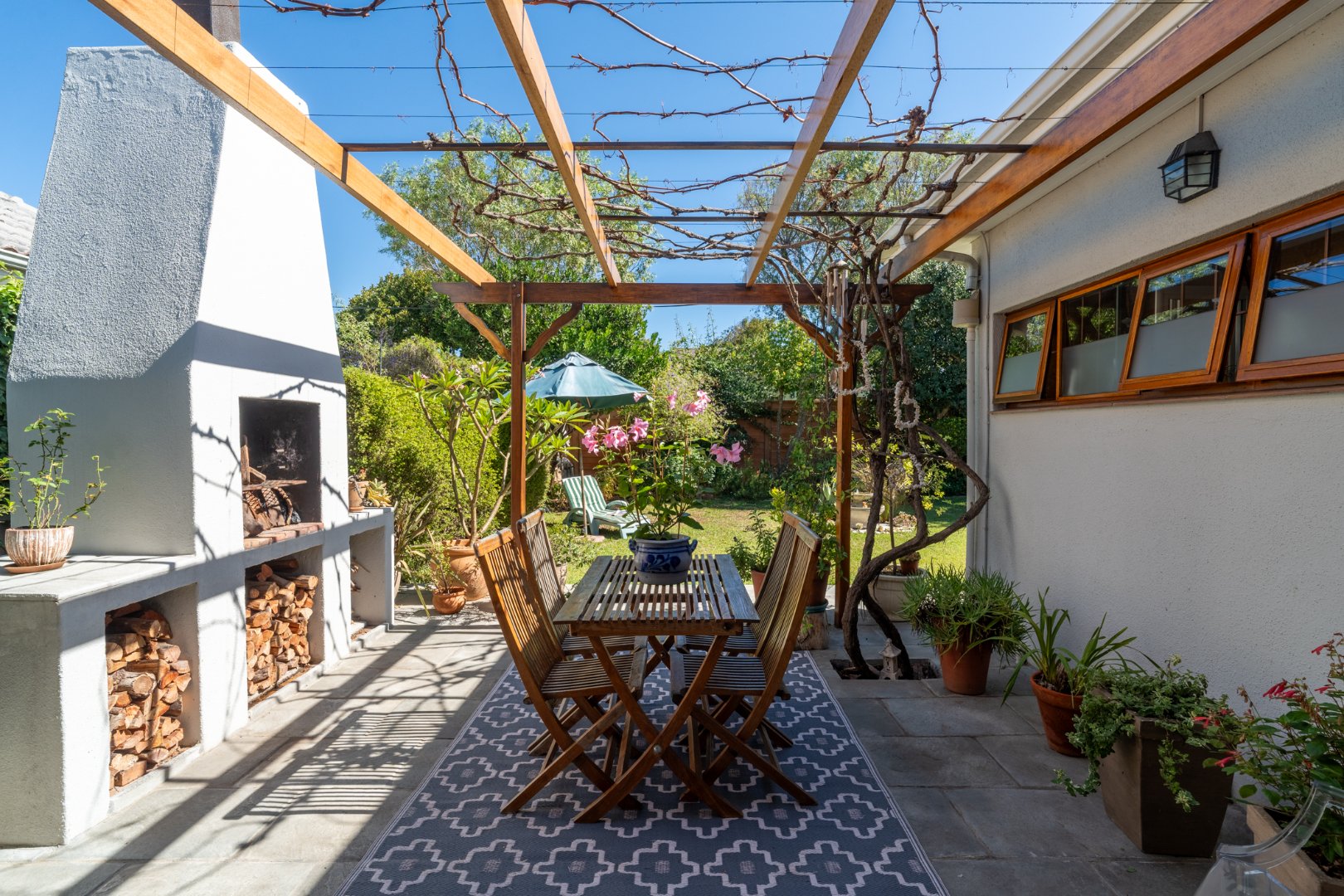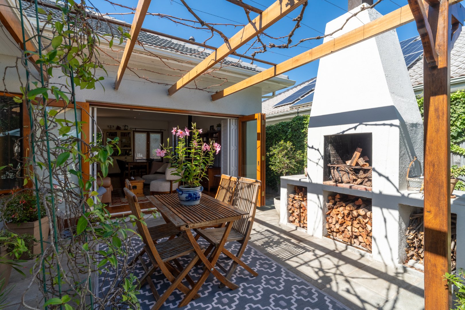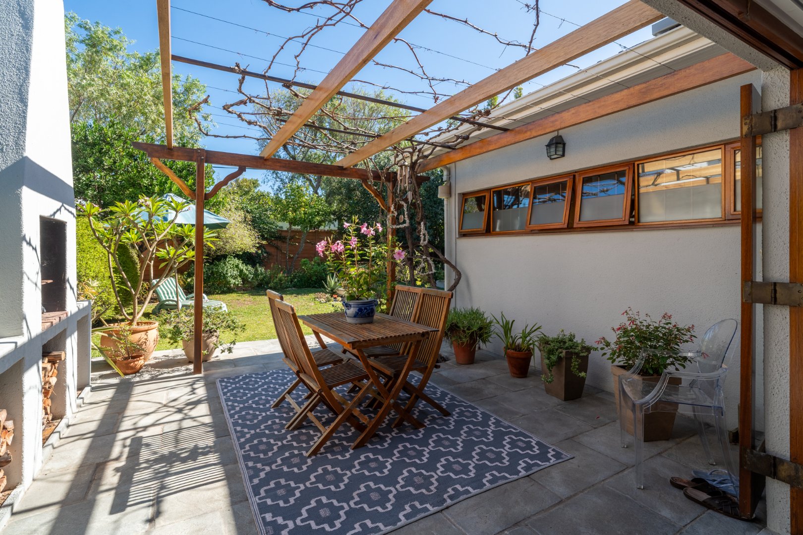 Sunlight streams in through shuttered stack-back doors, opening to a North-facing courtyard where a vine-covered pergola and built-in braai invite relaxed, joyful gatherings. It's a space where stories are shared in more ways than one.