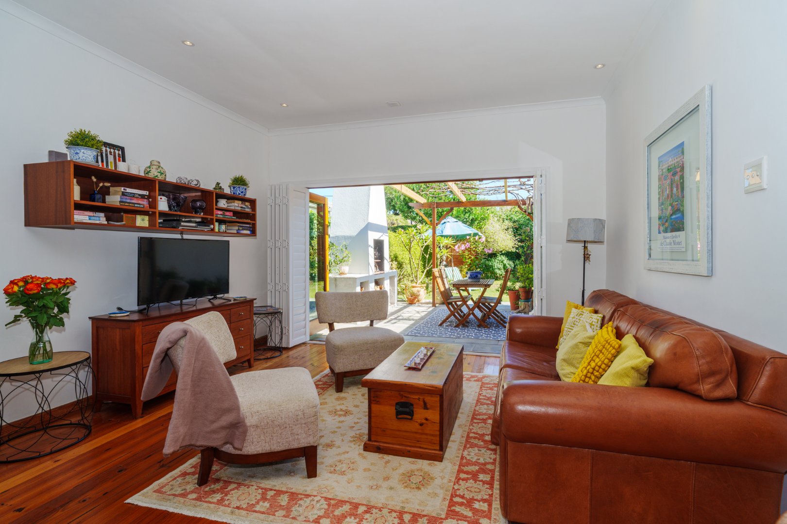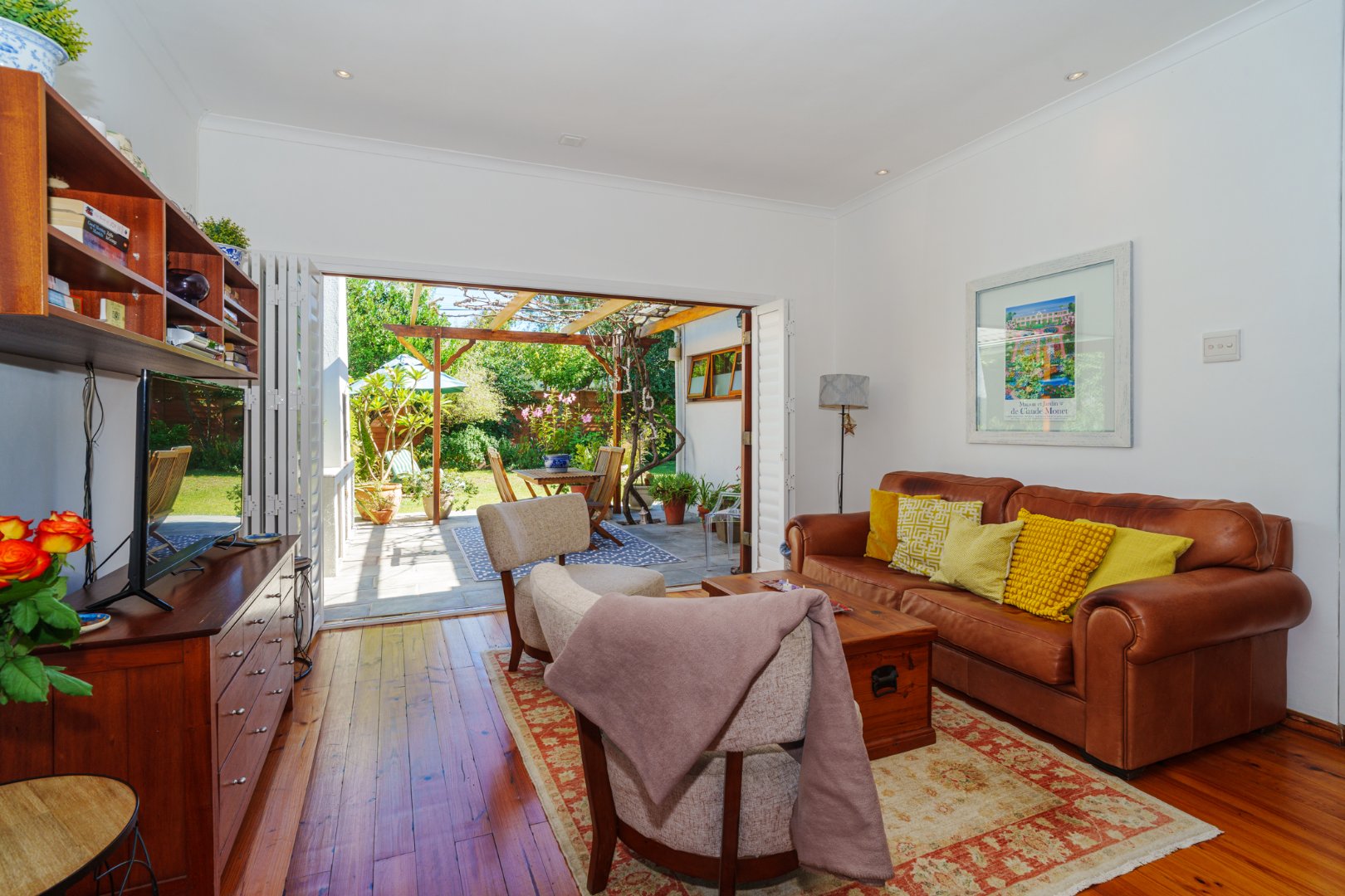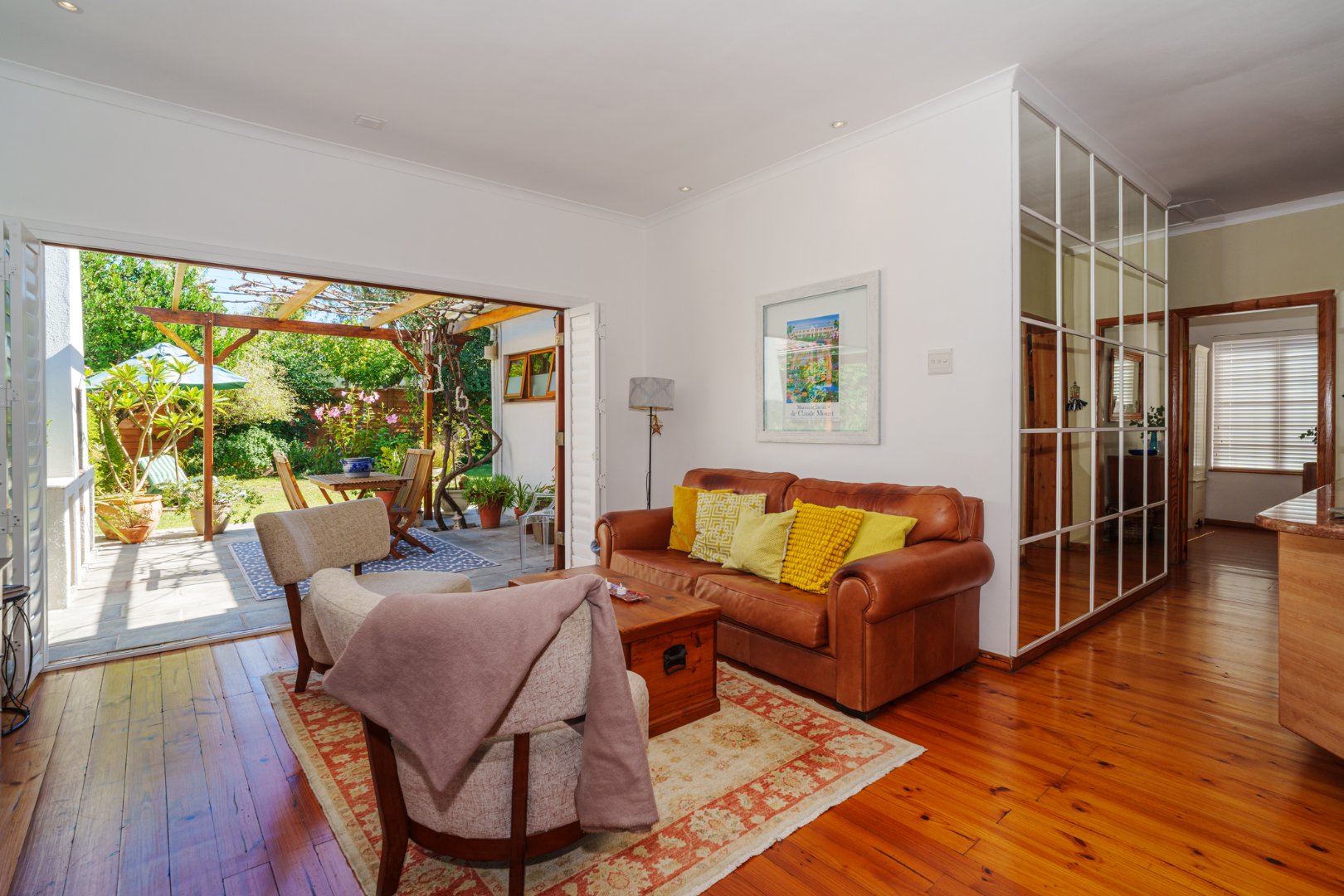 Sunlight streams in through shuttered stack-back doors, opening to a North-facing courtyard where a vine-covered pergola and built-in braai invite relaxed, joyful gatherings. It's a space where stories are shared in more ways than one.