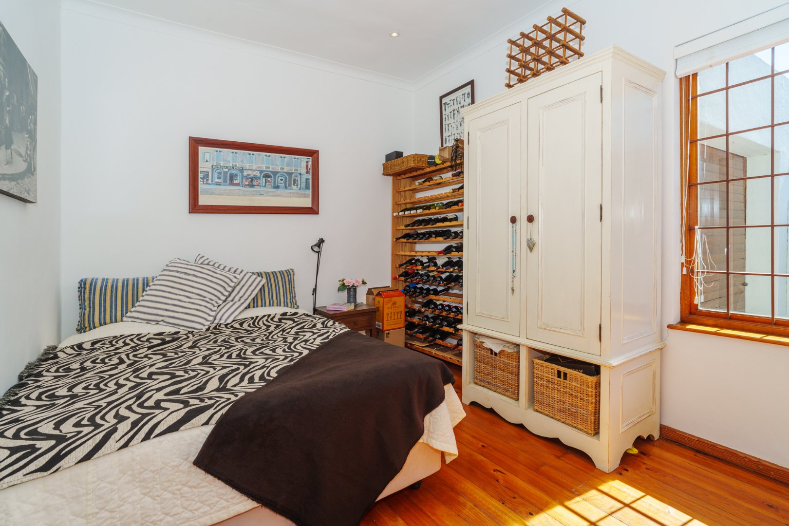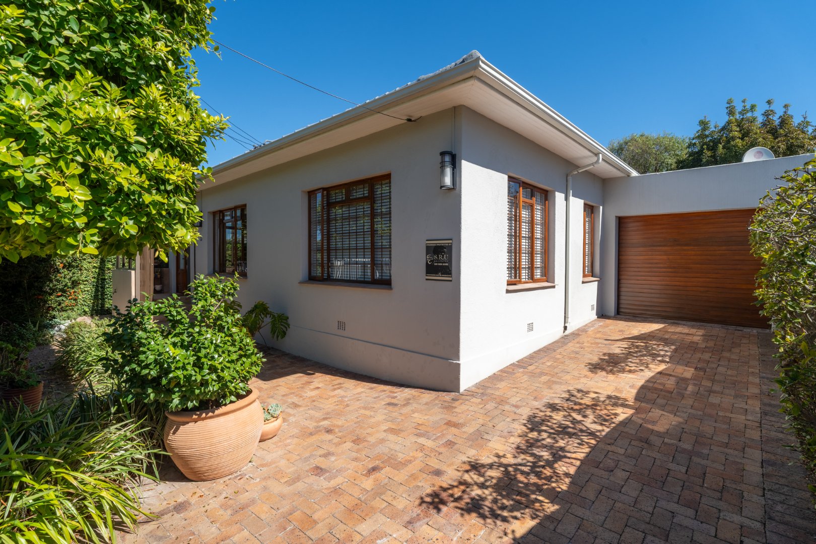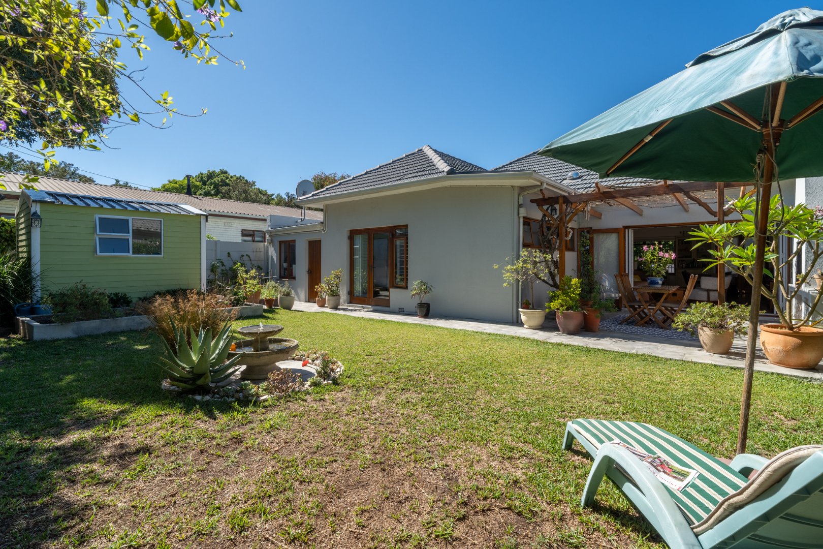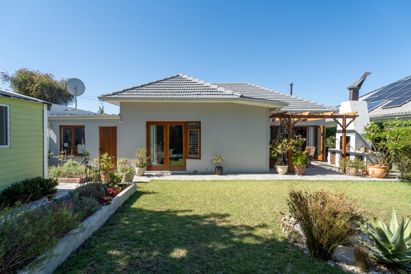 Sunlight streams in through shuttered stack-back doors, opening to a North-facing courtyard where a vine-covered pergola and built-in braai invite relaxed, joyful gatherings. It's a space where stories are shared in more ways than one.