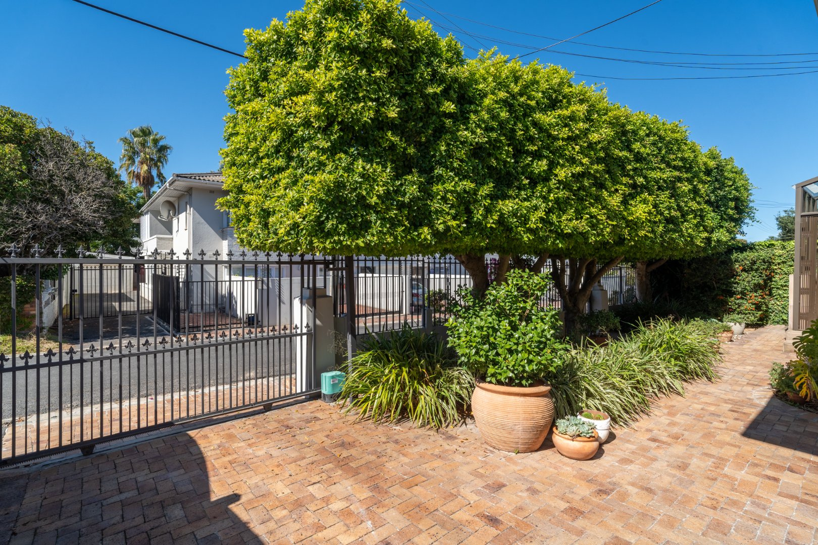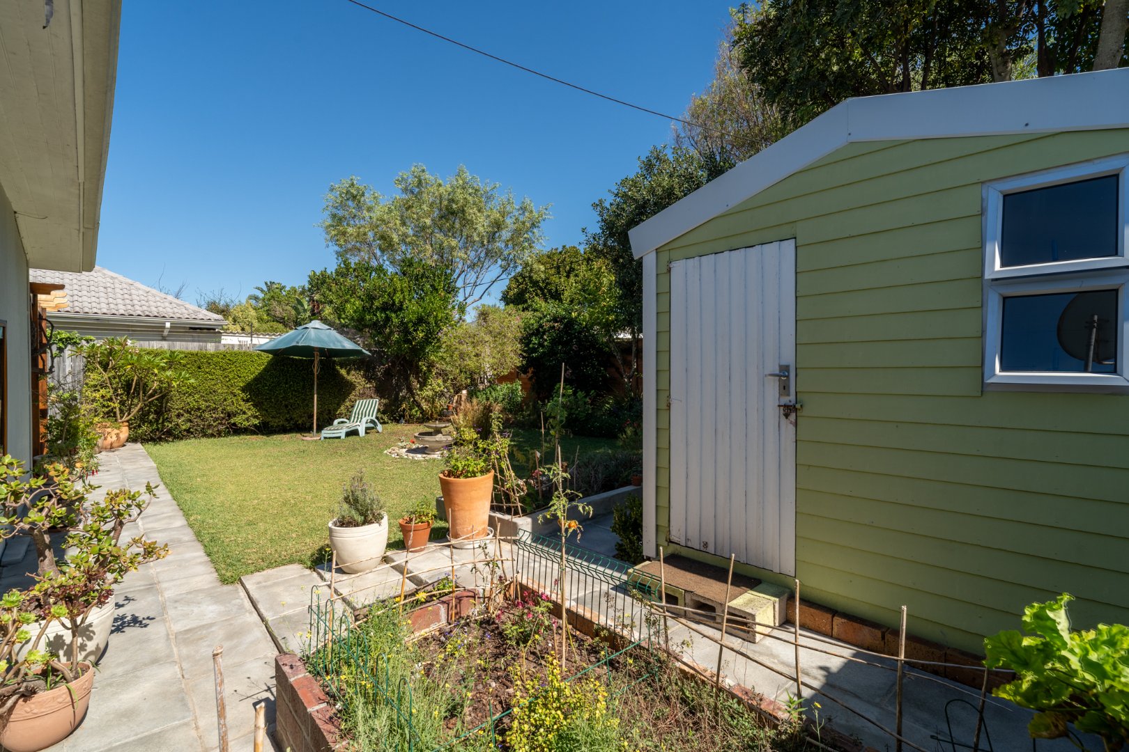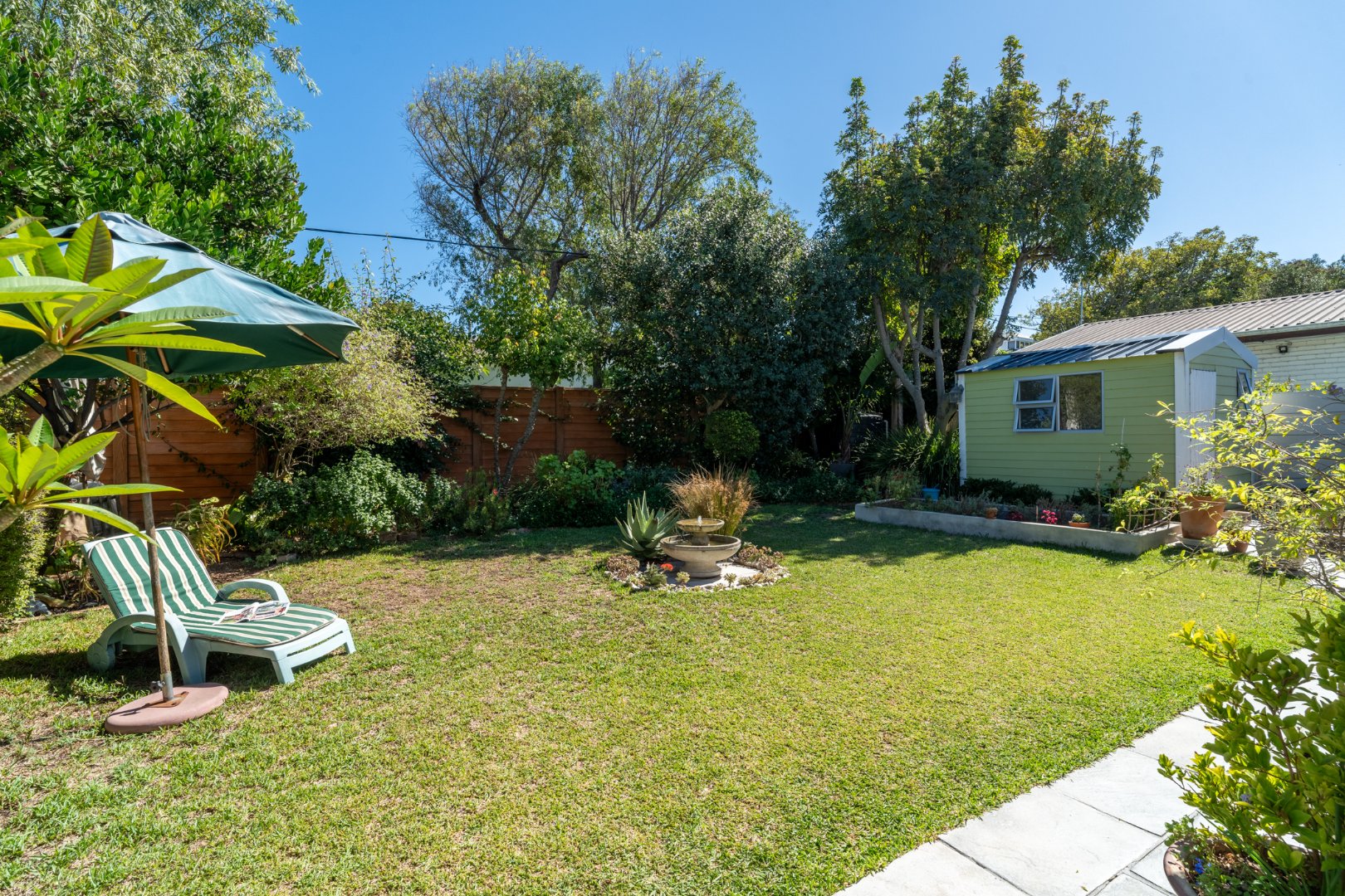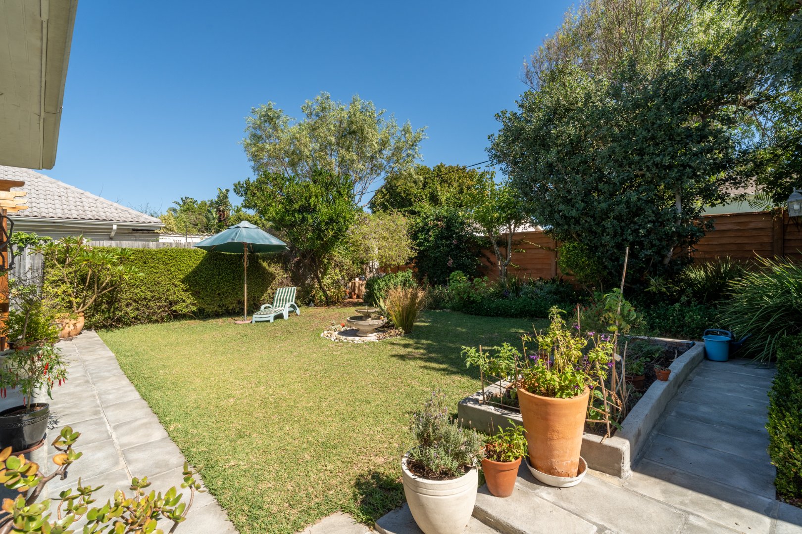A well camouflaged 2,500 litre water storage tank connected to and filled by the water run from the gutters provides a good source of back-up water supply and being connected to the irrigation allows for ease of irrigating the lush garden.