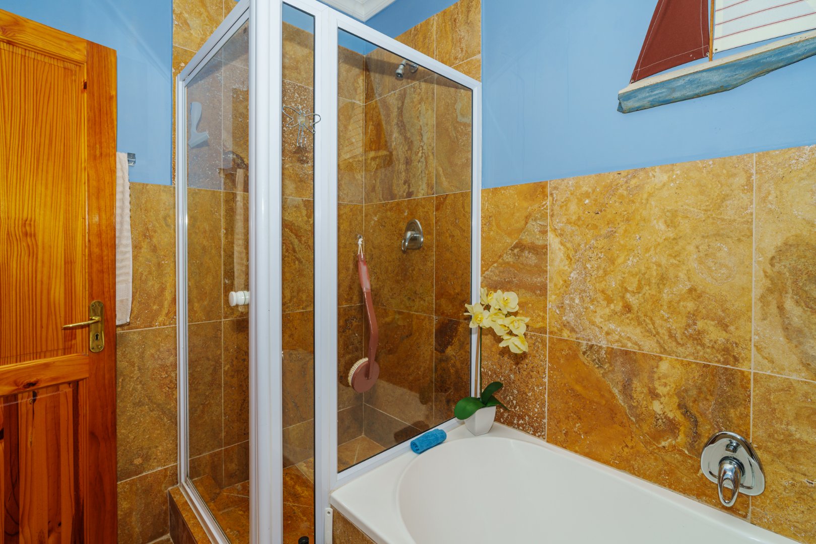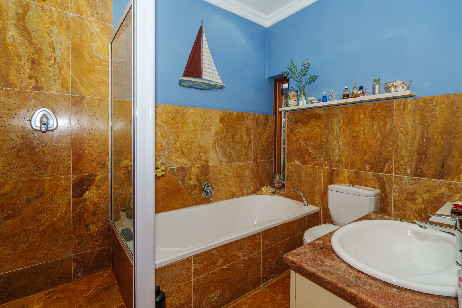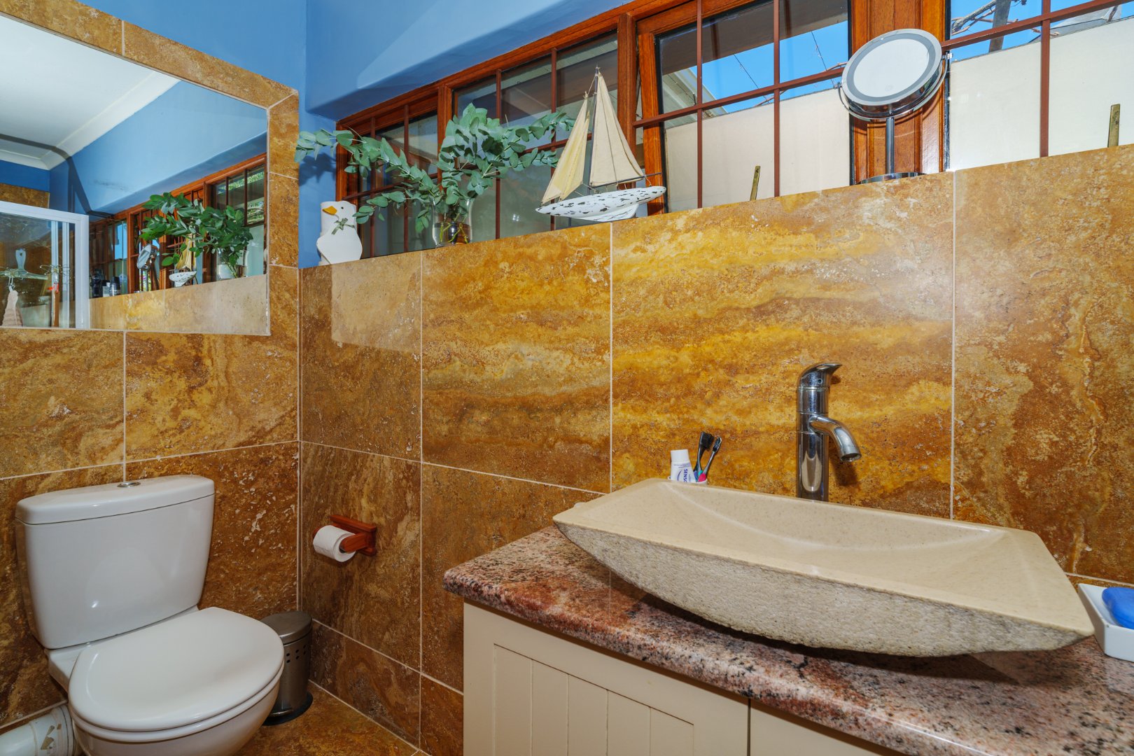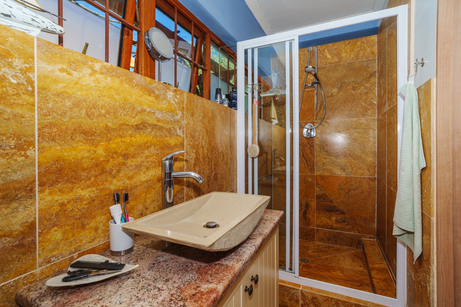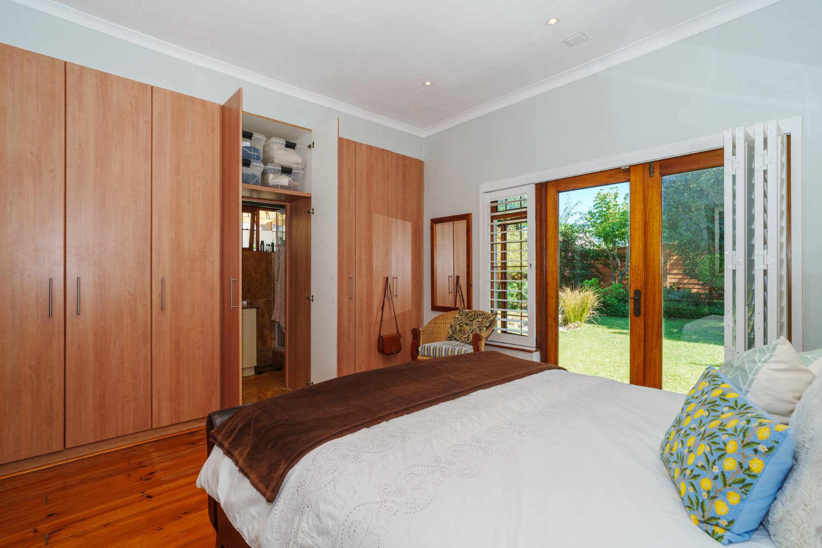 Double-glazed wooden windows in the main bedroom and en-suite create an energy-efficient, peaceful retreat. Security is thoughtfully covered with burglar bars, perimeter fencing, electric fencing, and a robust alarm system.