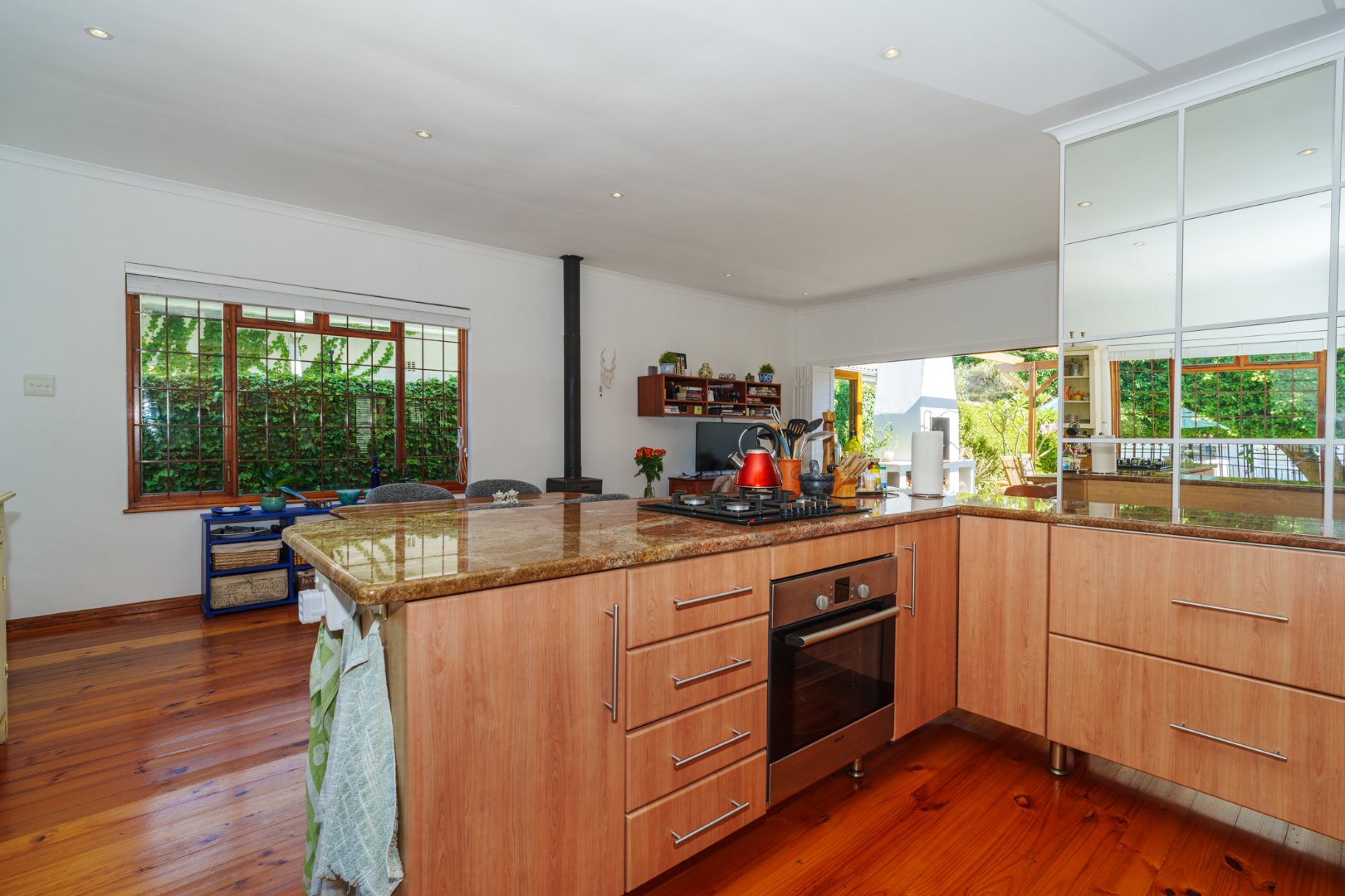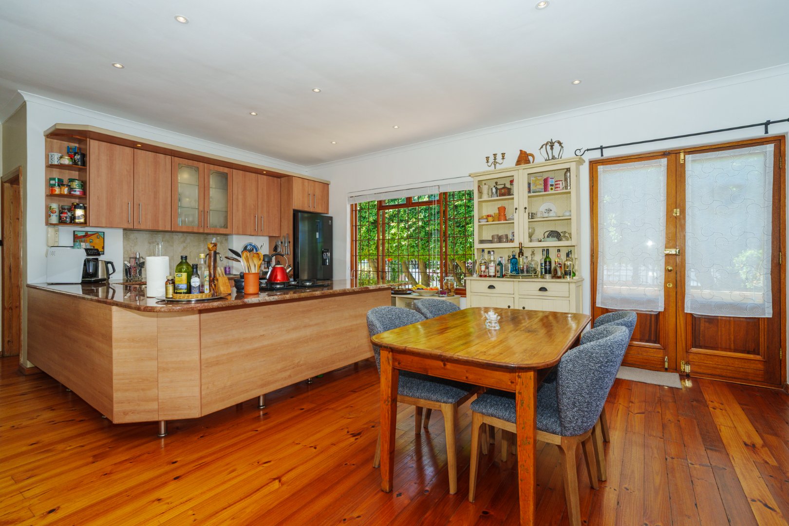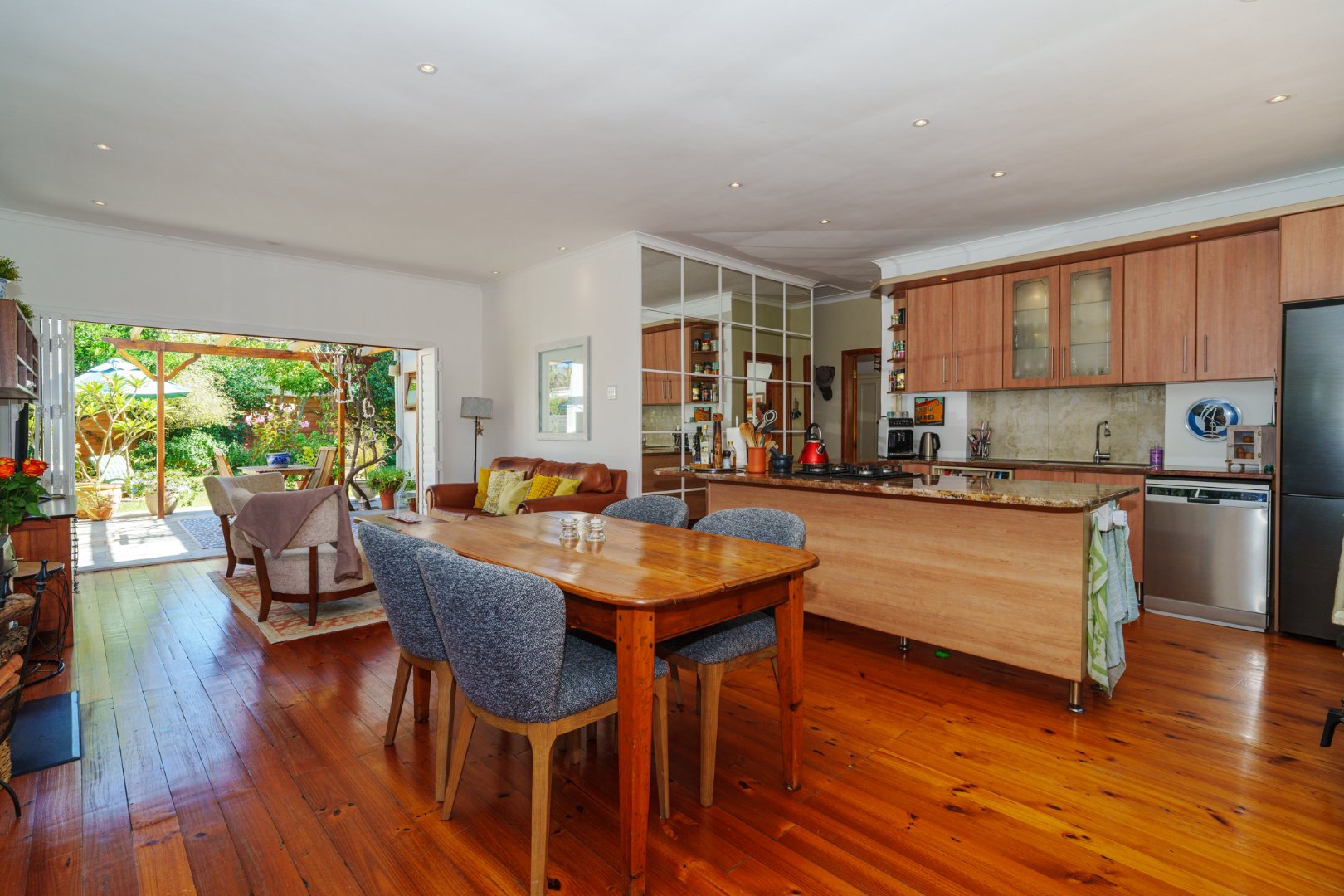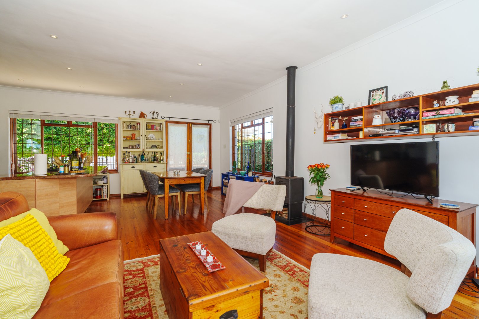 Set on a generous 446 sqm erf, the home welcomes you with rich Oregon Pine floors underfoot and an open-plan kitchen, dining, and lounge that flows with ease—perfect for visual connection and communal living. Every space is thoughtfully laid out, echoing the clarity and warmth we value in every home.