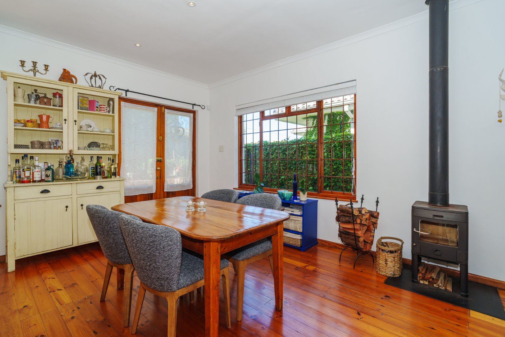 In winter, a cast-iron wood-burning fireplace keeps the heart of the home warm—no matter the weather.