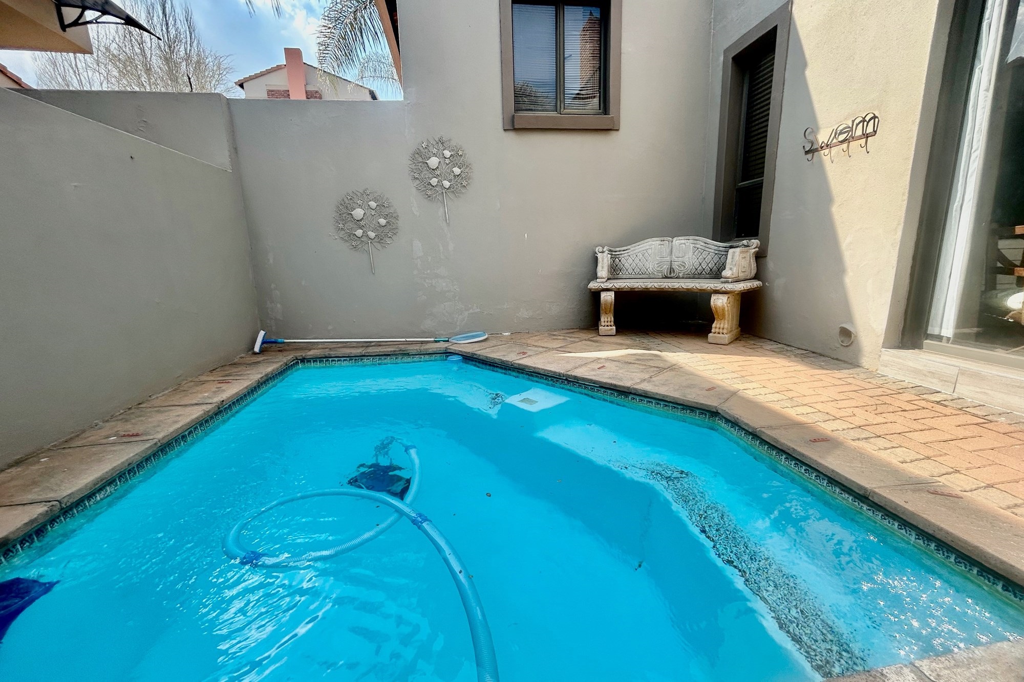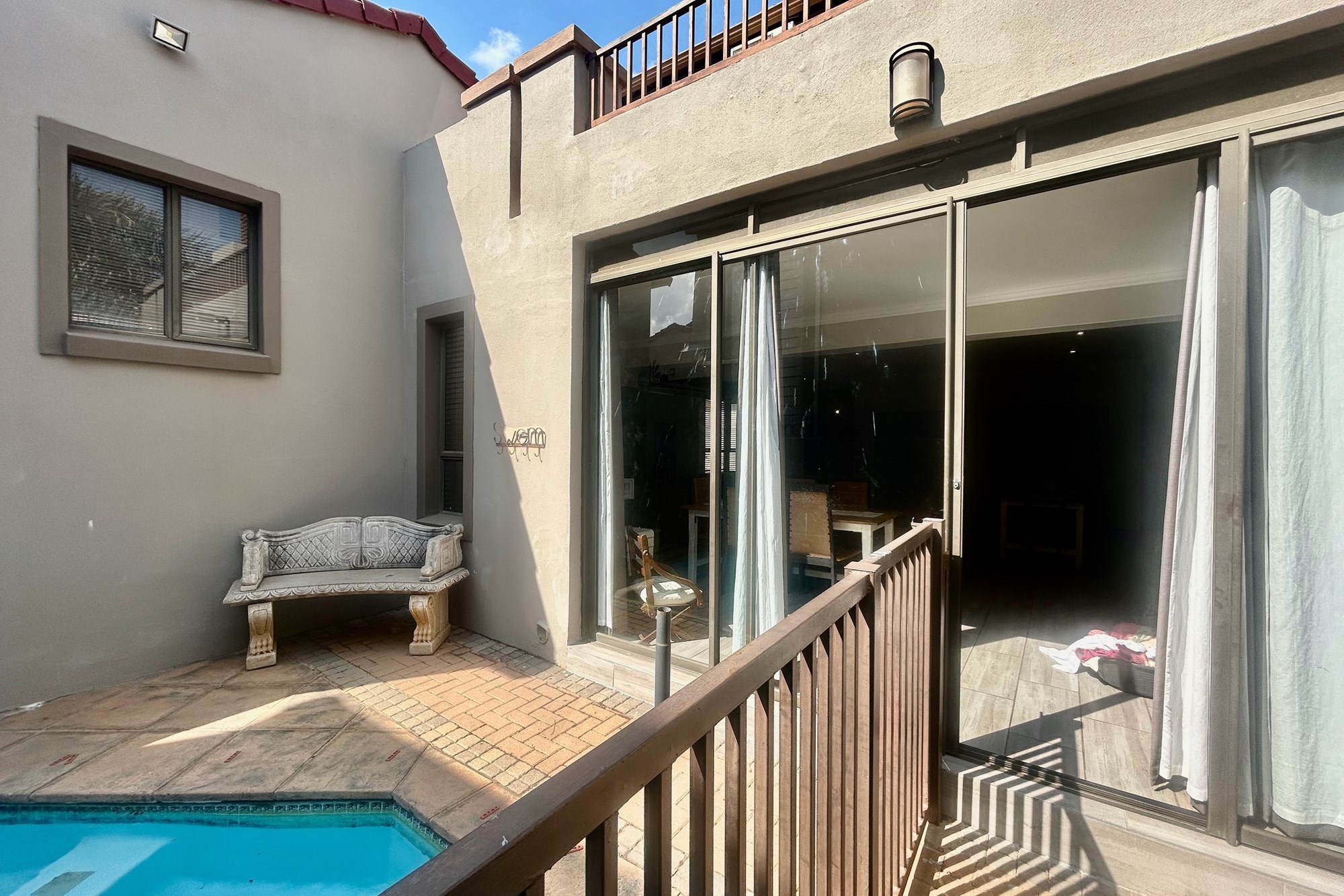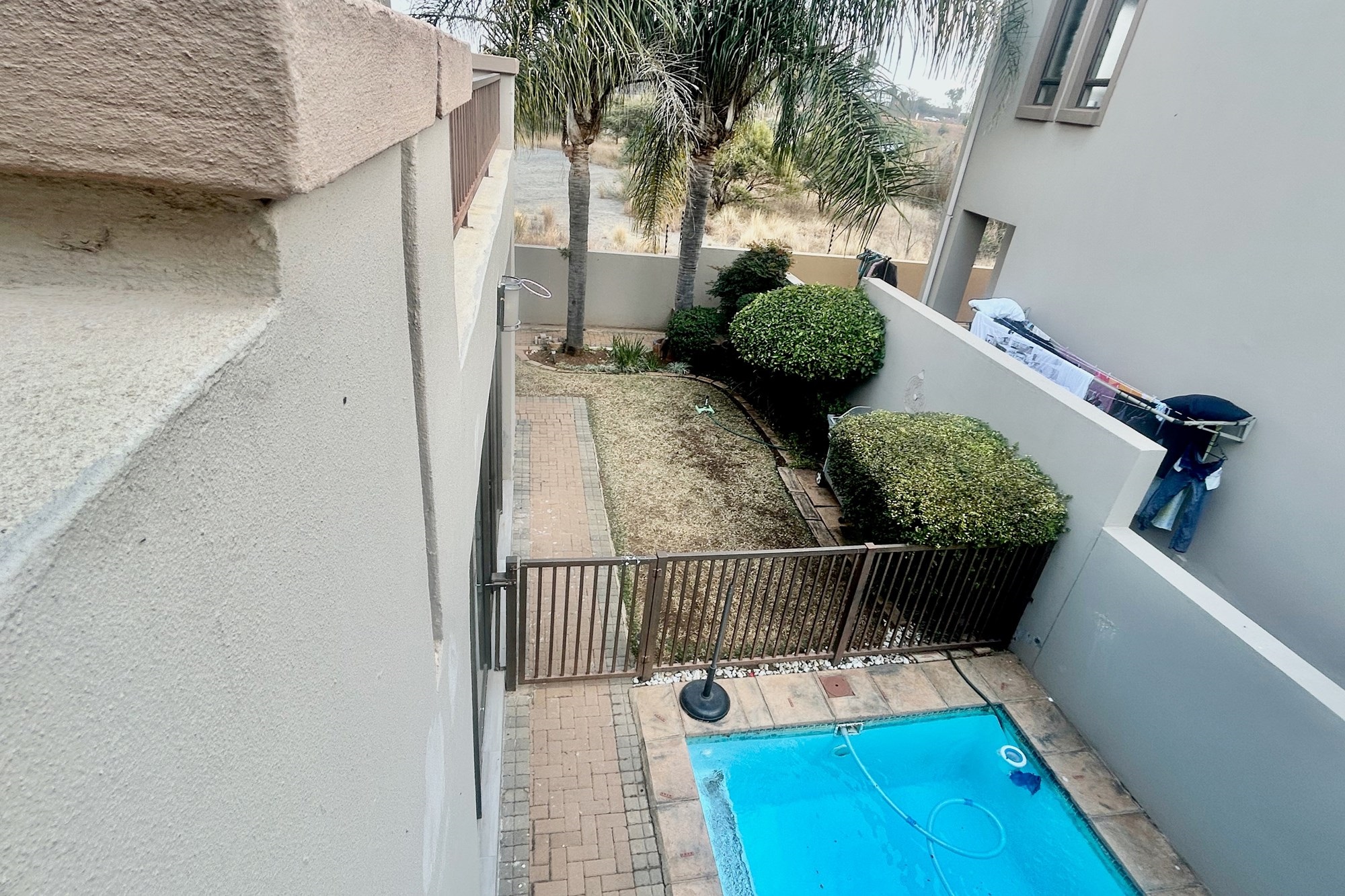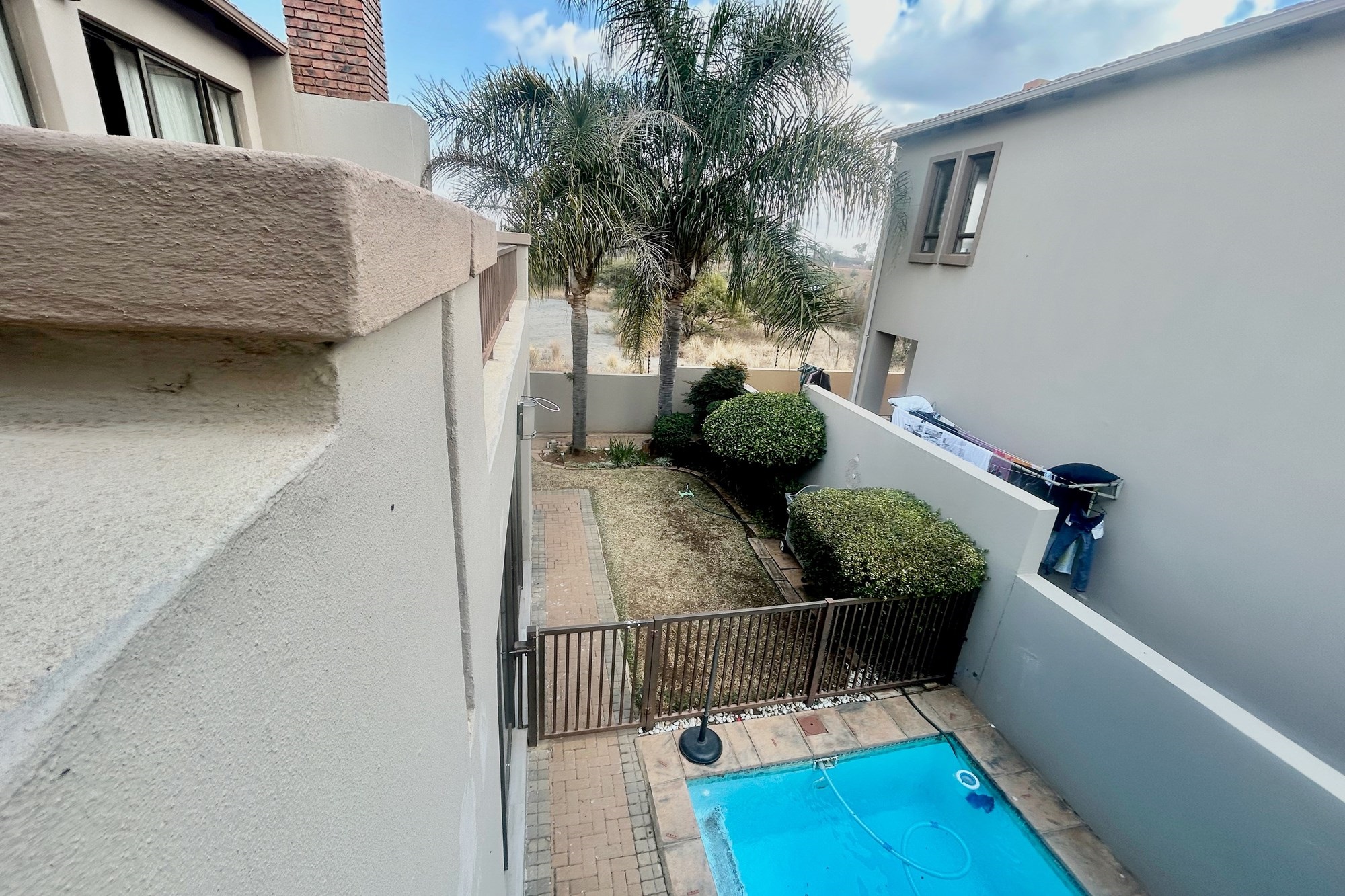 All three bedrooms walks out on a lovely big balcony overlooking the private garden with splash pool and braai-areas.
