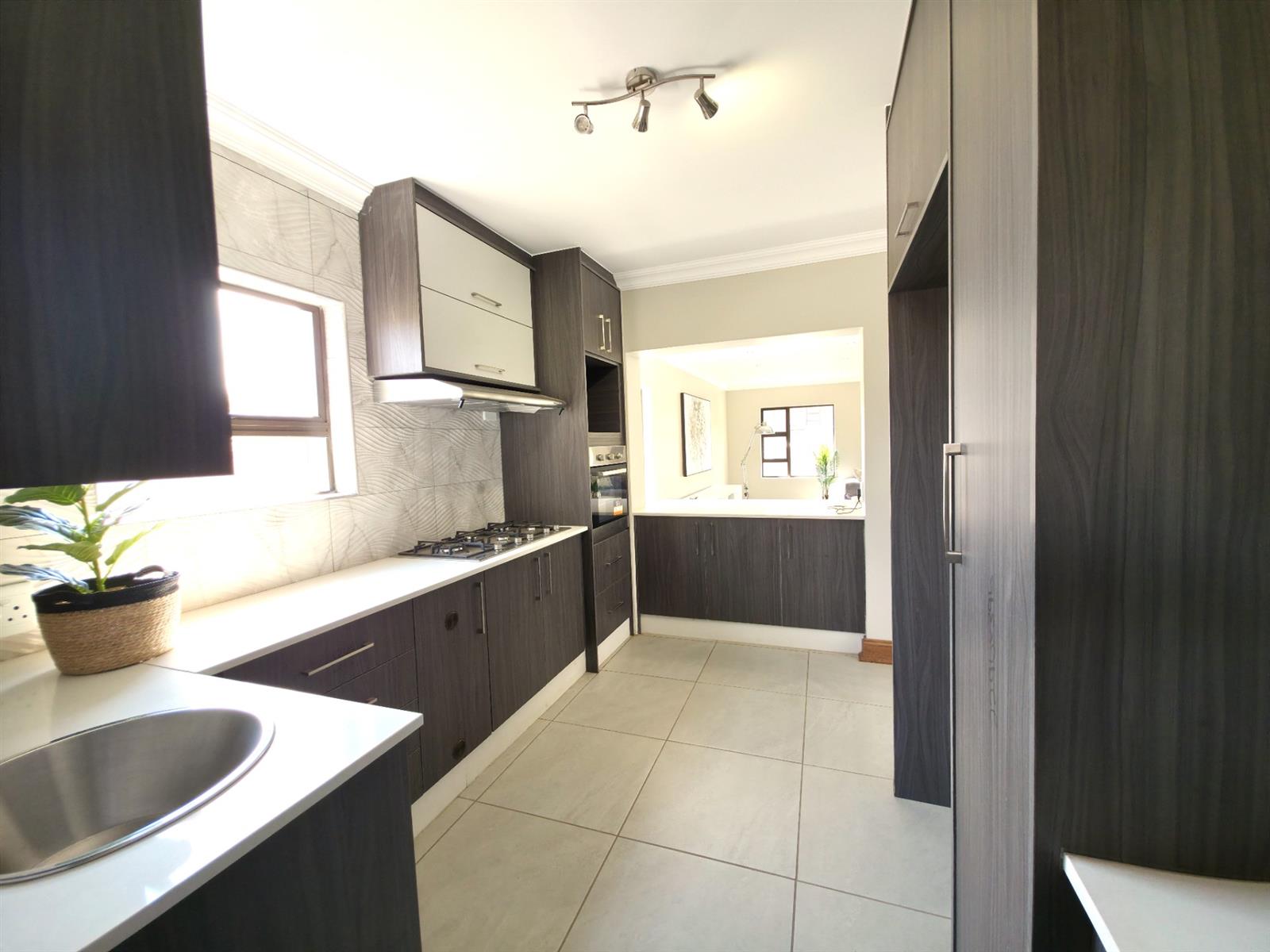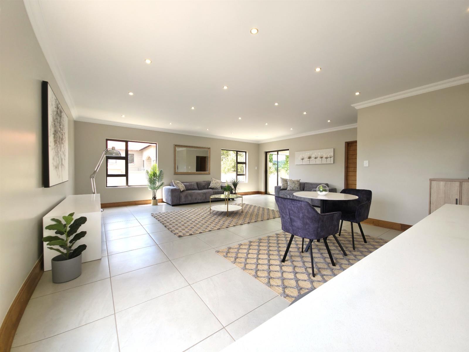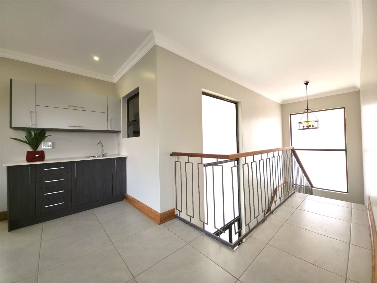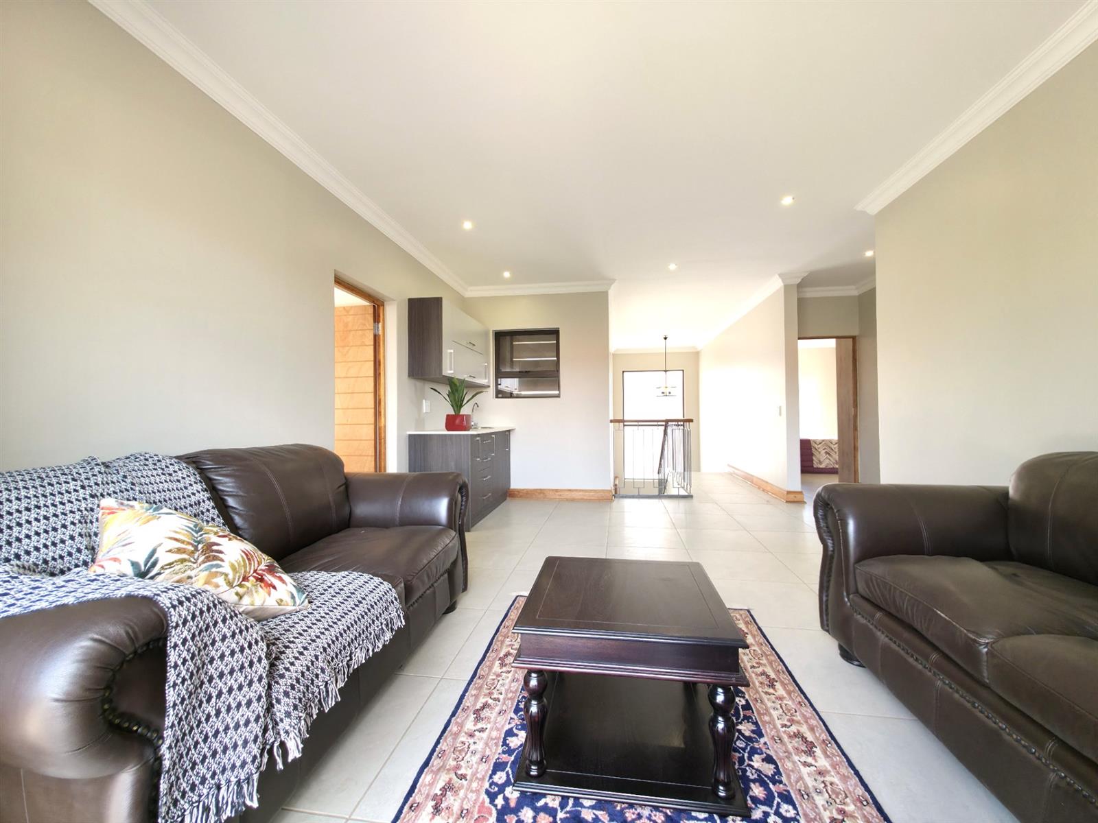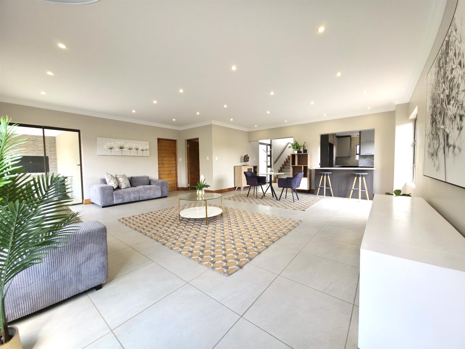 Step inside and be welcomed by sun-filled, open-plan living spaces that flow seamlessly from the sleek, modern kitchen – complete with a separate scullery/laundry – into the dining and living areas. Stacking doors open onto a covered patio with a built-in braai, ideal for year-round entertaining against the serene backdrop of the estate. A guest toilet completes the ground floor, while direct access from the double garage ensures convenience.