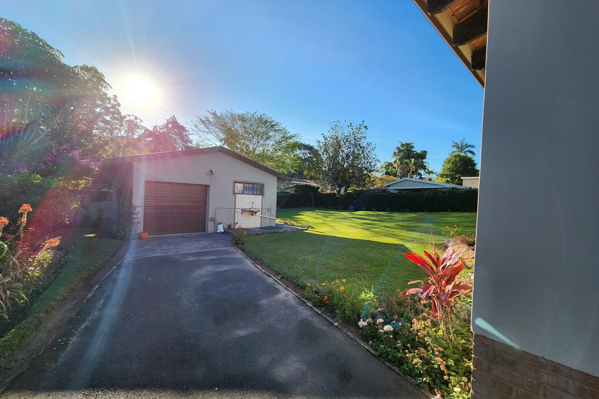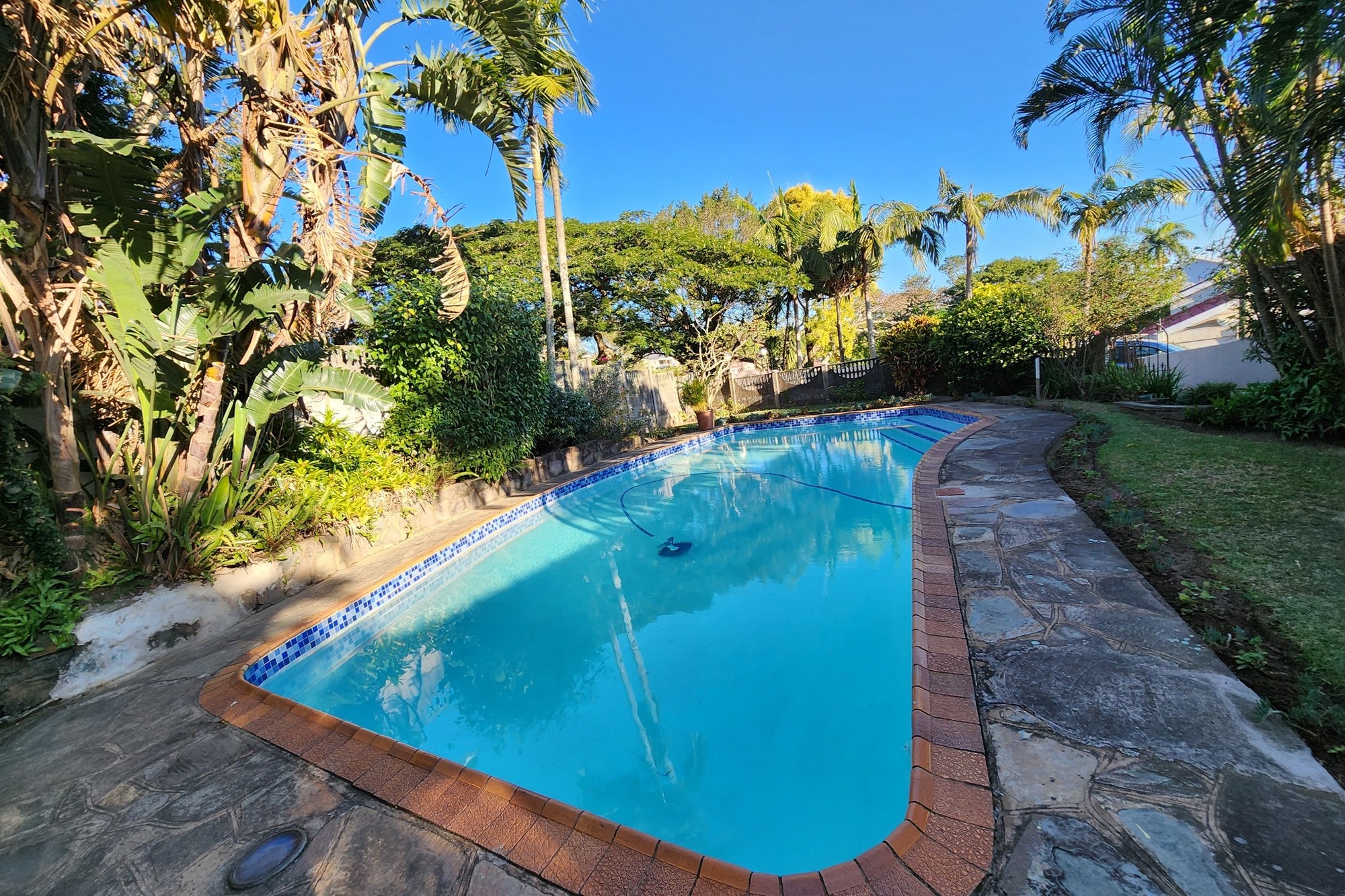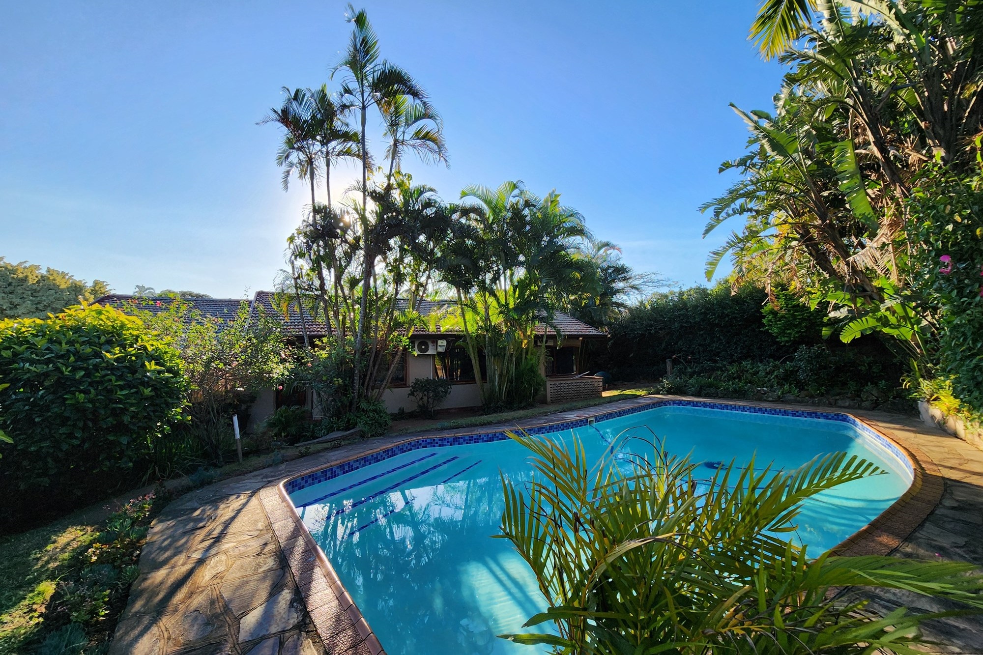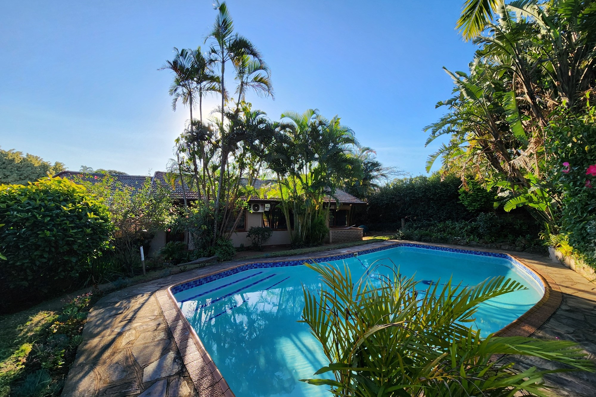 Outdoor garden space, ideal for hosting family and friends with sparkling blue pool, set against a backdrop of a lush, manicured garden – your personal paradise.