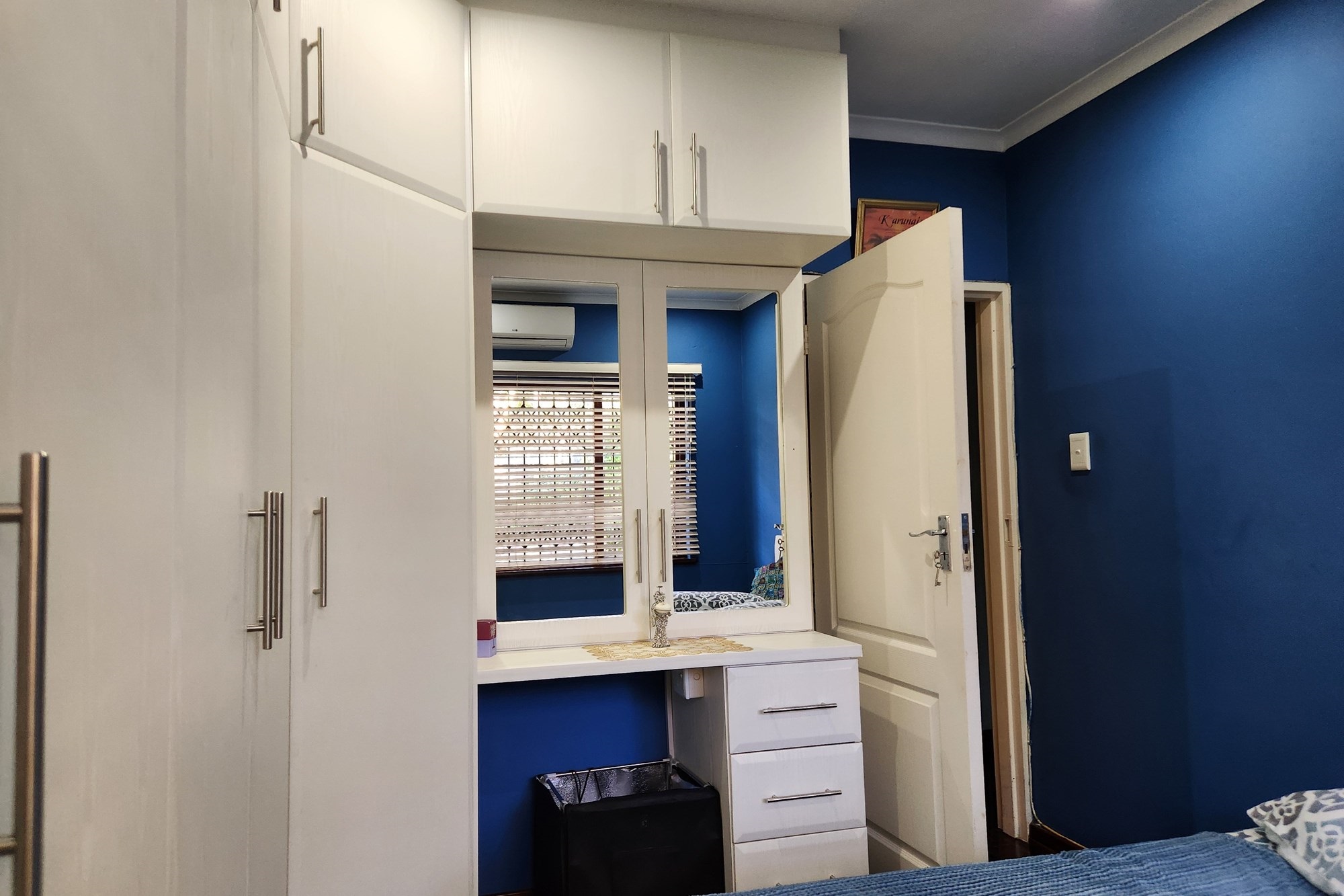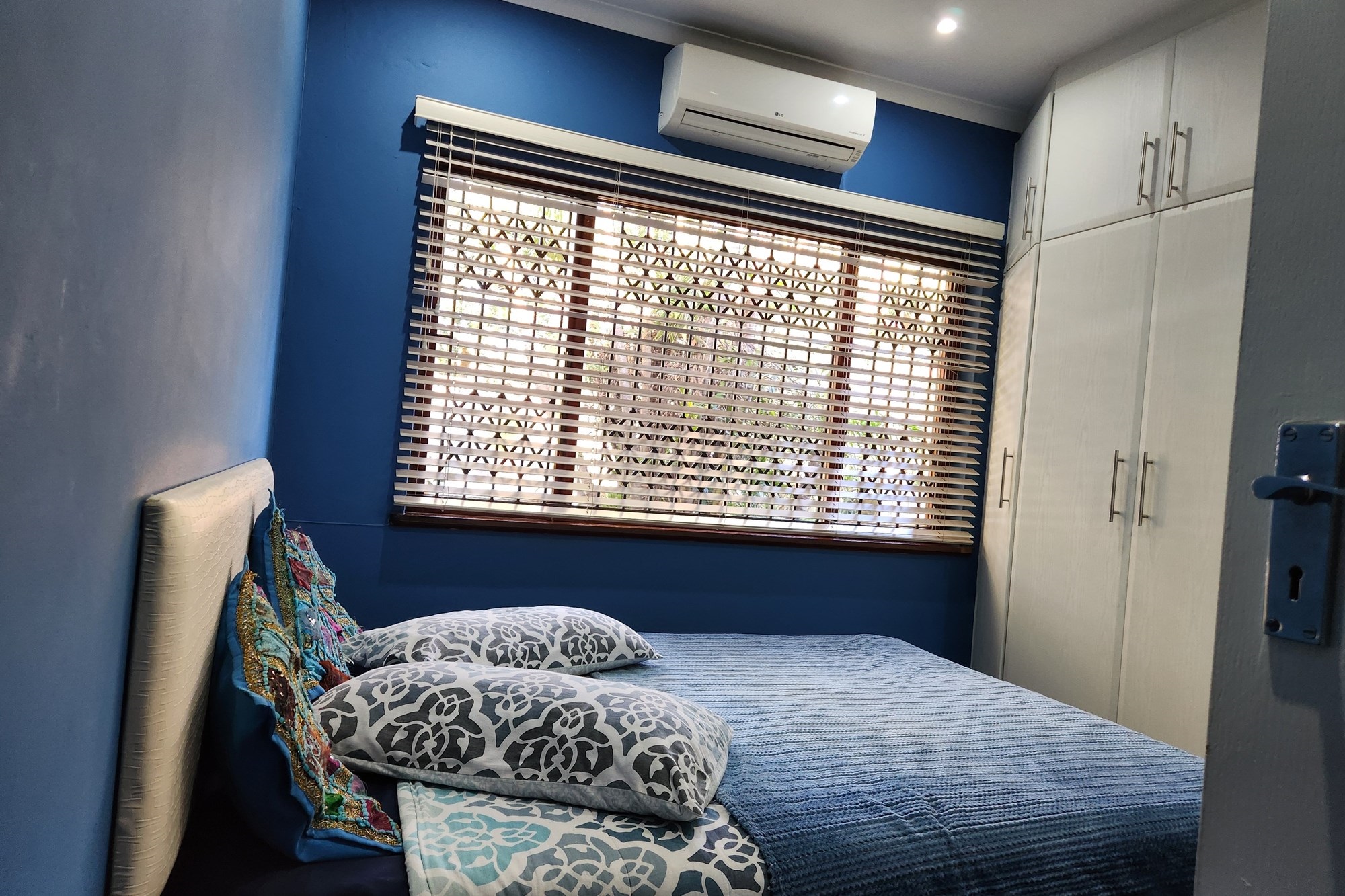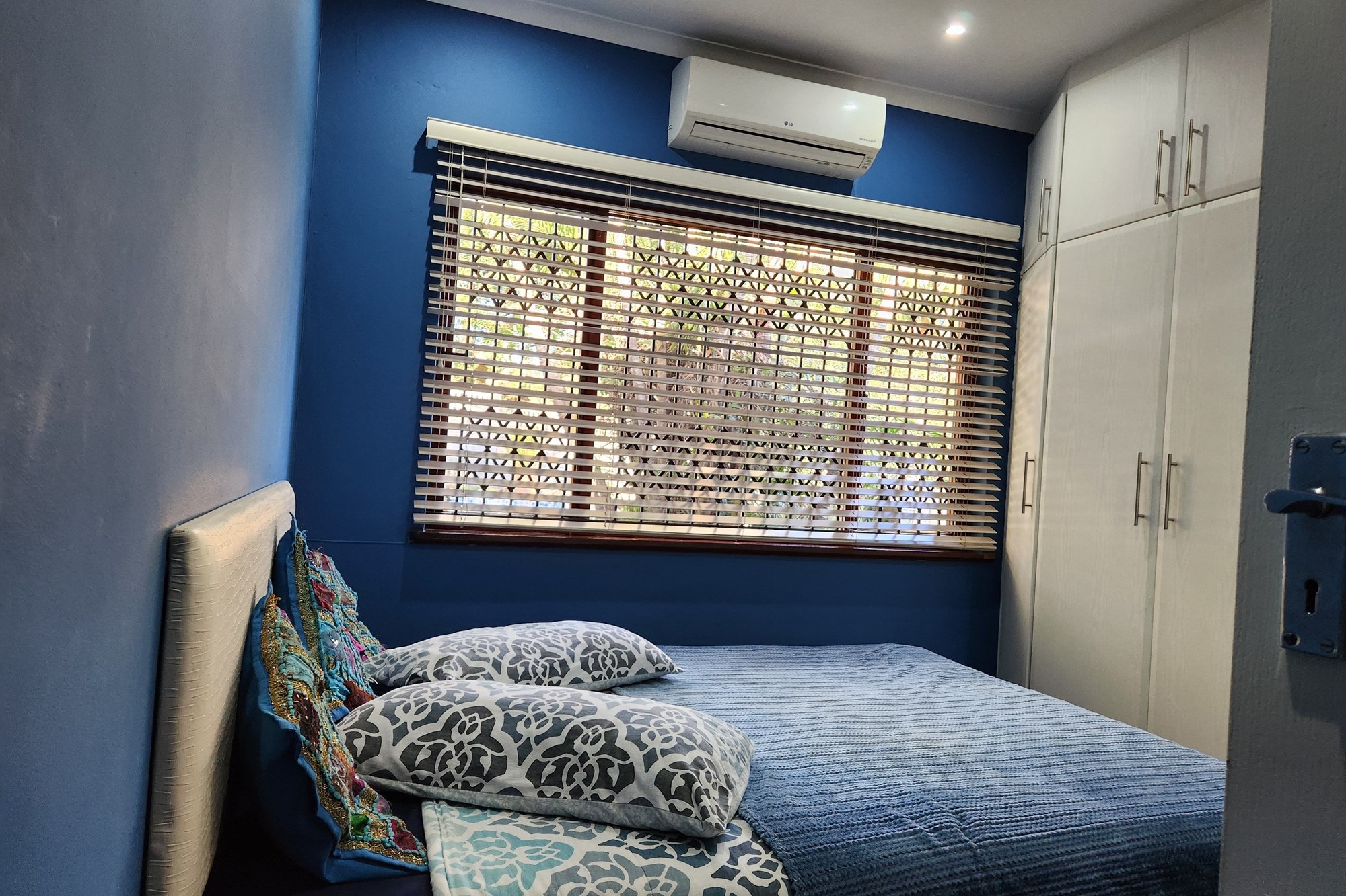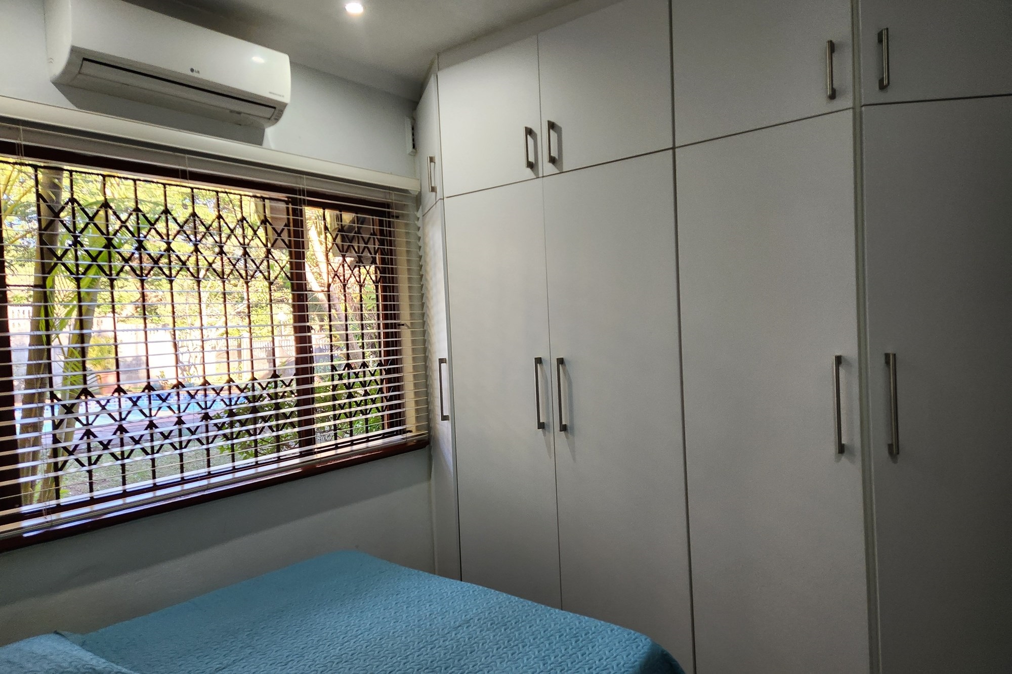 The three generously sized bedrooms, all beautifully fitted with built-in cupboards. The luxurious main bedroom boasts a full ensuite with shower and also the private entrance from the pool and garden .