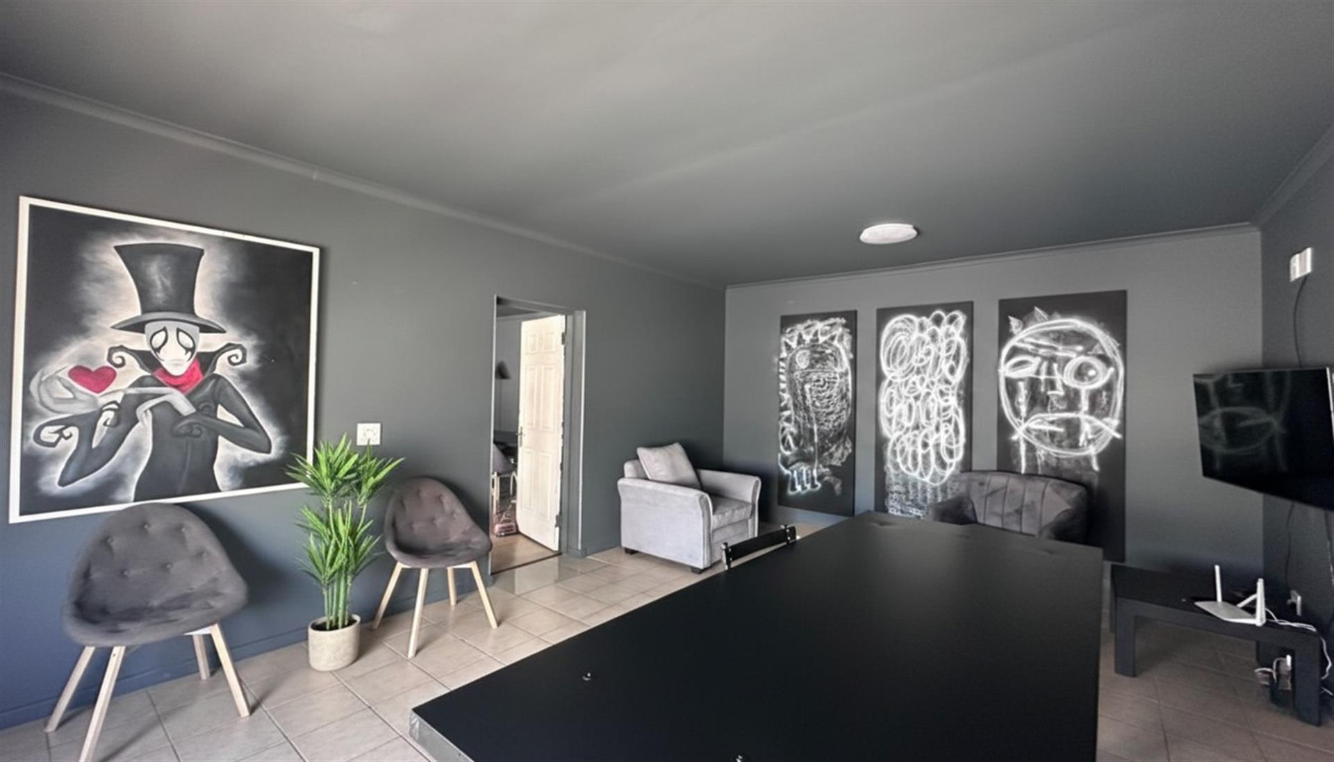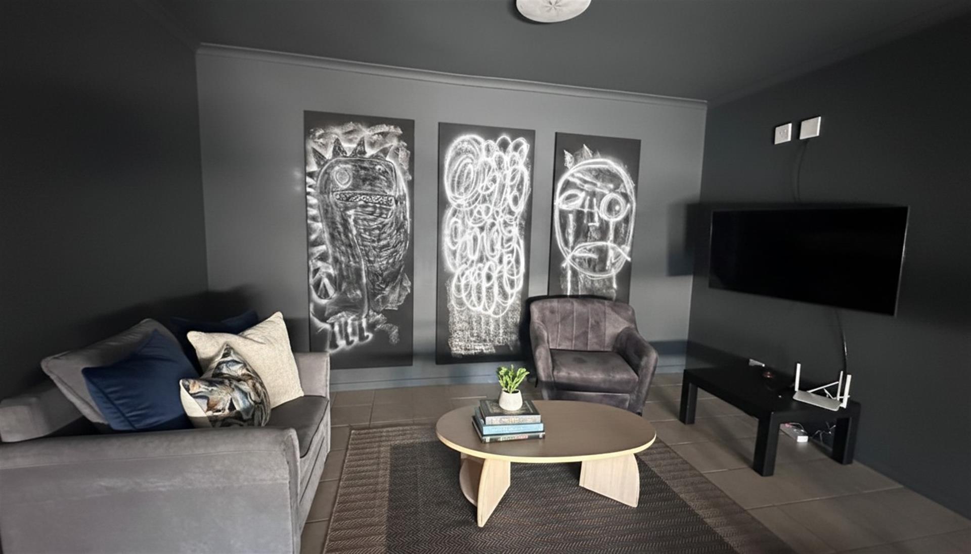 Artful Lounge: A spacious living area adorned with striking, oversized contemporary artwork and comfortable grey seating, making it the ultimate spot for relaxation or entertaining.