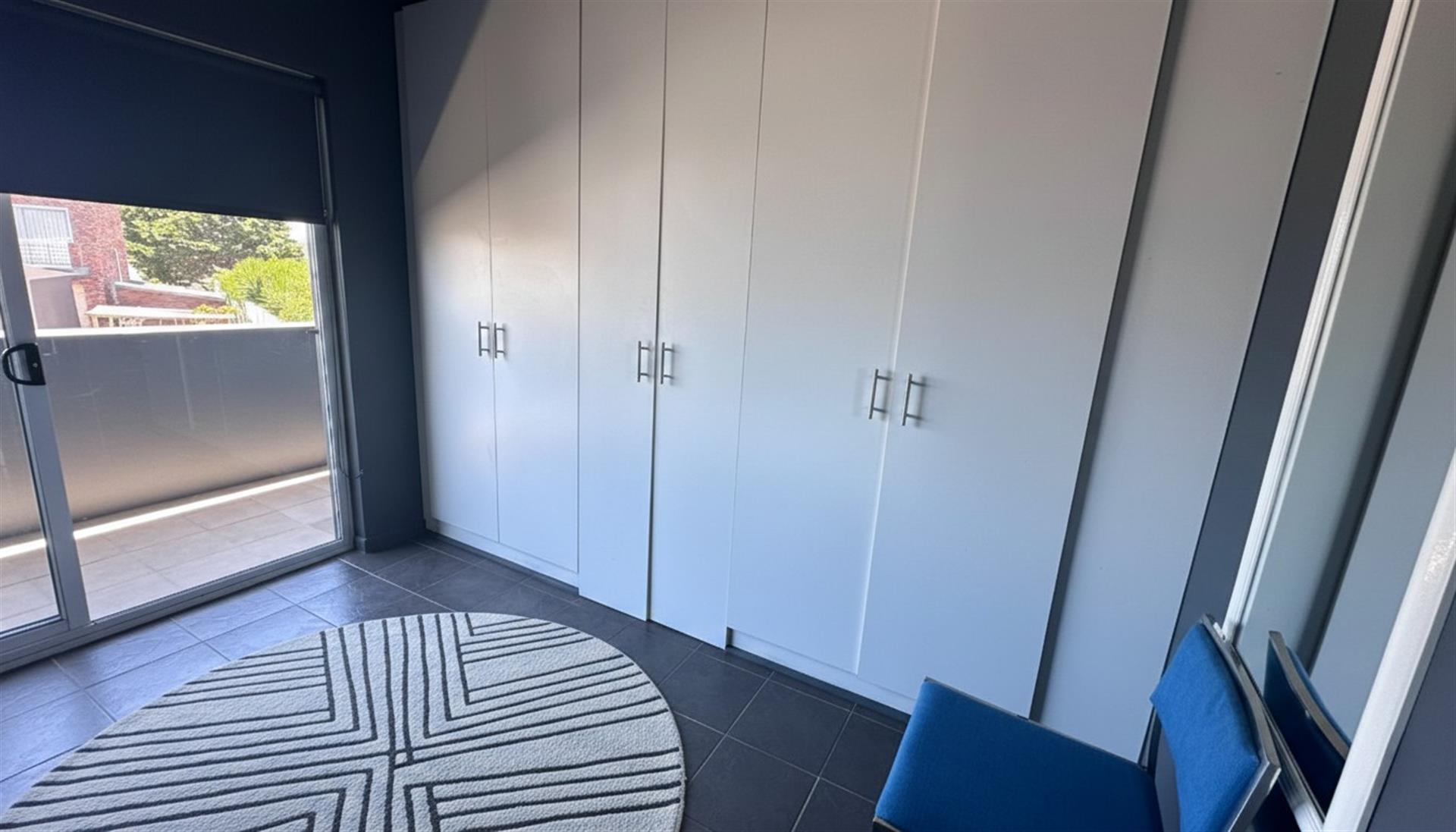 Ample Storage: Floor-to-ceiling sleek white built-in cupboards ensure your space remains clutter-free and organized.