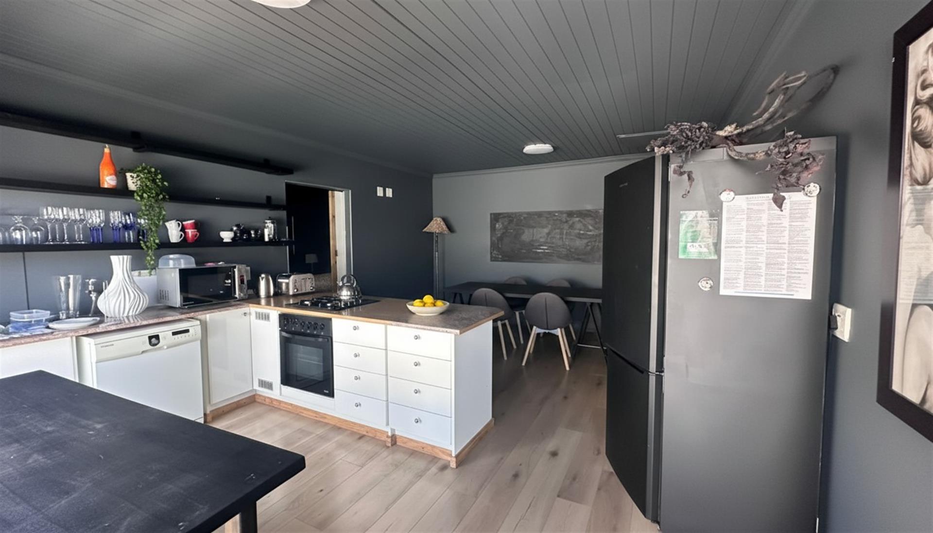 Semi-Equipped: The kitchen comes ready for action with all major appliances, including a stainless steel oven, gas hob, and a large black fridge-freezer that perfectly complements the interior.
