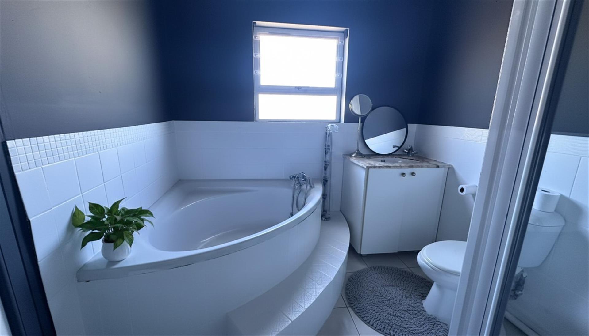 Luxurious Bathroom: The bathroom features a deep, built-in corner soaking tub and modern white tiling, offering a spa-like retreat.