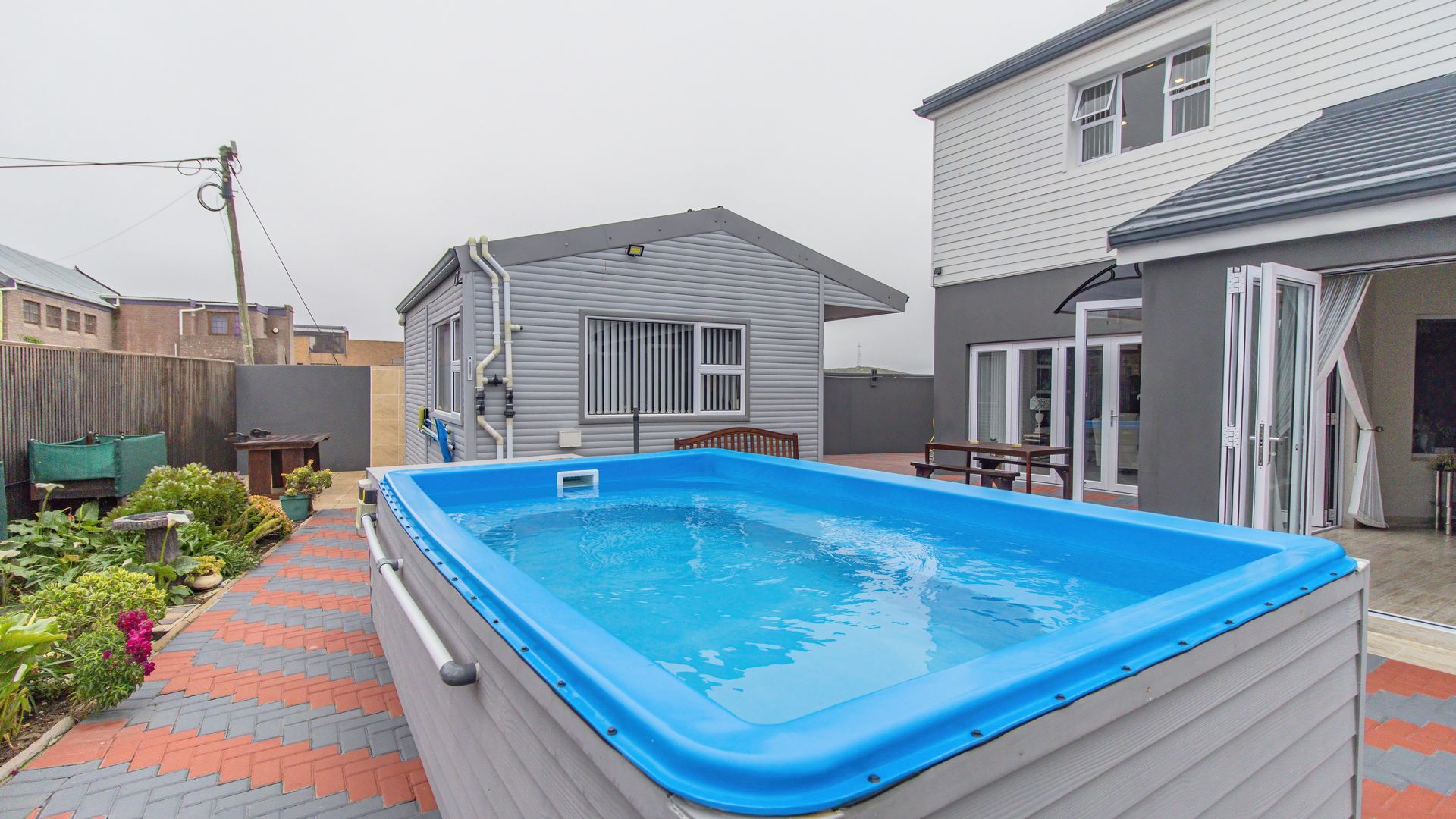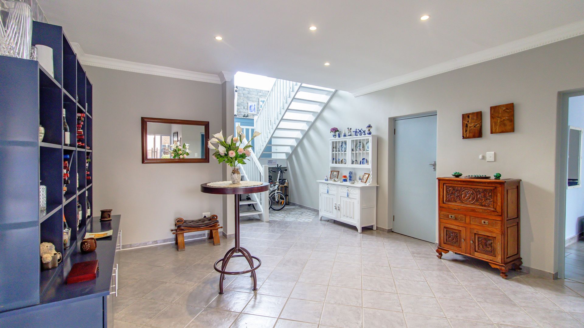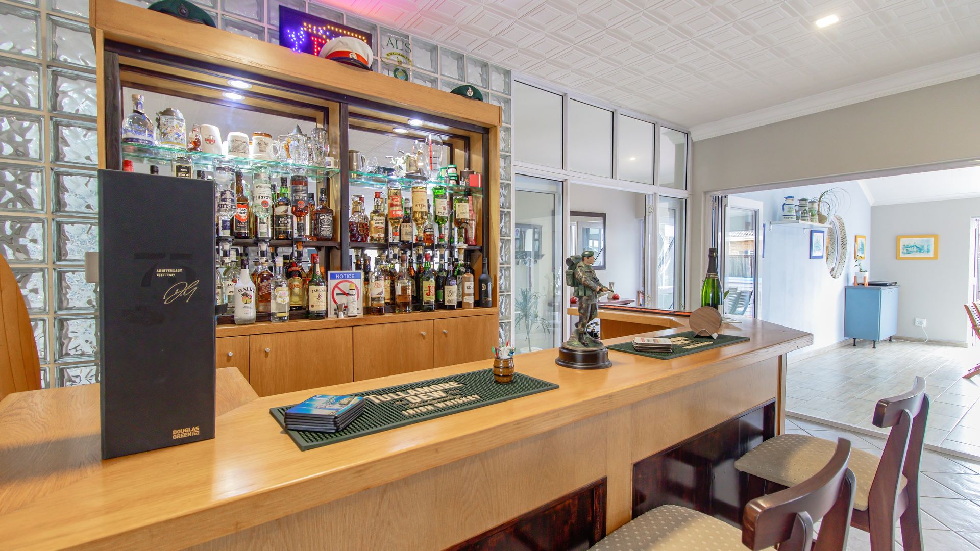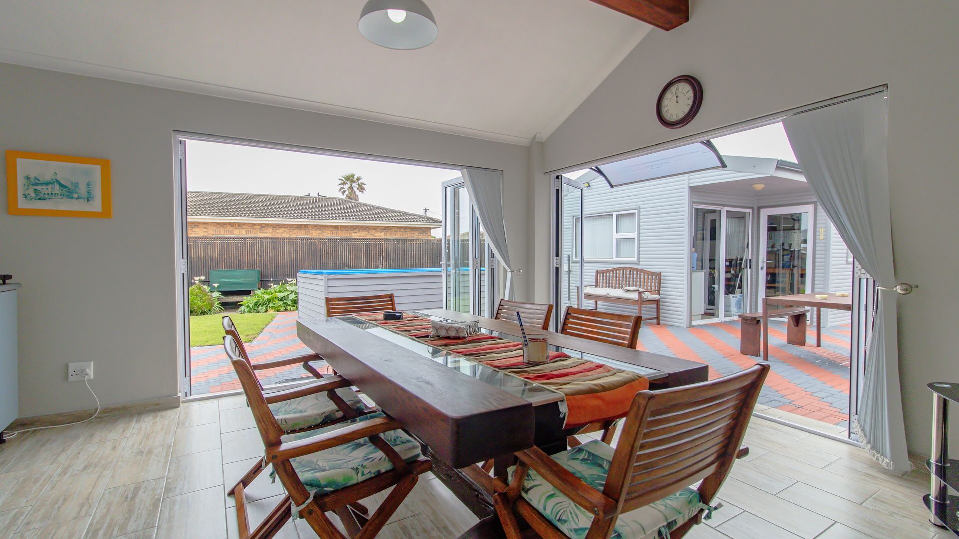 A sunny entertainment room features a solid oak bar and stack doors flowing to the private garden. Both levels provide ideal spaces to add a braai/barbecue, while the upstairs pajama lounge and gym can be converted into a second braai room with panoramic sea views.