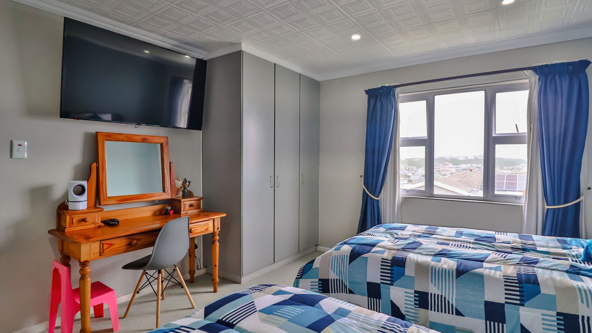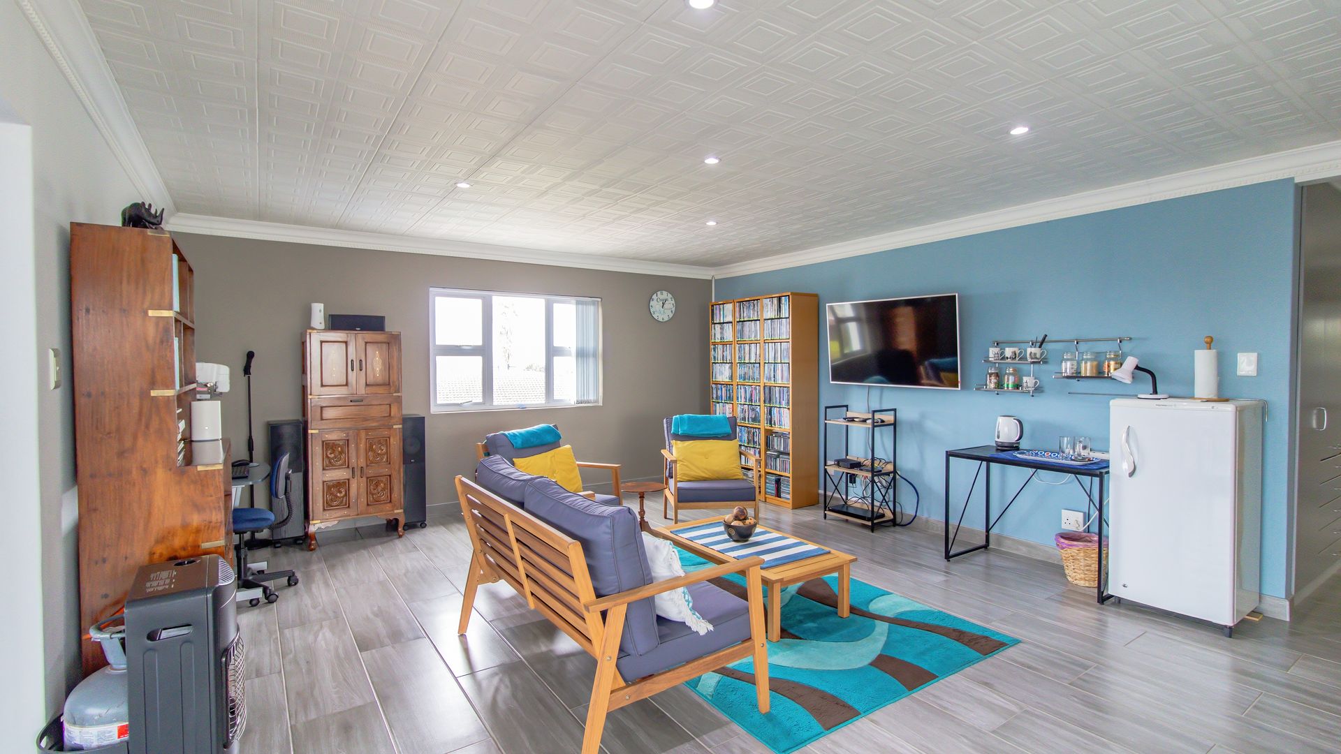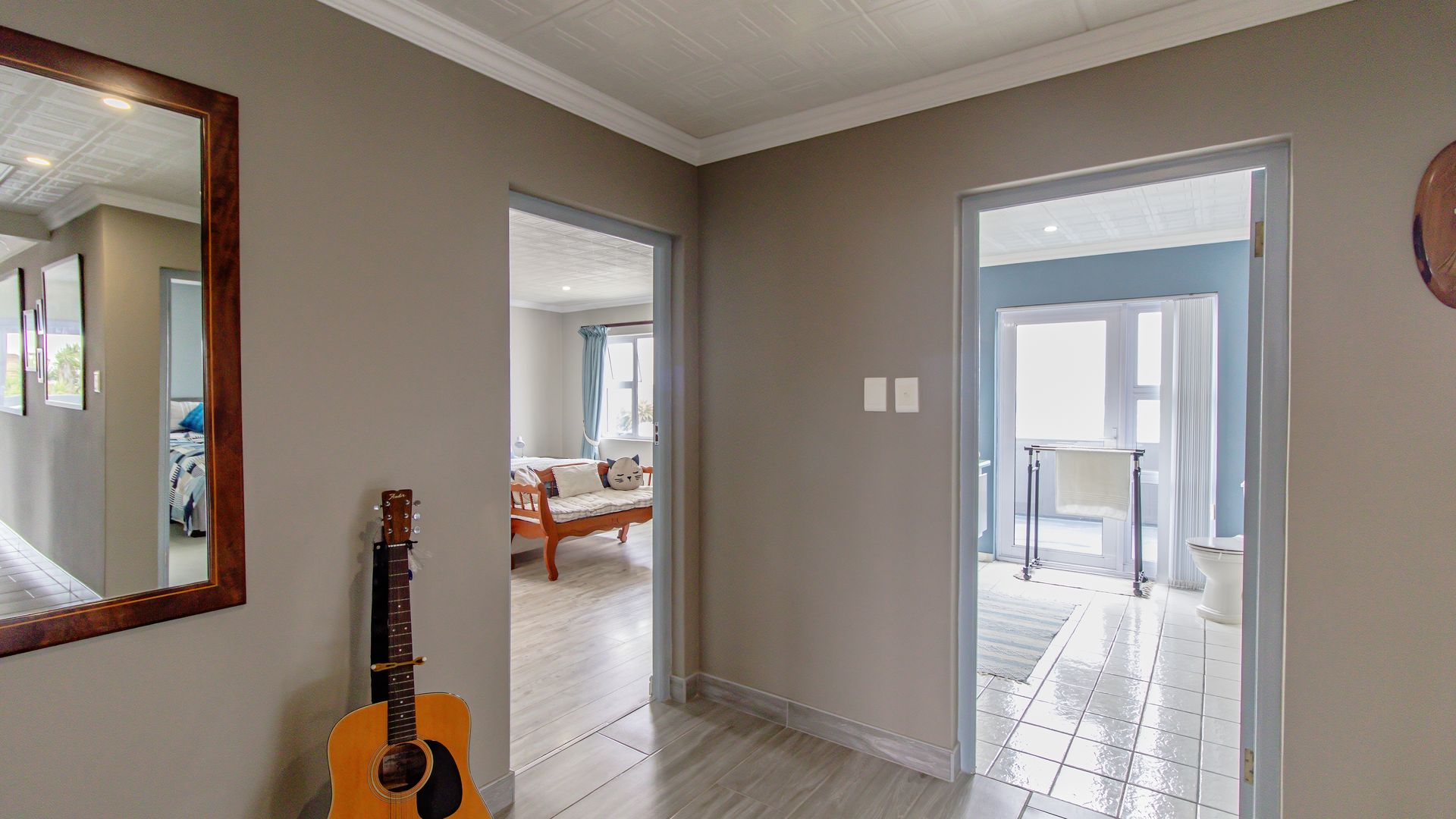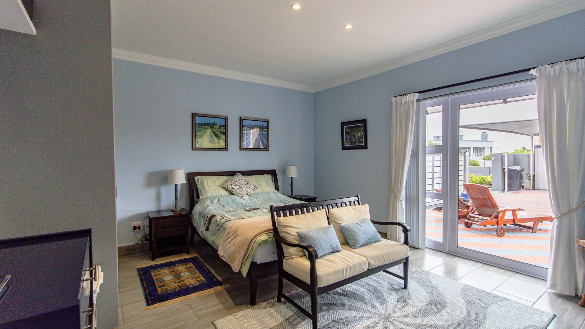 A sunny entertainment room features a solid oak bar and stack doors flowing to the private garden. Both levels provide ideal spaces to add a braai/barbecue, while the upstairs pajama lounge and gym can be converted into a second braai room with panoramic sea views.