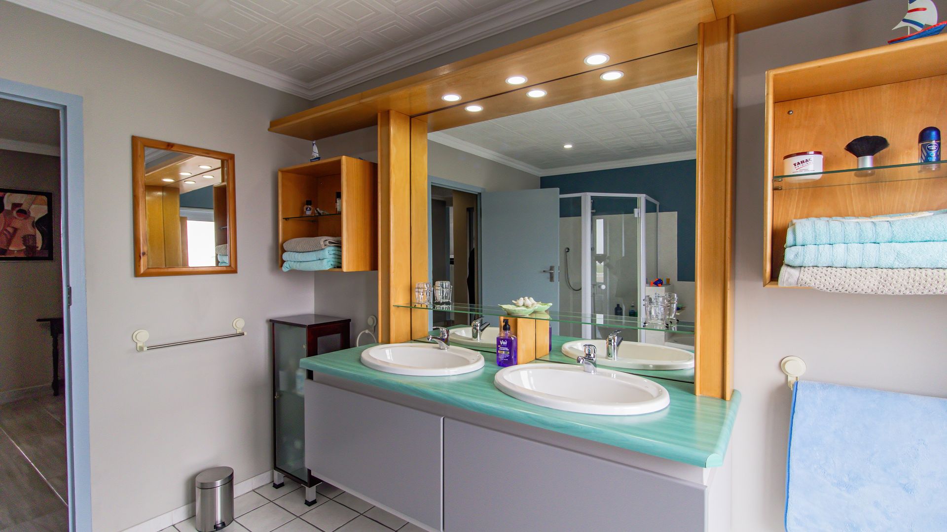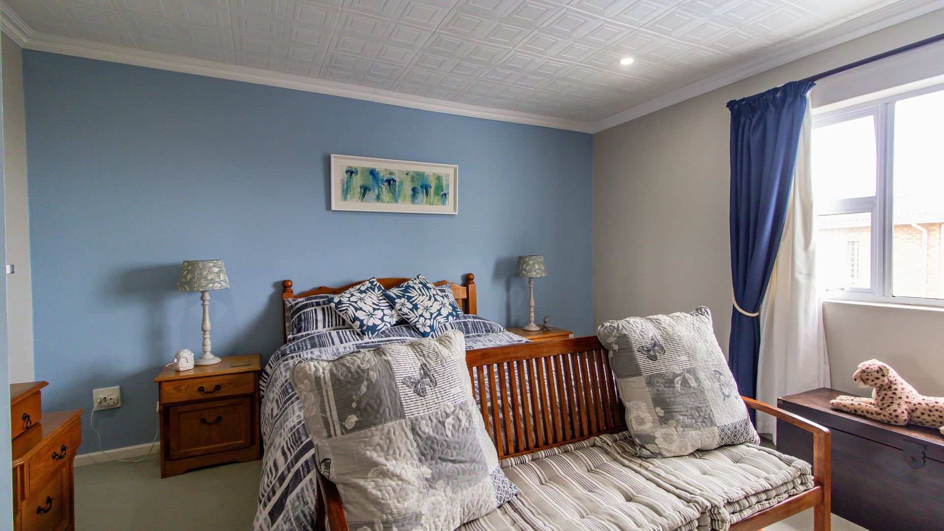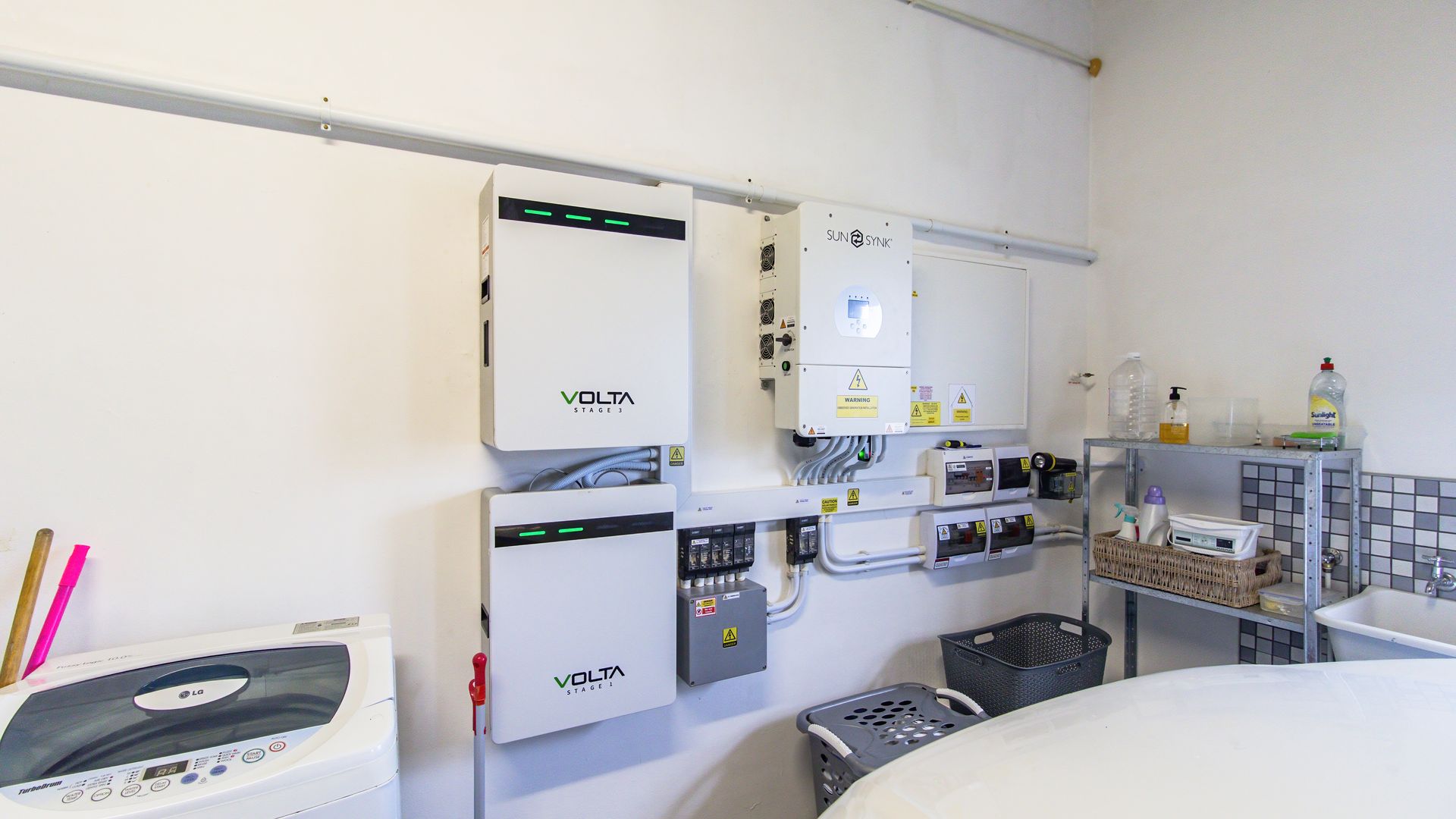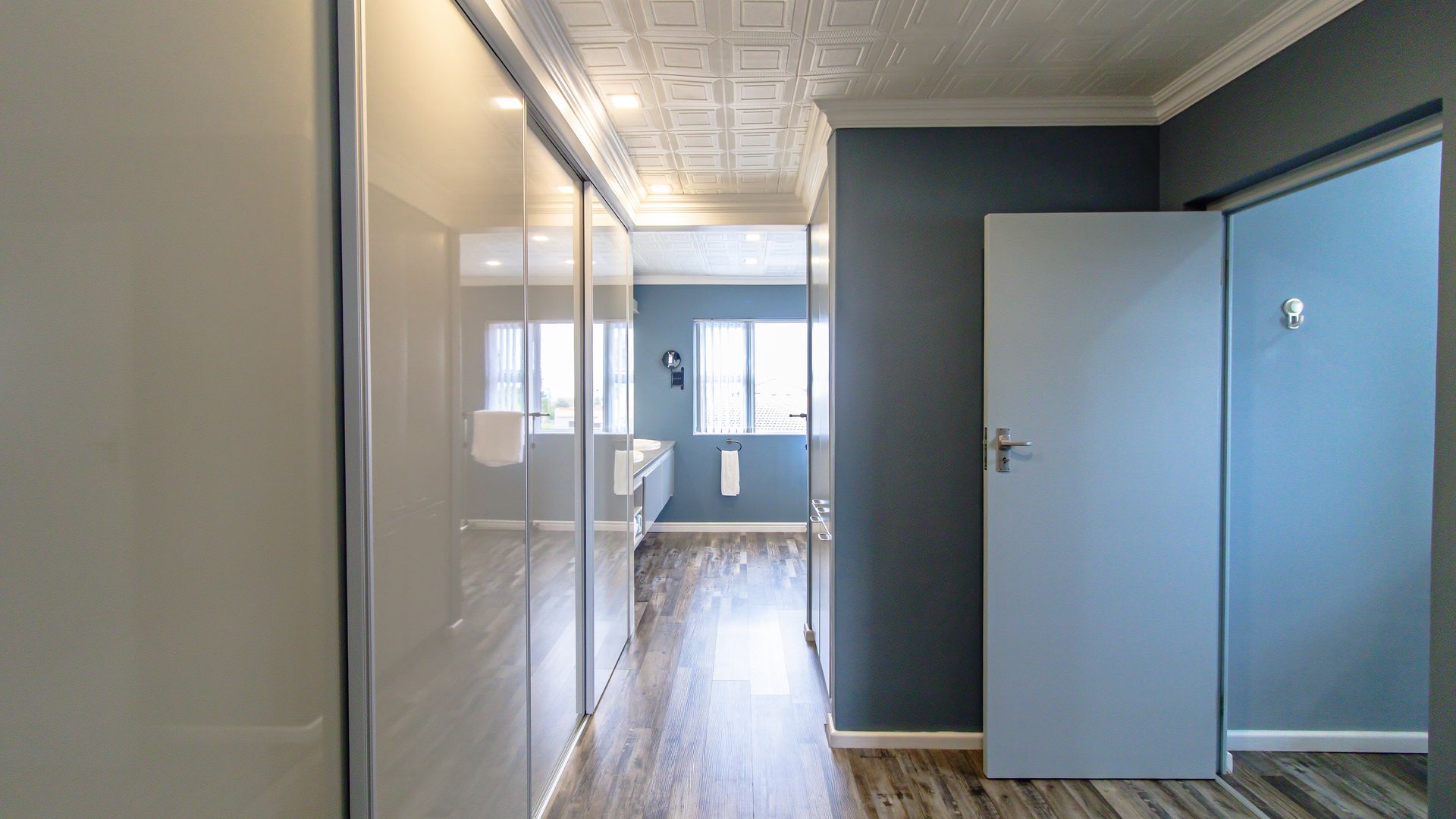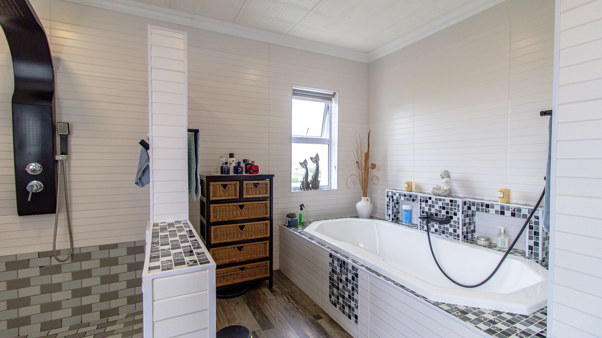 A sunny entertainment room features a solid oak bar and stack doors flowing to the private garden. Both levels provide ideal spaces to add a braai/barbecue, while the upstairs pajama lounge and gym can be converted into a second braai room with panoramic sea views.