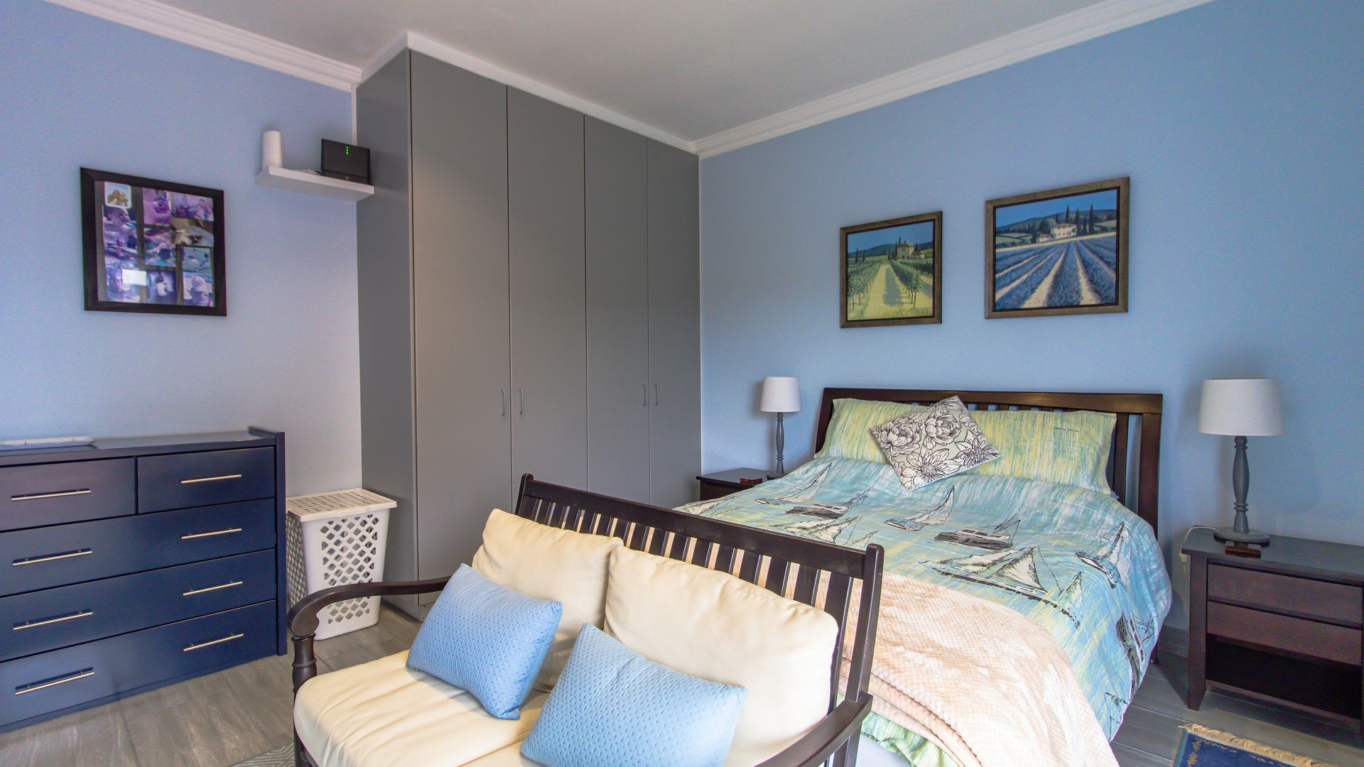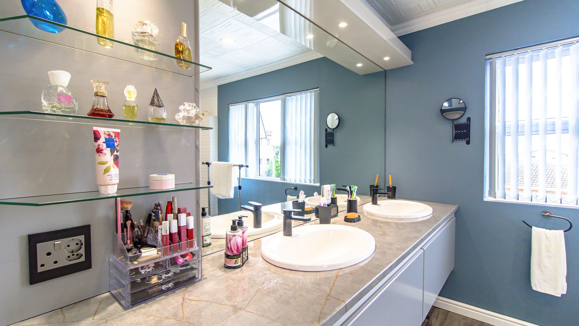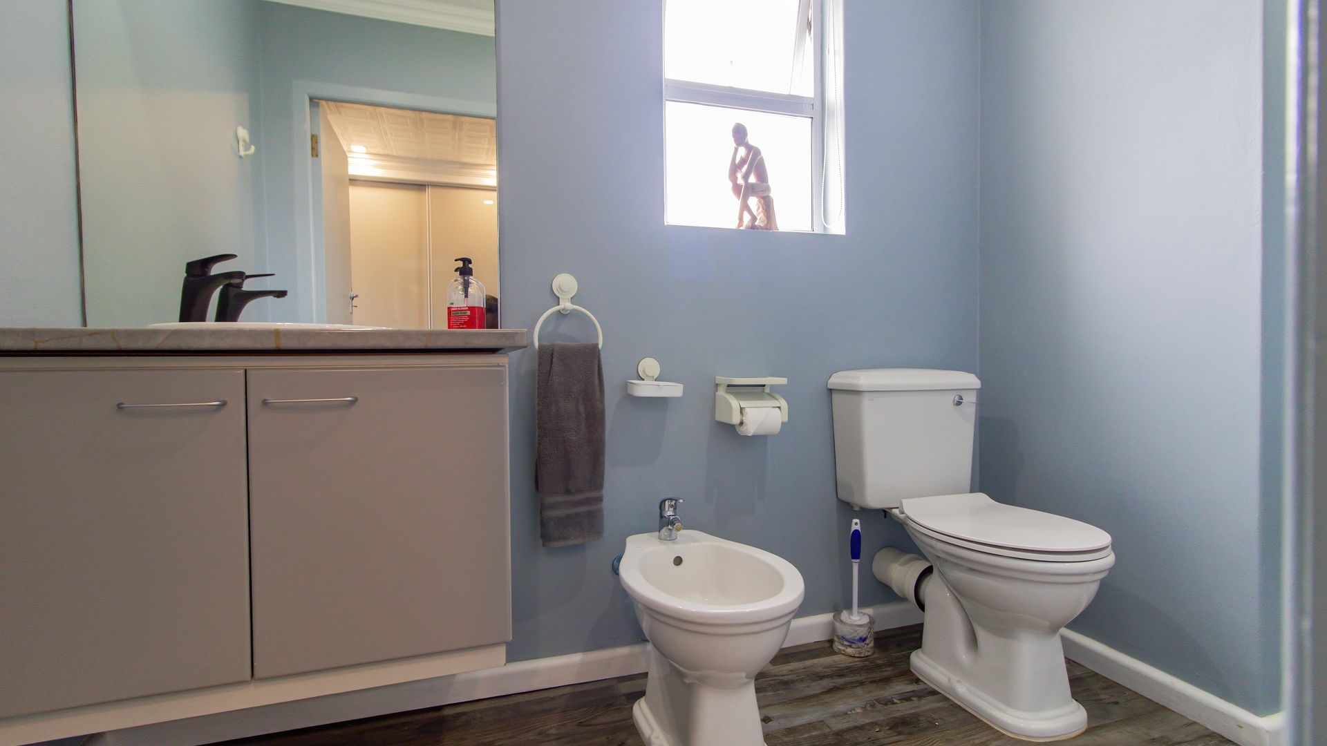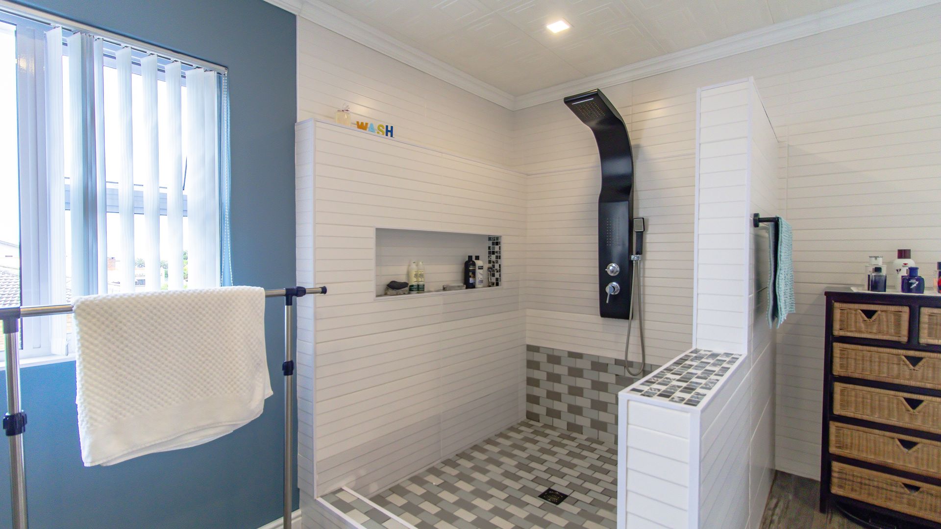 A sunny entertainment room features a solid oak bar and stack doors flowing to the private garden. Both levels provide ideal spaces to add a braai/barbecue, while the upstairs pajama lounge and gym can be converted into a second braai room with panoramic sea views.