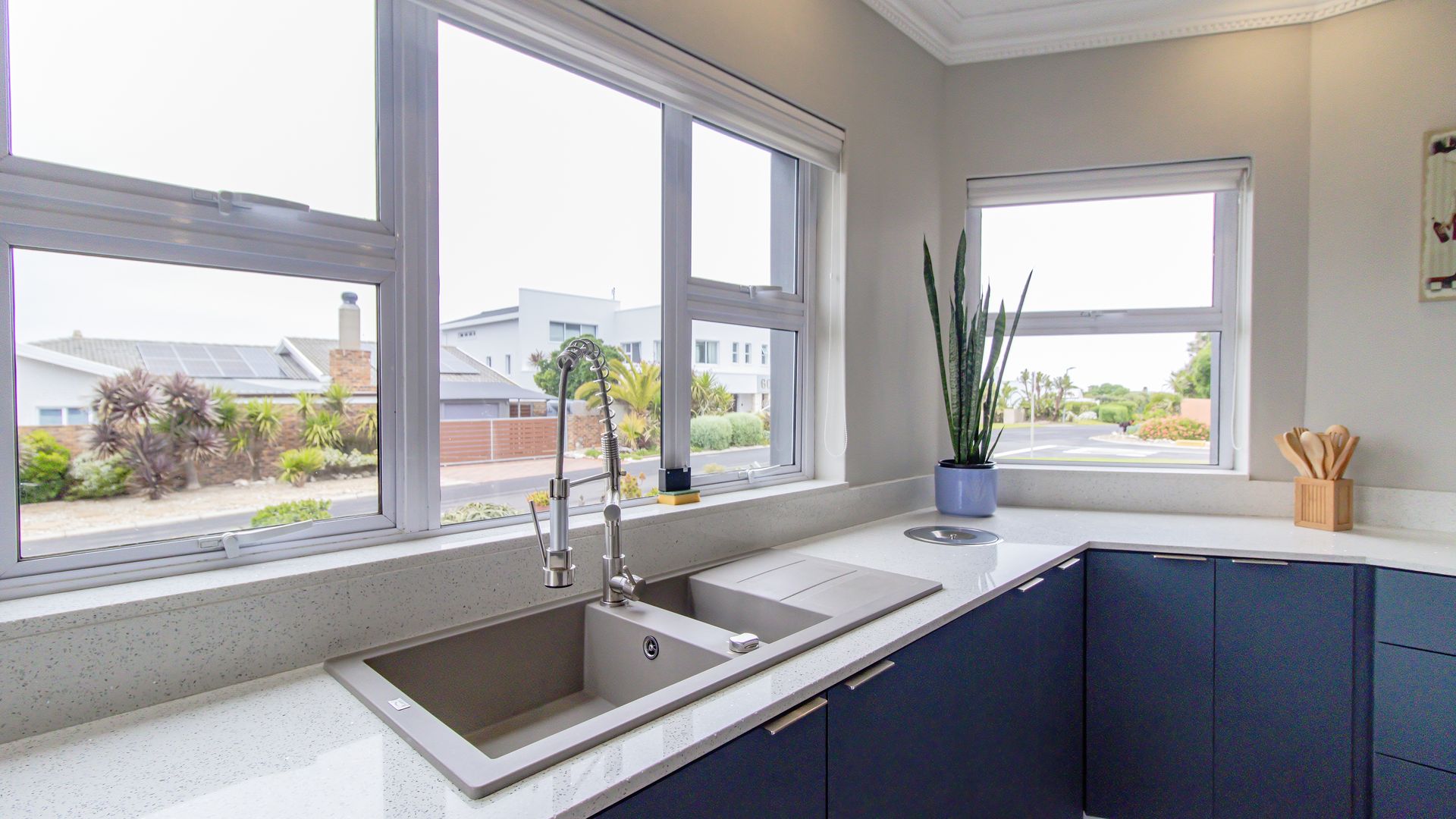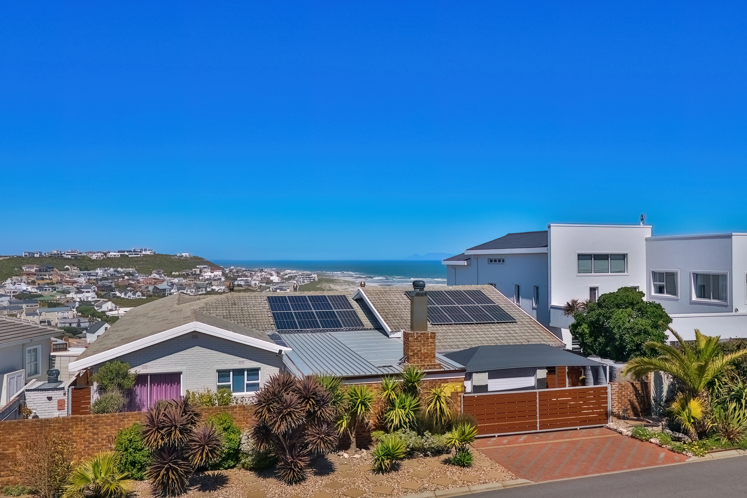 Elevated on a corner stand in central Yzerfontein, this refurbished home offers wrap-around ocean views and spectacular West Coast sunsets, mainly enjoyed from the upper level. Just a short walk from the sea, it is move-in ready and designed for family living and entertaining.