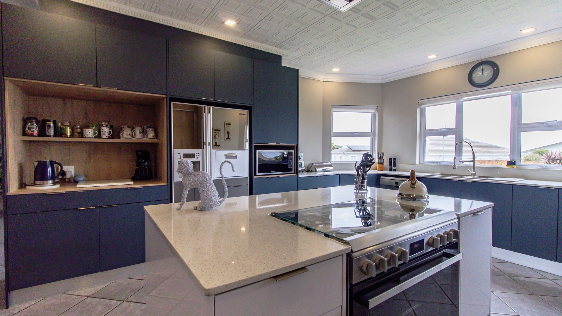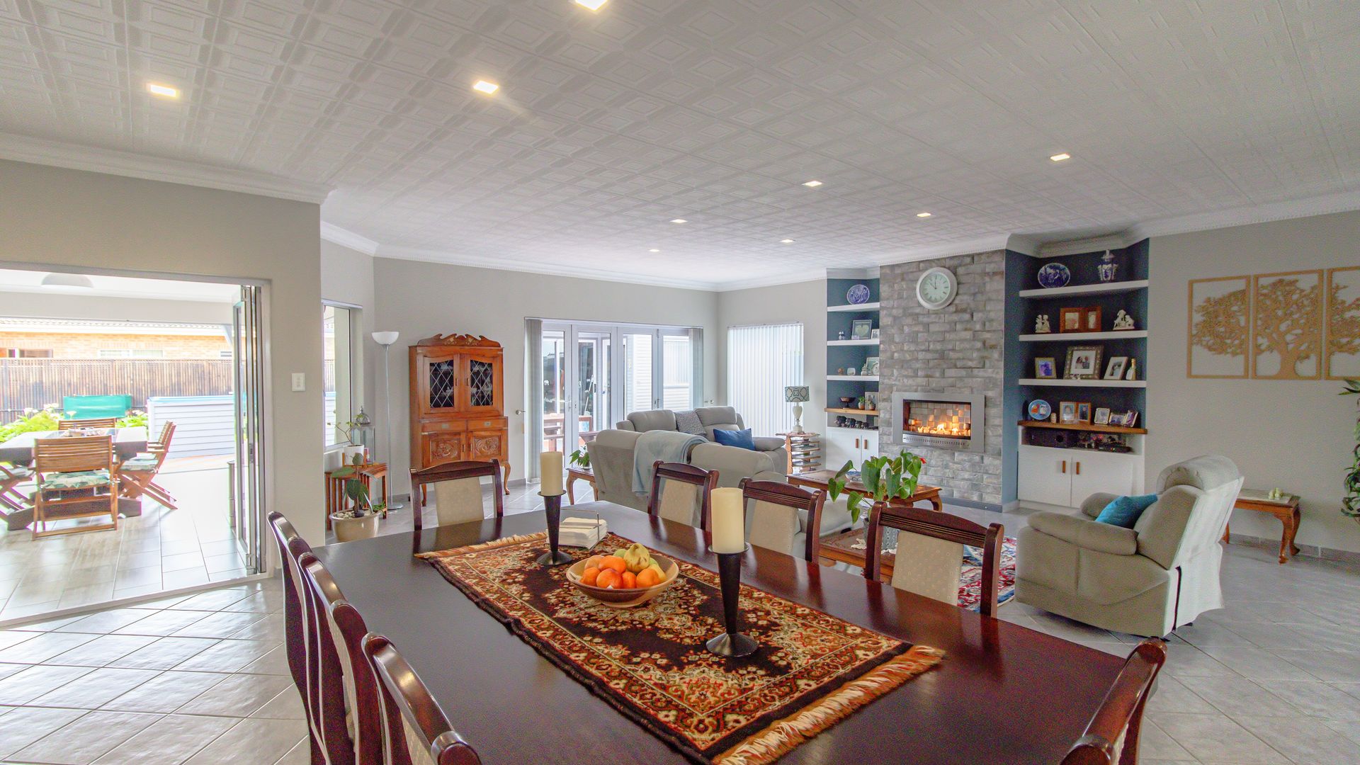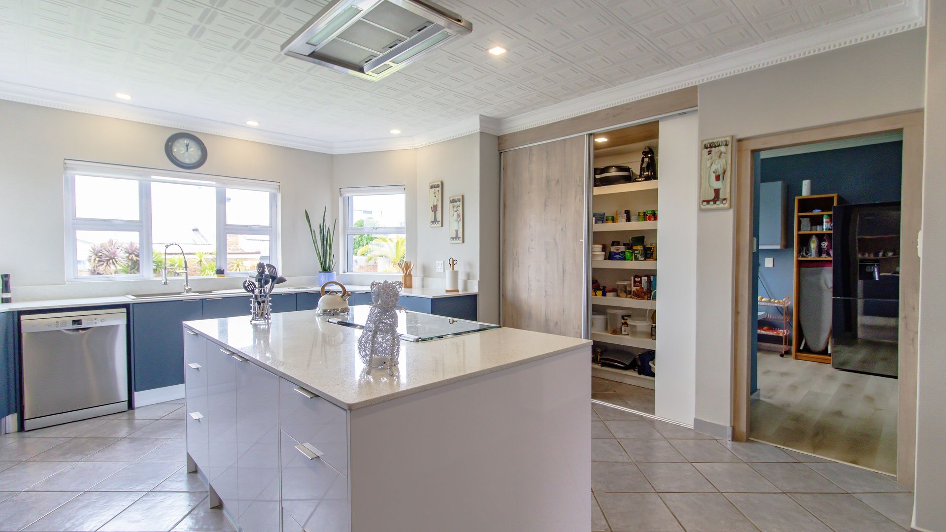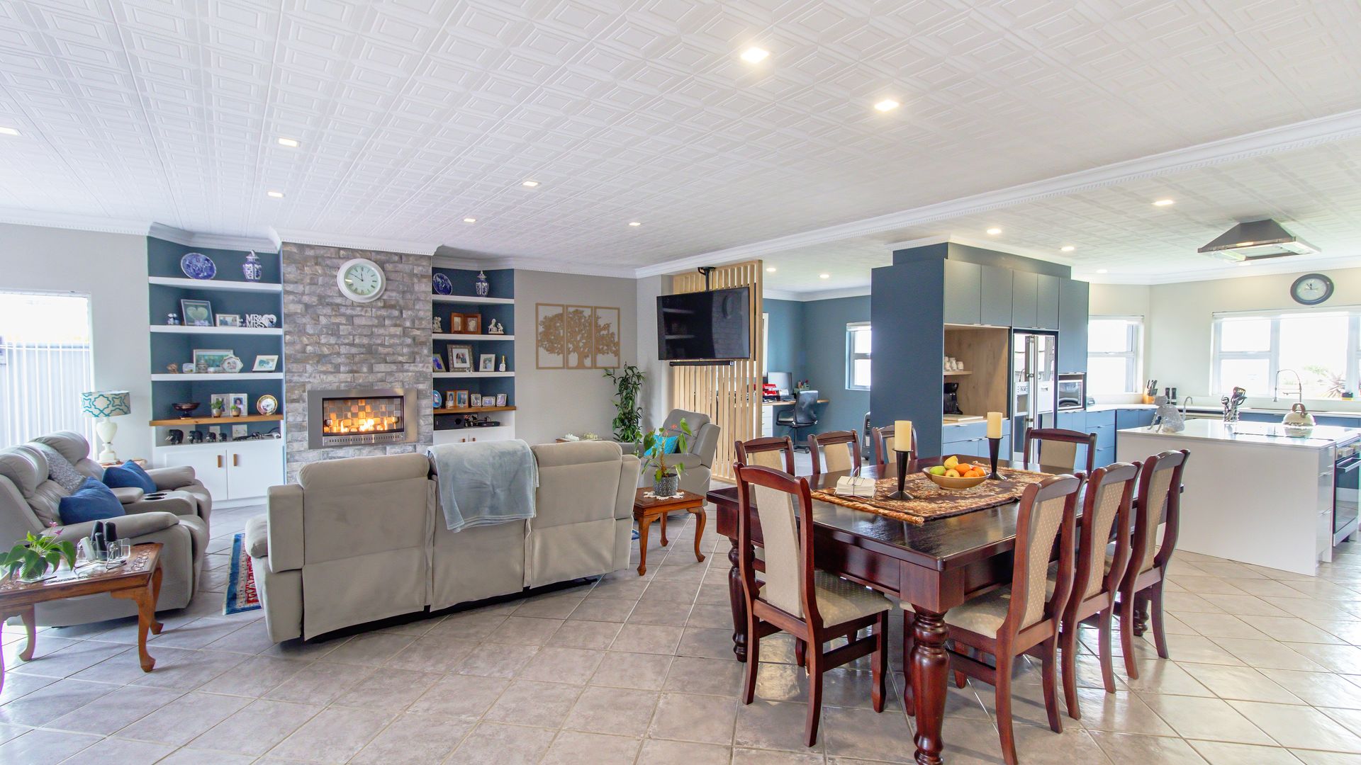 The wide entrance hall leads to an open plan living and dining area with a gas fireplace and a modern gourmet kitchen featuring a central island, gas hob and oven, engineered stone counters, and walk-in pantry. A separate scullery/laundry adds convenience, and a private office nook is discreetly screened.