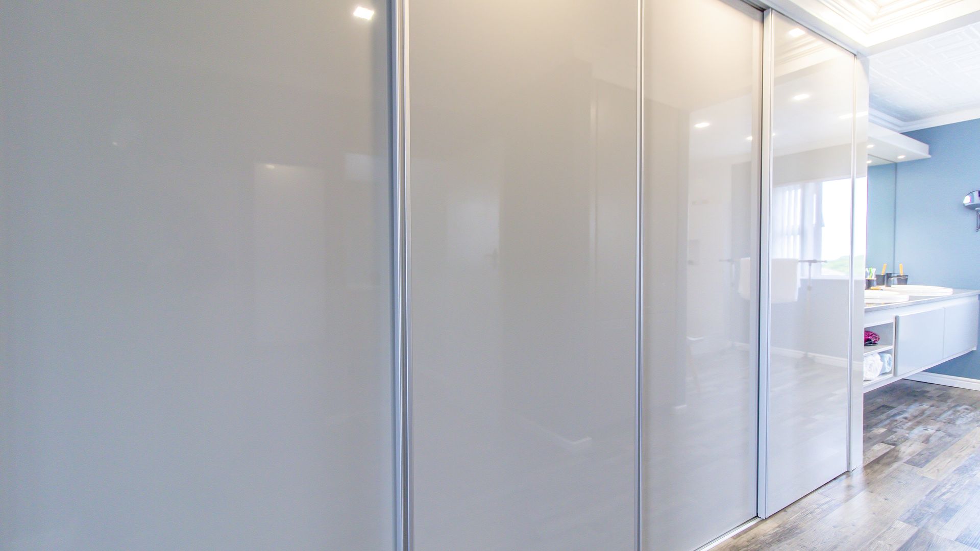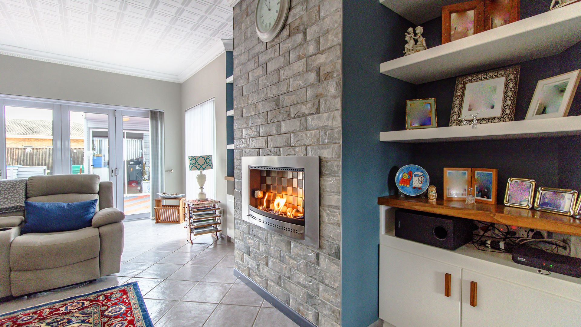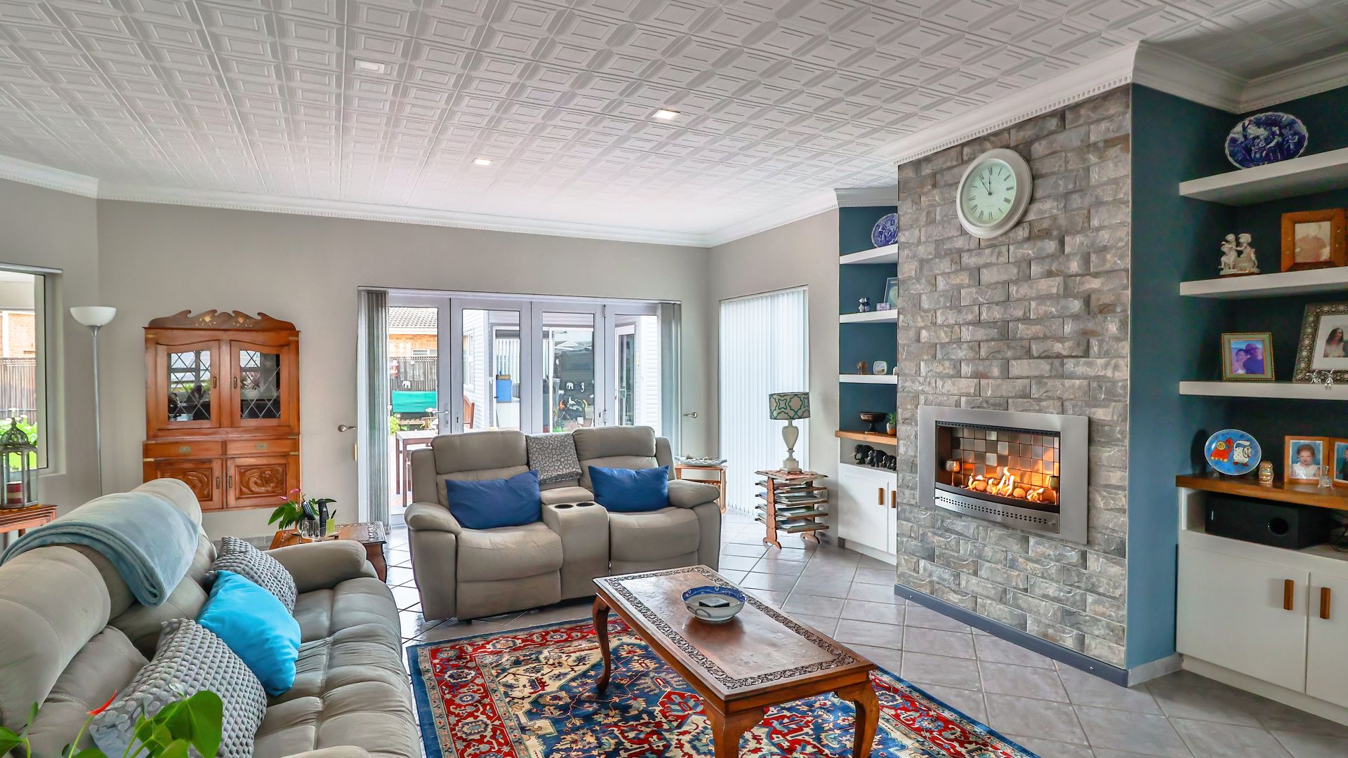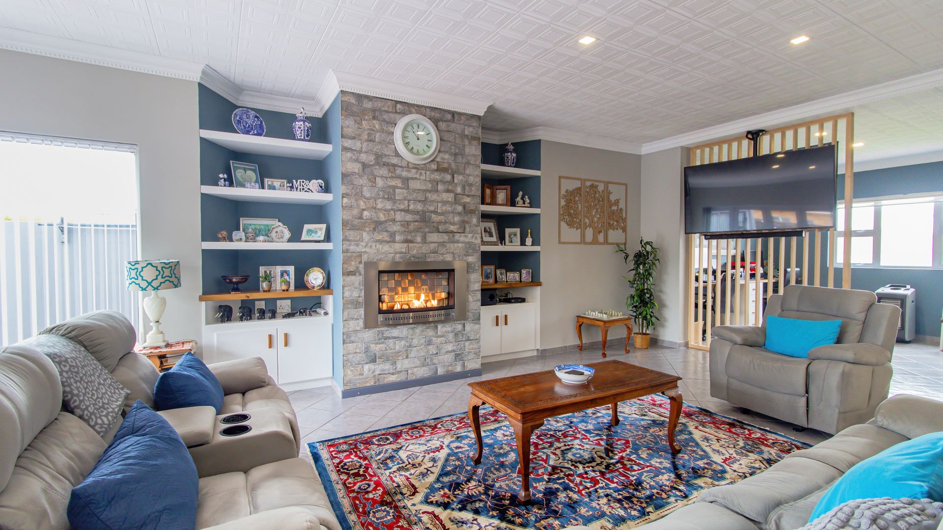 The wide entrance hall leads to an open plan living and dining area with a gas fireplace and a modern gourmet kitchen featuring a central island, gas hob and oven, engineered stone counters, and walk-in pantry. A separate scullery/laundry adds convenience, and a private office nook is discreetly screened.
