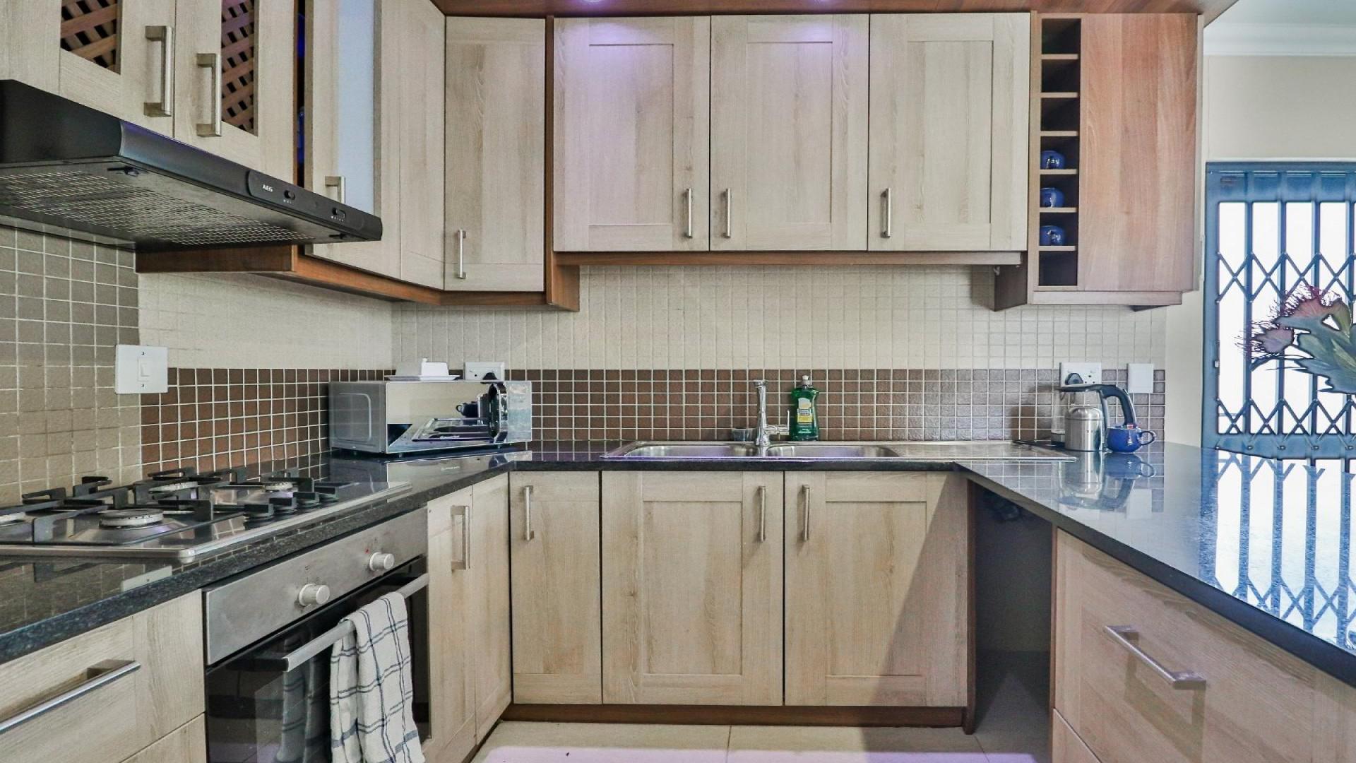 The kitchen is both stylish and practical, fitted with granite countertops and ample cupboard space, catering to everyday convenience and functionality.