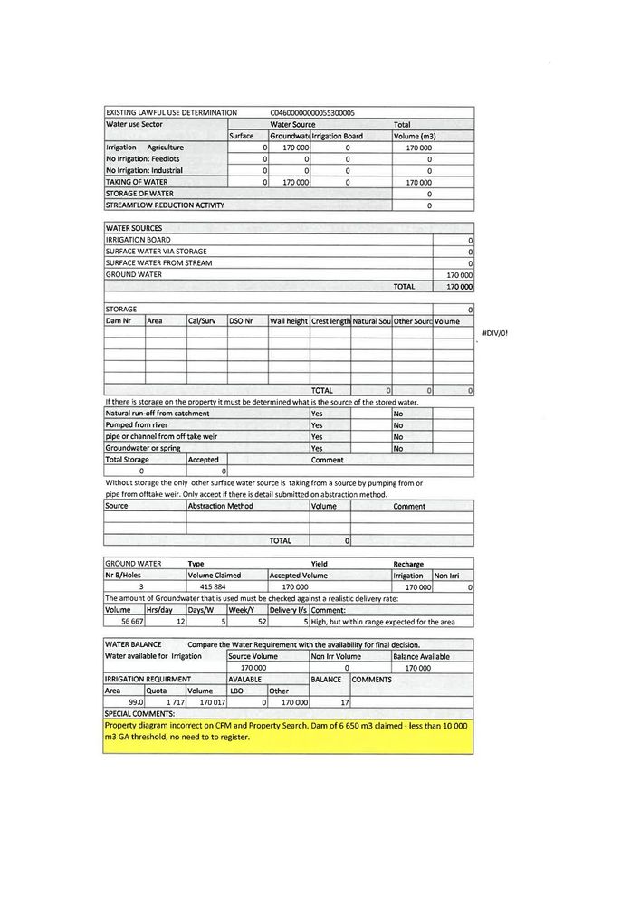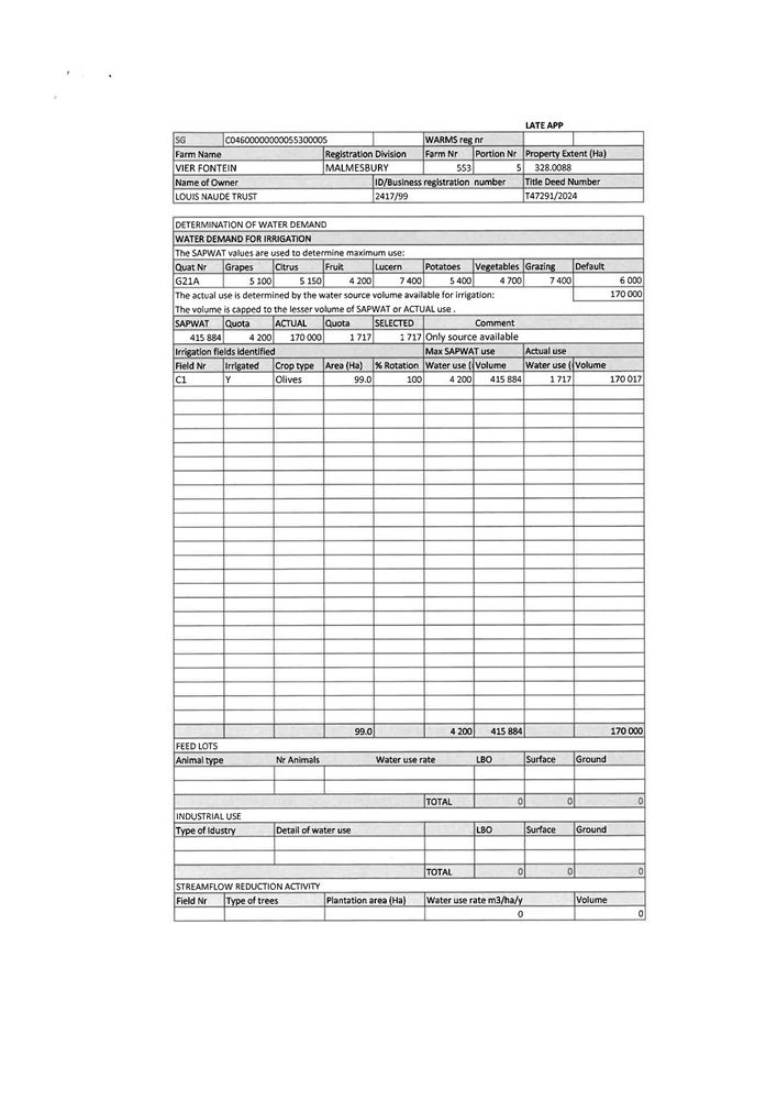 Verified Water Rights: A registered and verified water-use license is in place, supported by a full technical report. Three boreholes produce up to 20,000 liters per hour, complemented by a wind pump and a well point—making the property highly viable for agriculture or tourism infrastructure.
