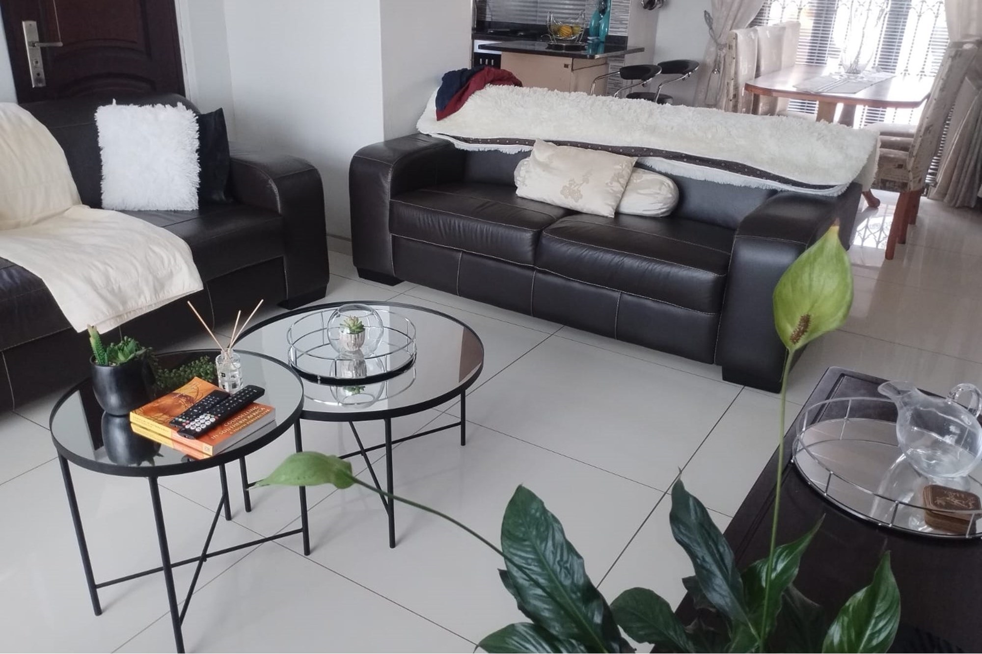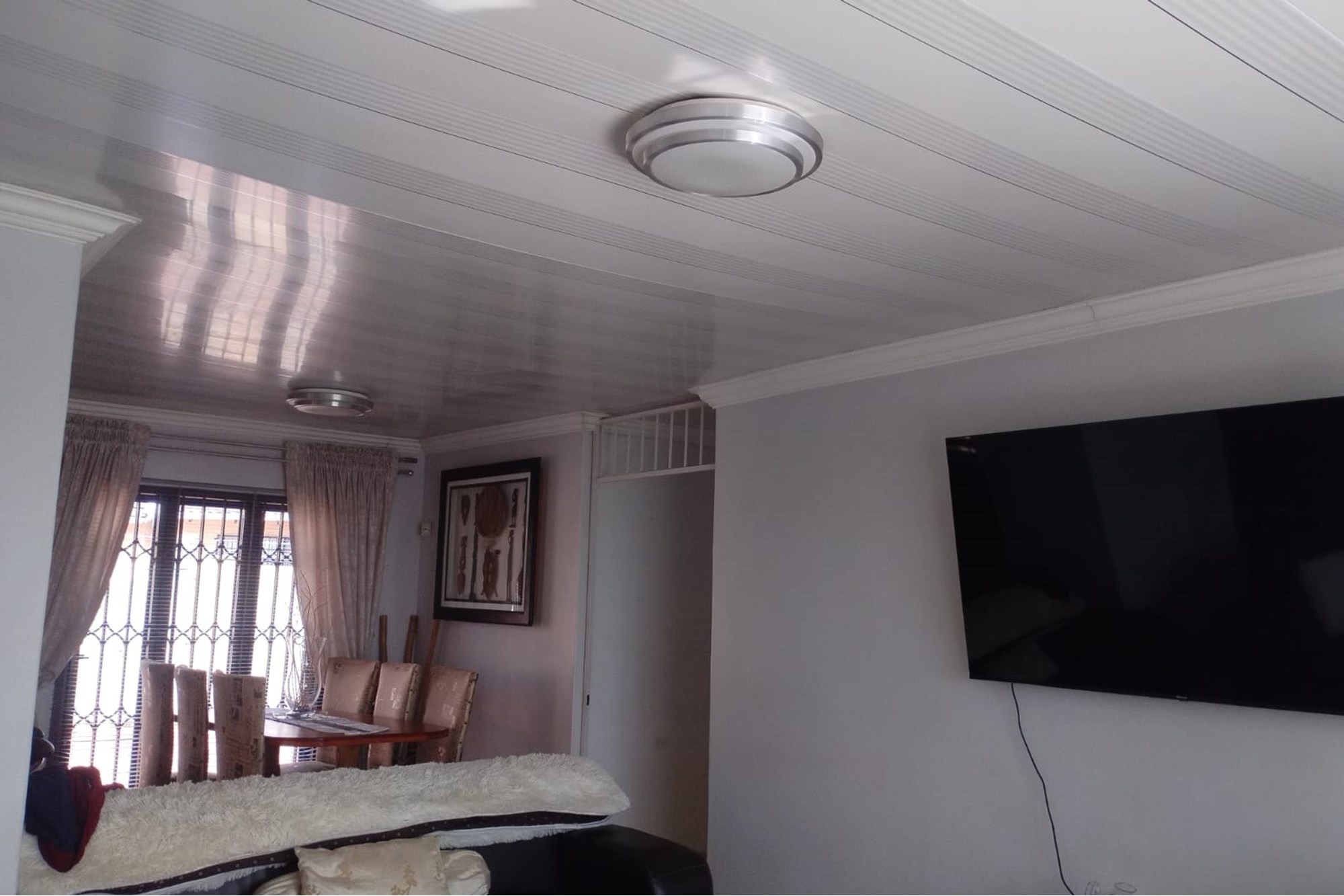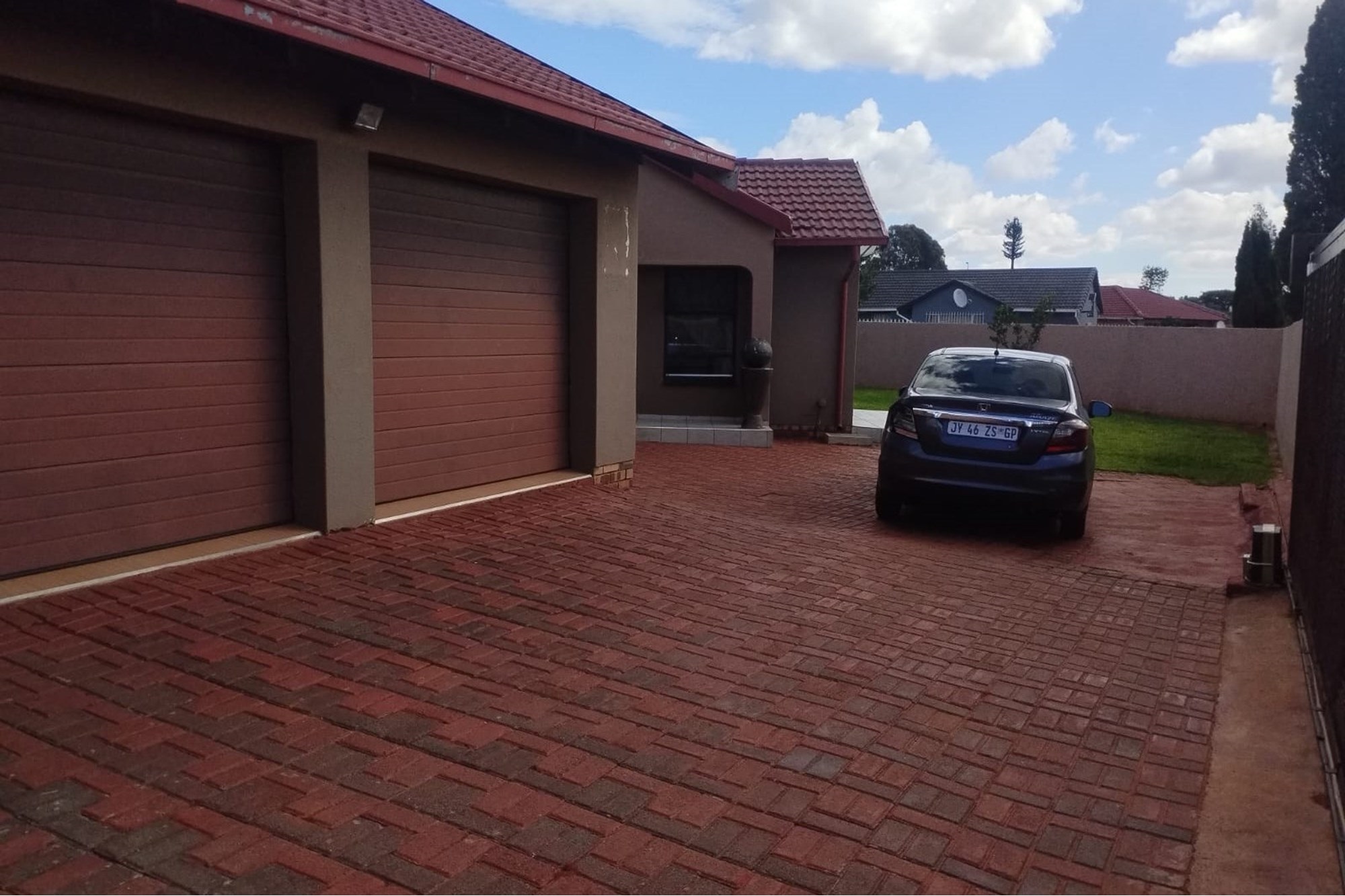 The lounge and dining areas have an open-plan design, both adorned with a PVC ceiling and designer porcelain tiles. The fitted kitchen boasts a modern finish and designer mosaic tiles on the walls. The house has two entrances, a double garage, and is fully paved, walled, and gated, ensuring privacy and security. The well-maintained garden complements the exterior, which is fitted with aluminum windows throughout.