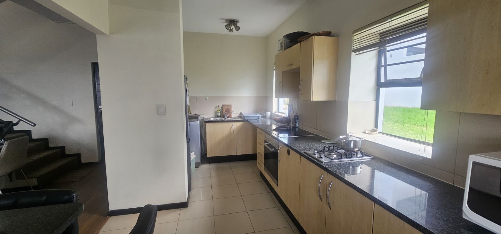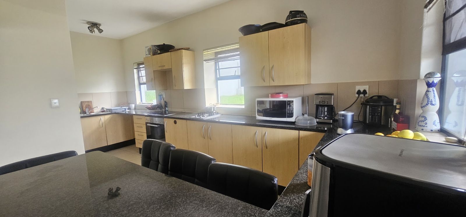 The modern kitchen is fitted with granite countertops and includes both a four-plate gas & electric stove a, ideal for versatile cooking.