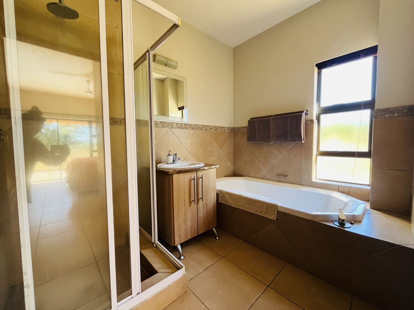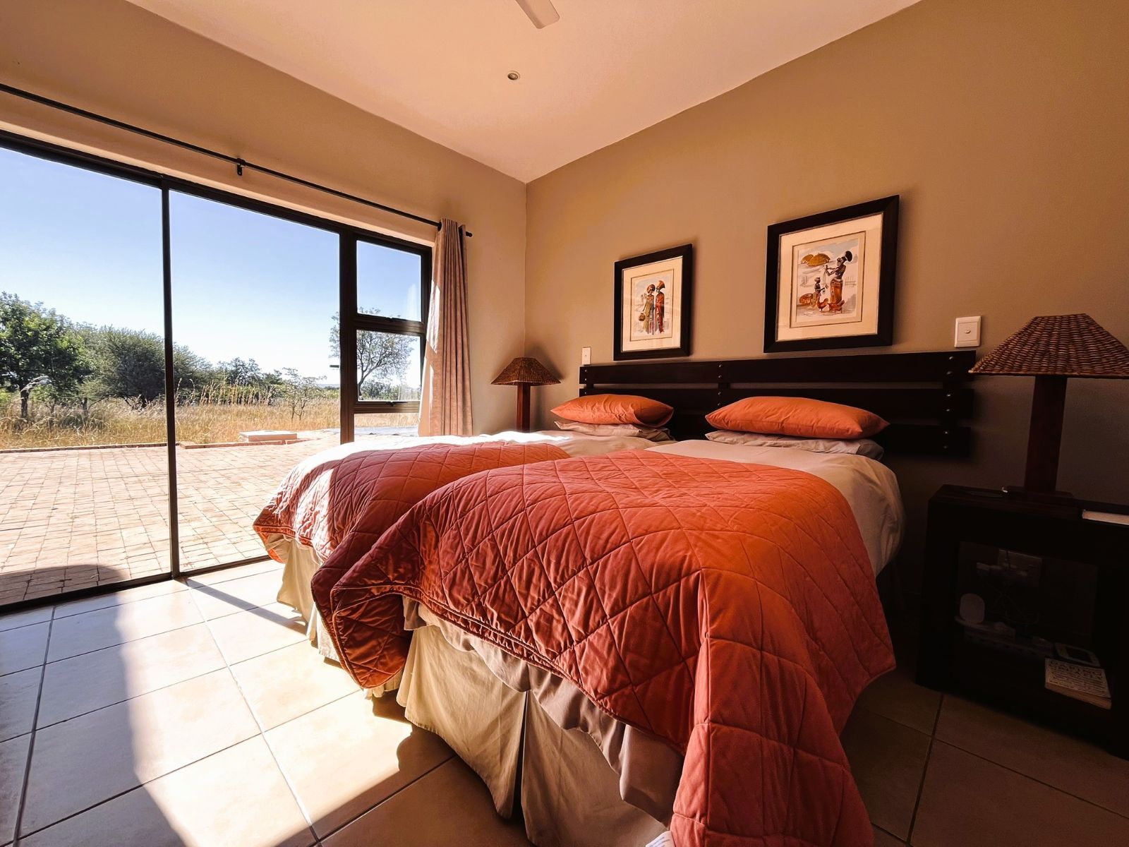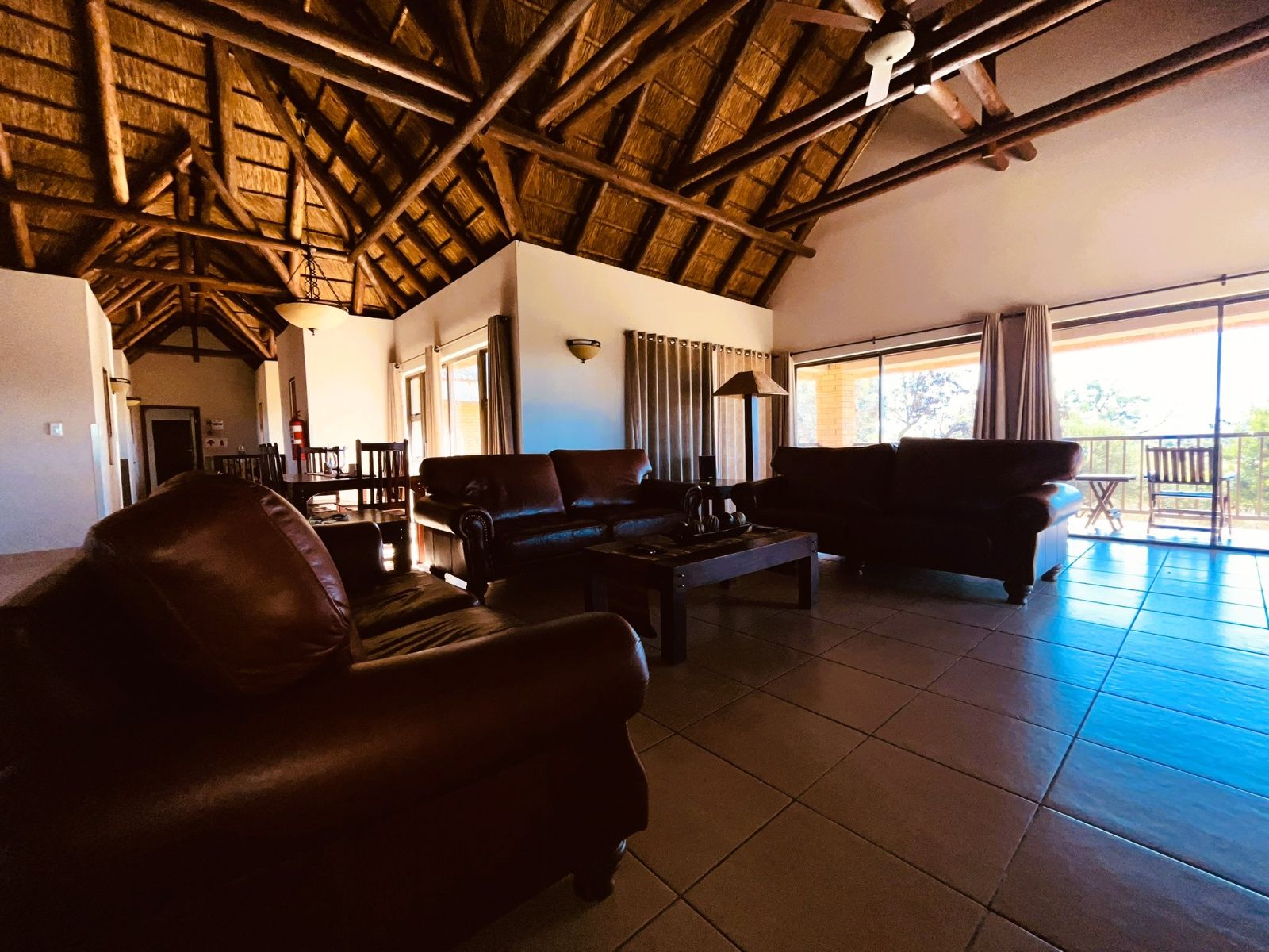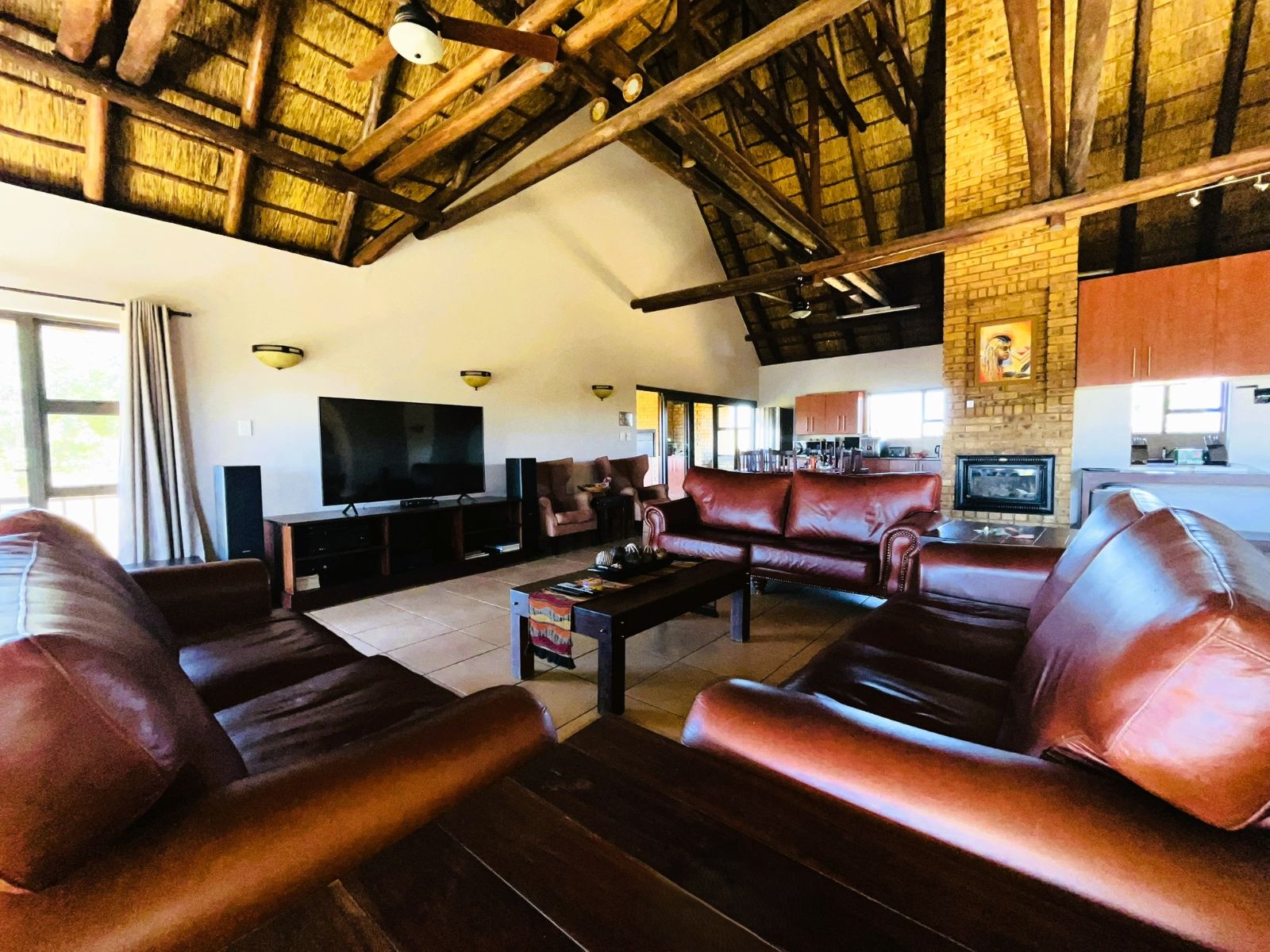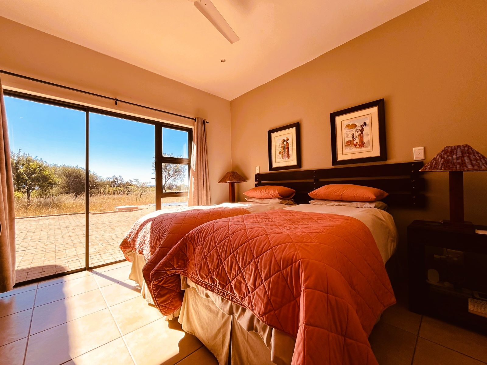 Inside, the open-plan living area flows seamlessly from the dining room to the lounge, adorned with bespoke Rhodesian Teak furniture, designer décor, genuine leather couches, and original artwork in all the rooms. The heart of the home is a well-equipped kitchen with top-end appliances, connecting perfectly to both the living area and an expansive entertainer’s patio. The patio features a built-in braai, gas hob, dining area, and comfortable lounge space, all fitted with exquisite Rhodesian Teak furnishings and with breath-taking bushveld views.