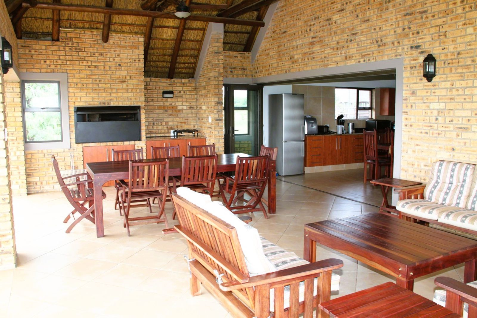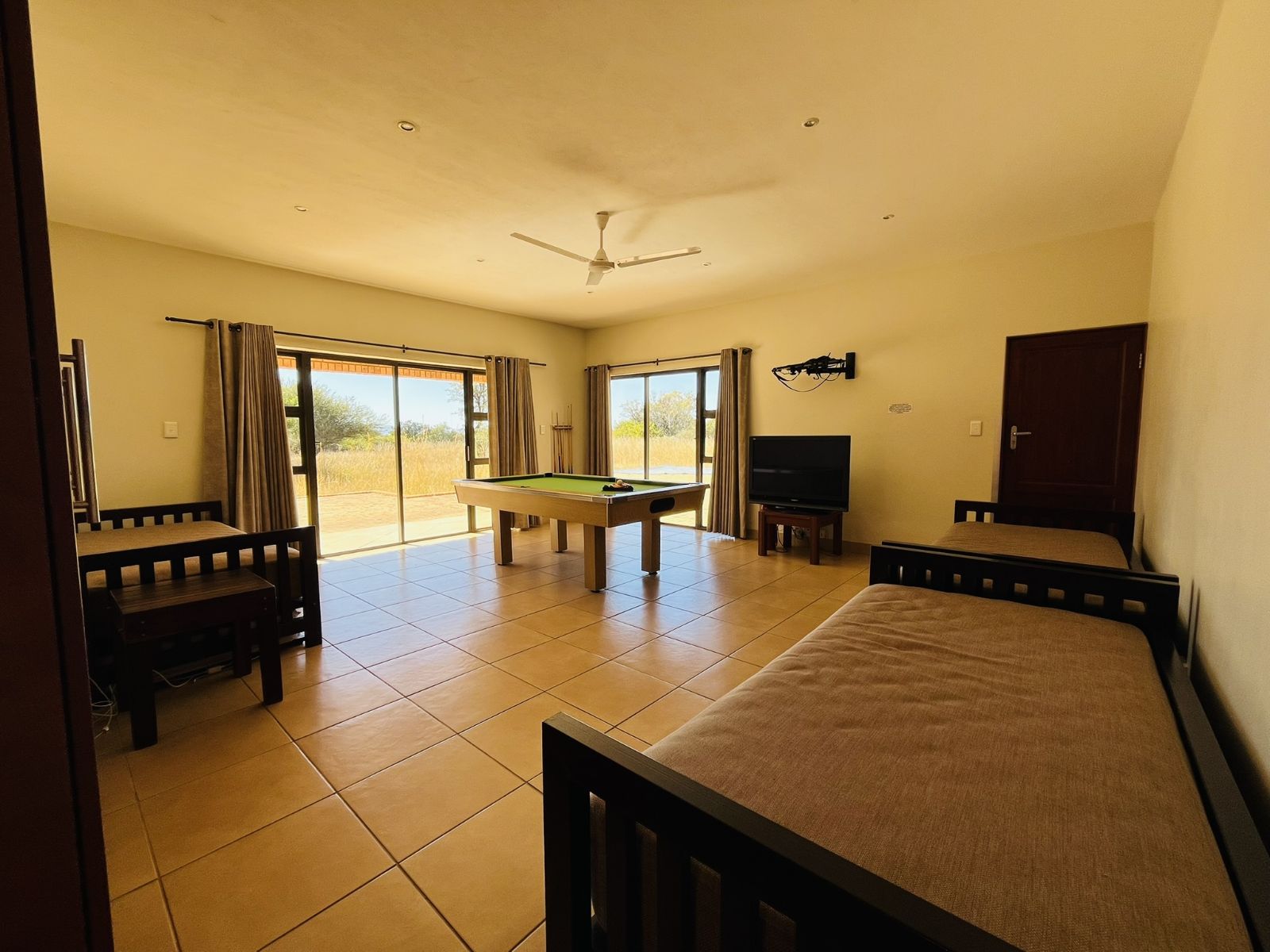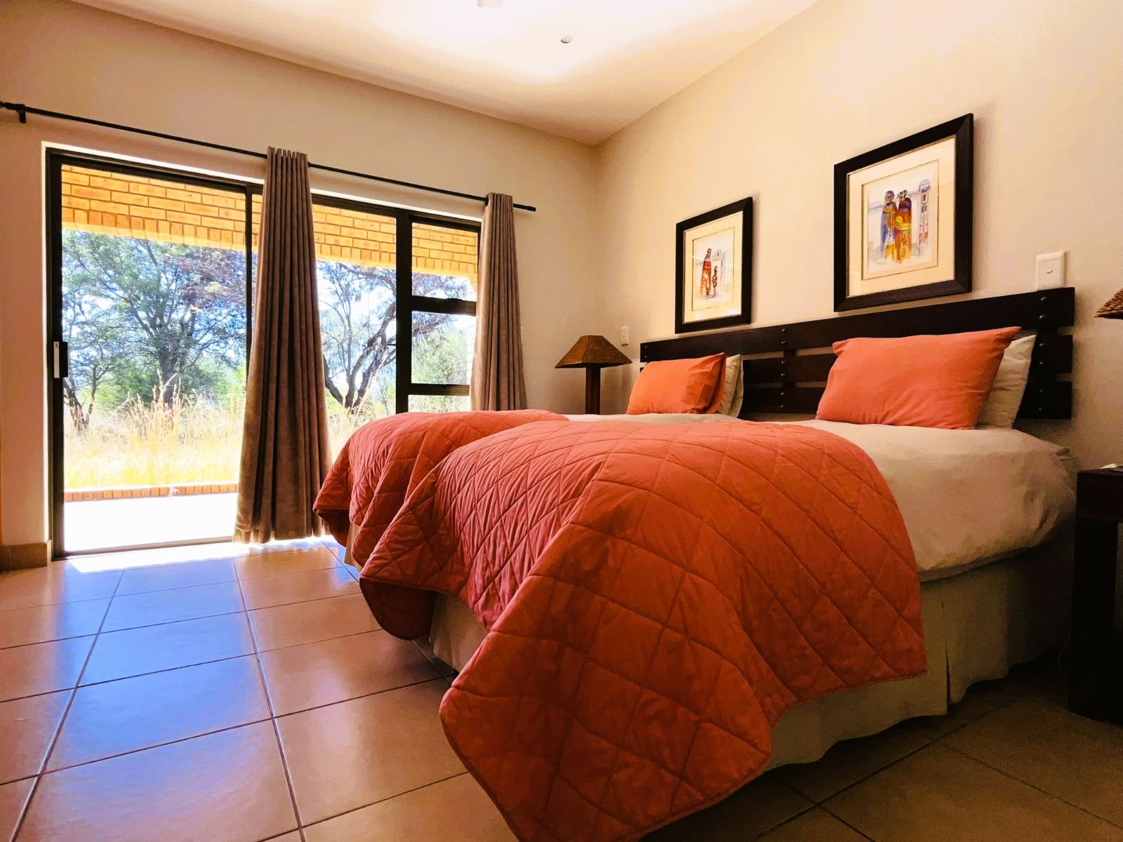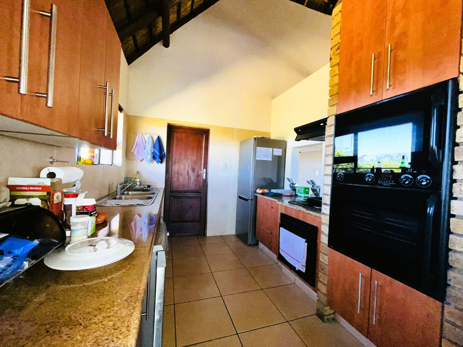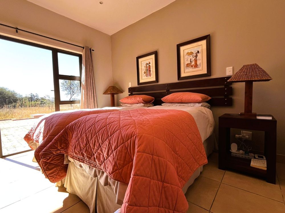Inside, the open-plan living area flows seamlessly from the dining room to the lounge, adorned with bespoke Rhodesian Teak furniture, designer décor, genuine leather couches, and original artwork in all the rooms. The heart of the home is a well-equipped kitchen with top-end appliances, connecting perfectly to both the living area and an expansive entertainer’s patio. The patio features a built-in braai, gas hob, dining area, and comfortable lounge space, all fitted with exquisite Rhodesian Teak furnishings and with breath-taking bushveld views.