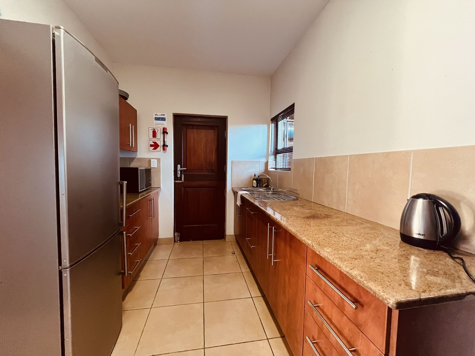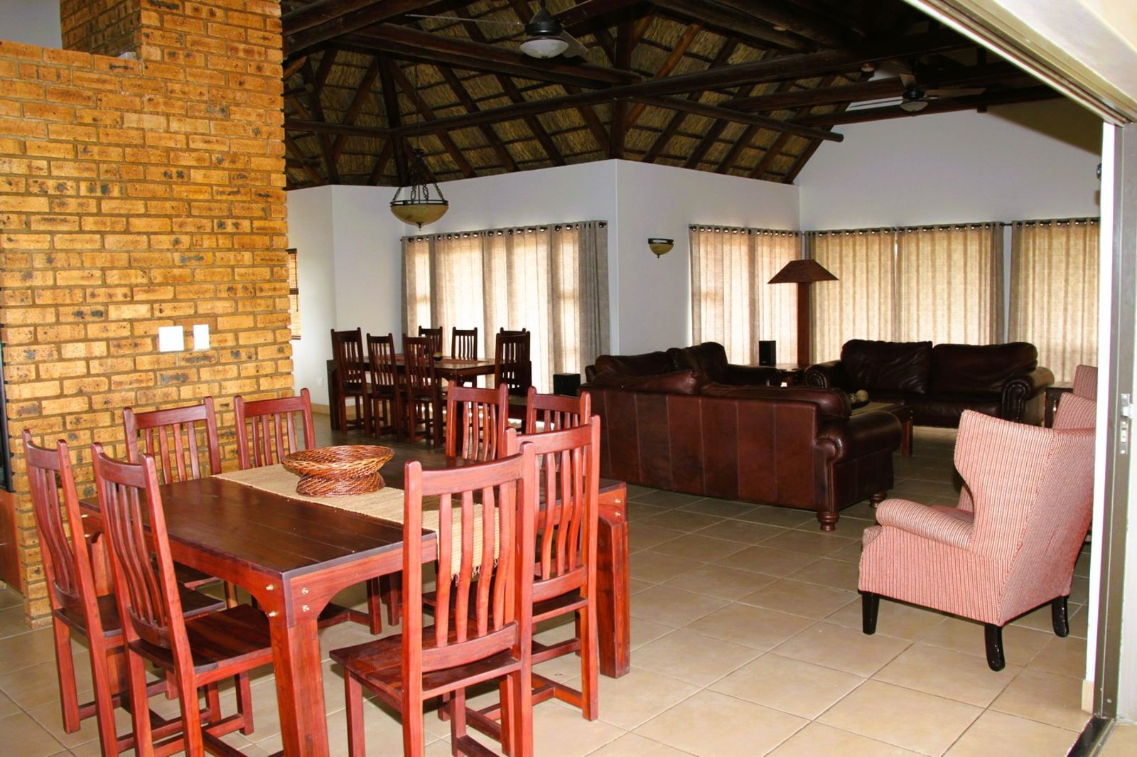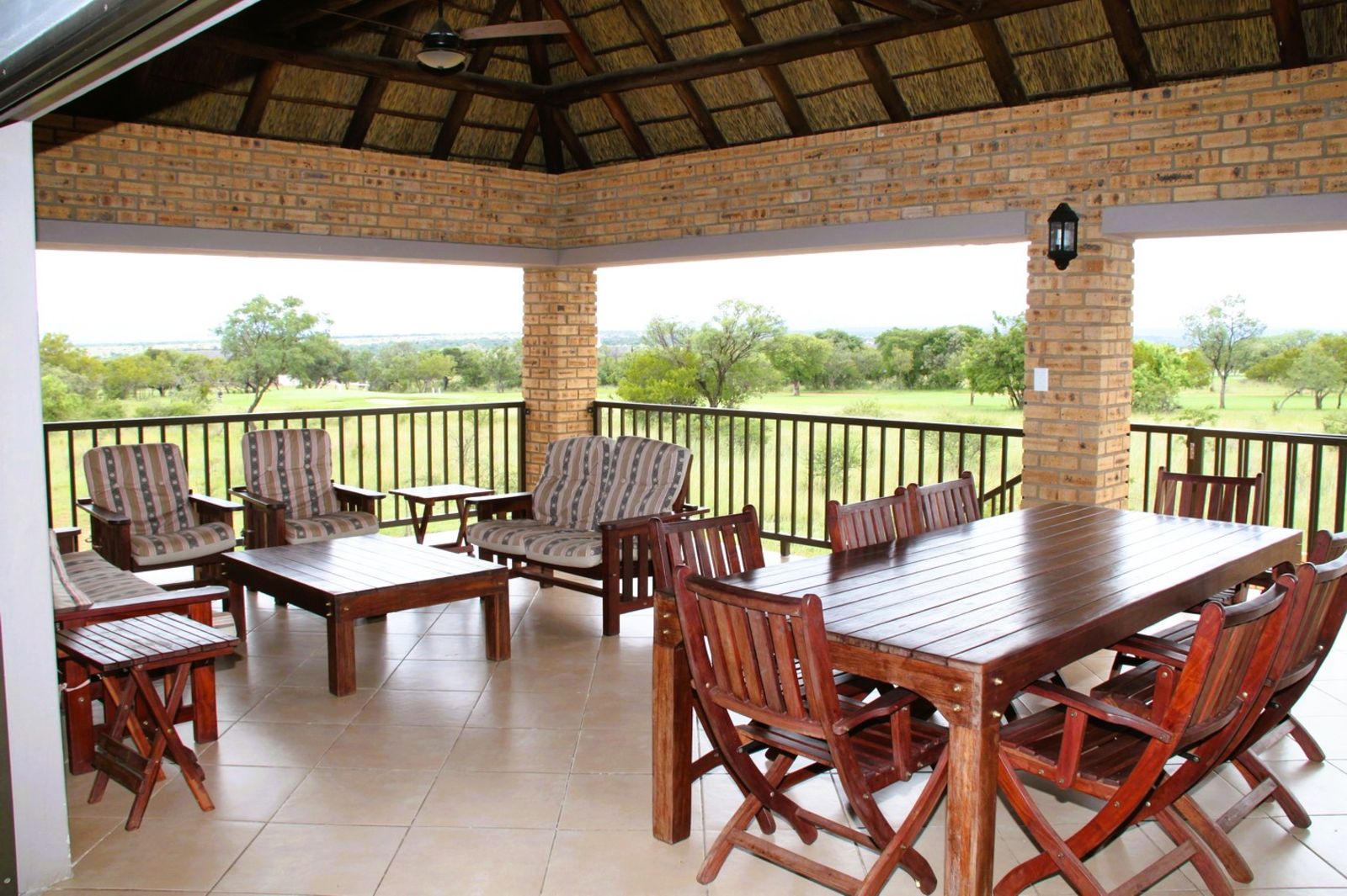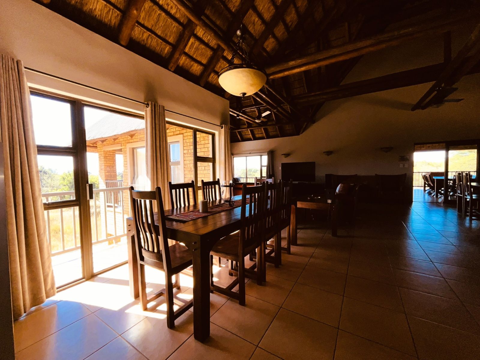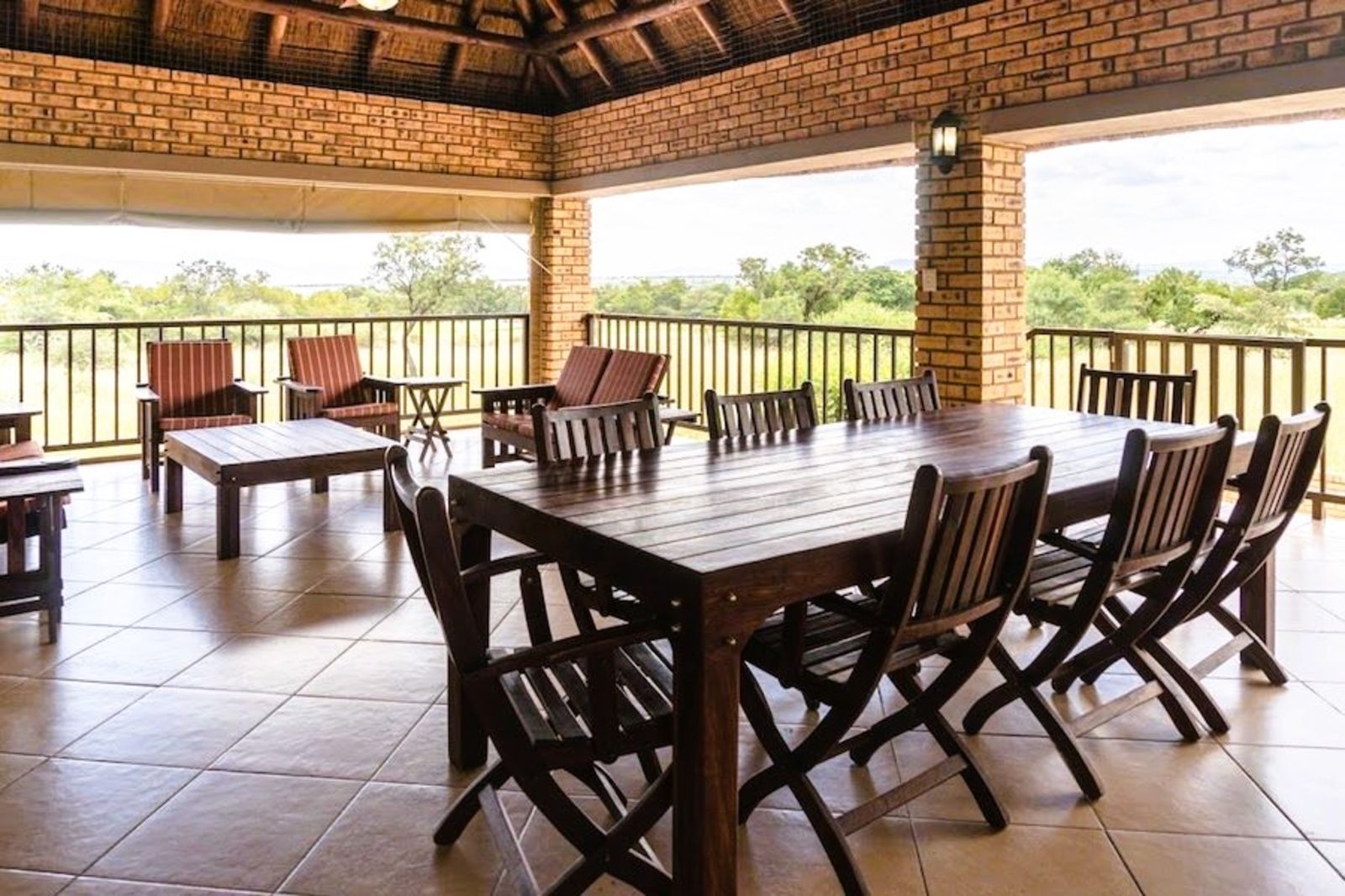 Inside, the open-plan living area flows seamlessly from the dining room to the lounge, adorned with bespoke Rhodesian Teak furniture, designer décor, genuine leather couches, and original artwork in all the rooms. The heart of the home is a well-equipped kitchen with top-end appliances, connecting perfectly to both the living area and an expansive entertainer’s patio. The patio features a built-in braai, gas hob, dining area, and comfortable lounge space, all fitted with exquisite Rhodesian Teak furnishings and with breath-taking bushveld views.