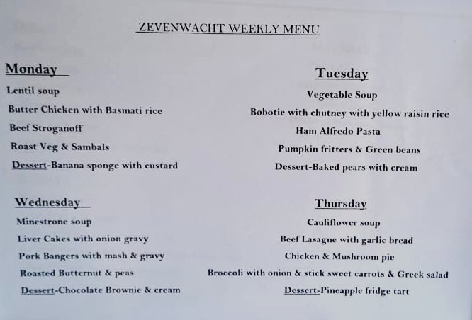 The levies cover a weekly laundry service for up to 4 kg (with additional laundry costing R20 per kg), a weekly housekeeping service, and eight meals per month. Domestic water consumption is included, as well as access to the communal center, which features a TV lounge, dining room, braai room, library, and a lounge area to watch DStv. Building insurance and exterior maintenance are included, eliminating the need for separate building insurance. Refuse removal is also part of the package. Attached are two example photos of the weekly menu options; please note that they may vary.