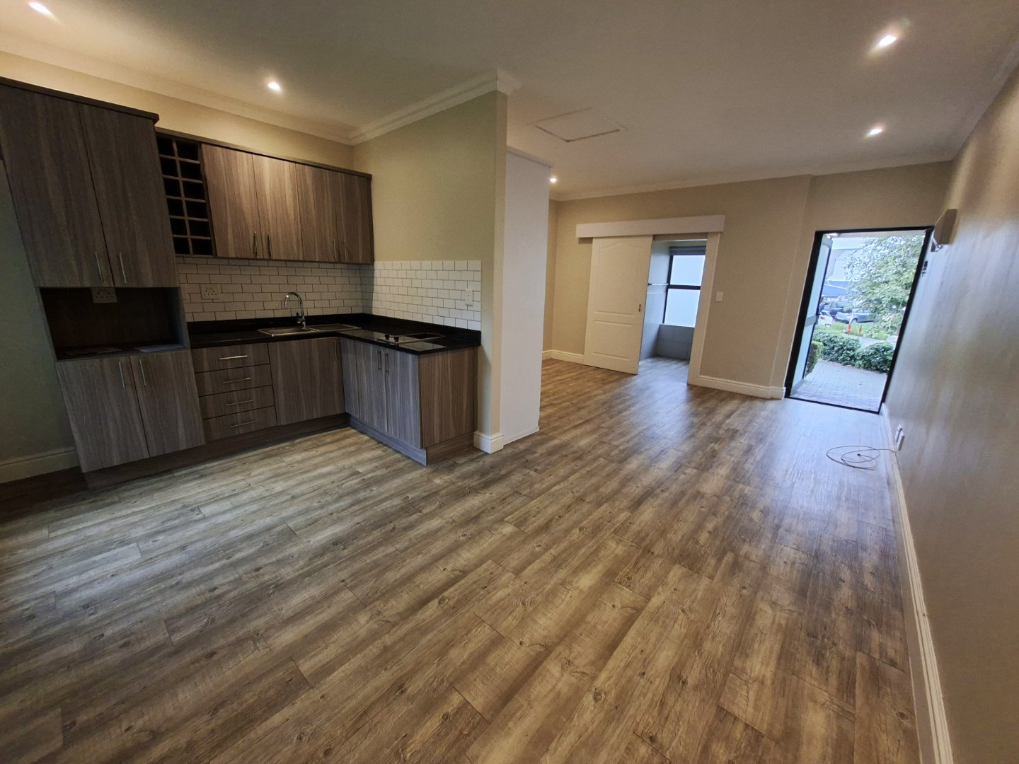 Adjacent to the bedroom is an open-plan living area that overlooks a kitchenette outfitted with granite countertops and a ceramic two-plate hob. There is ample space for a fridge and additional shelving for bottles. The stoep (veranda) has been enclosed and integrated into the living area, featuring stacker doors, aluminum windows, and roller blinds that open up to your private garden.