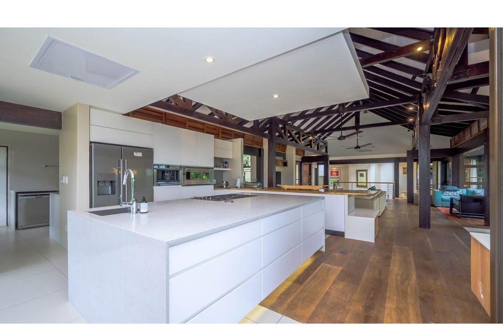 As you step into the main house, you are welcomed by a spacious lounge adorned with high ceilings and exposed timber beams,
