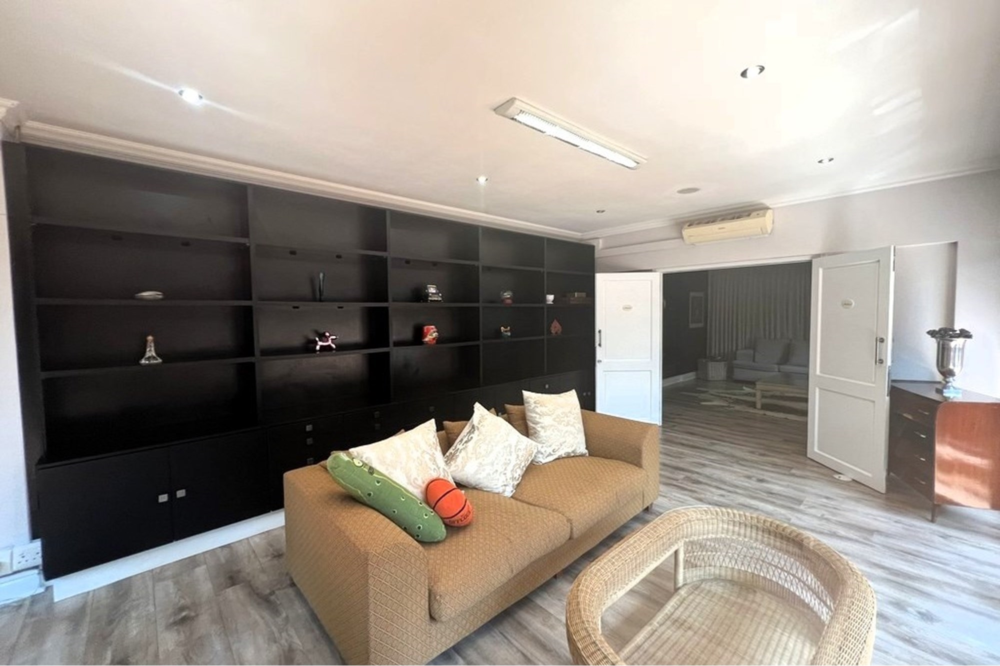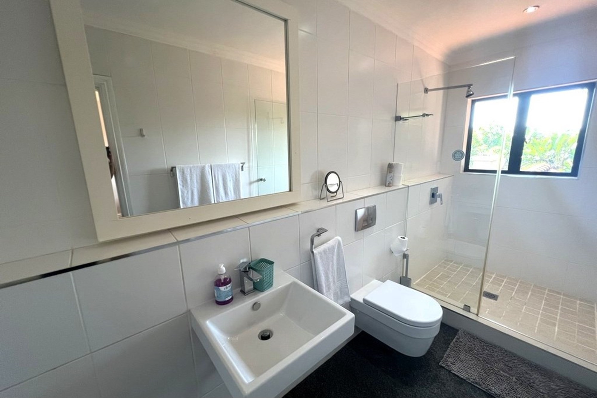 The first level opens up to a spacious garden and offers two lounges, two dining areas, and a beautifully fitted open-plan kitchen with a central island, laundry, and scullery. These areas seamlessly flow onto a large undercover entertainment area, complete with a private pool and a built-in gas braai, making it ideal for family gatherings. A guest suite is also conveniently located on this level.