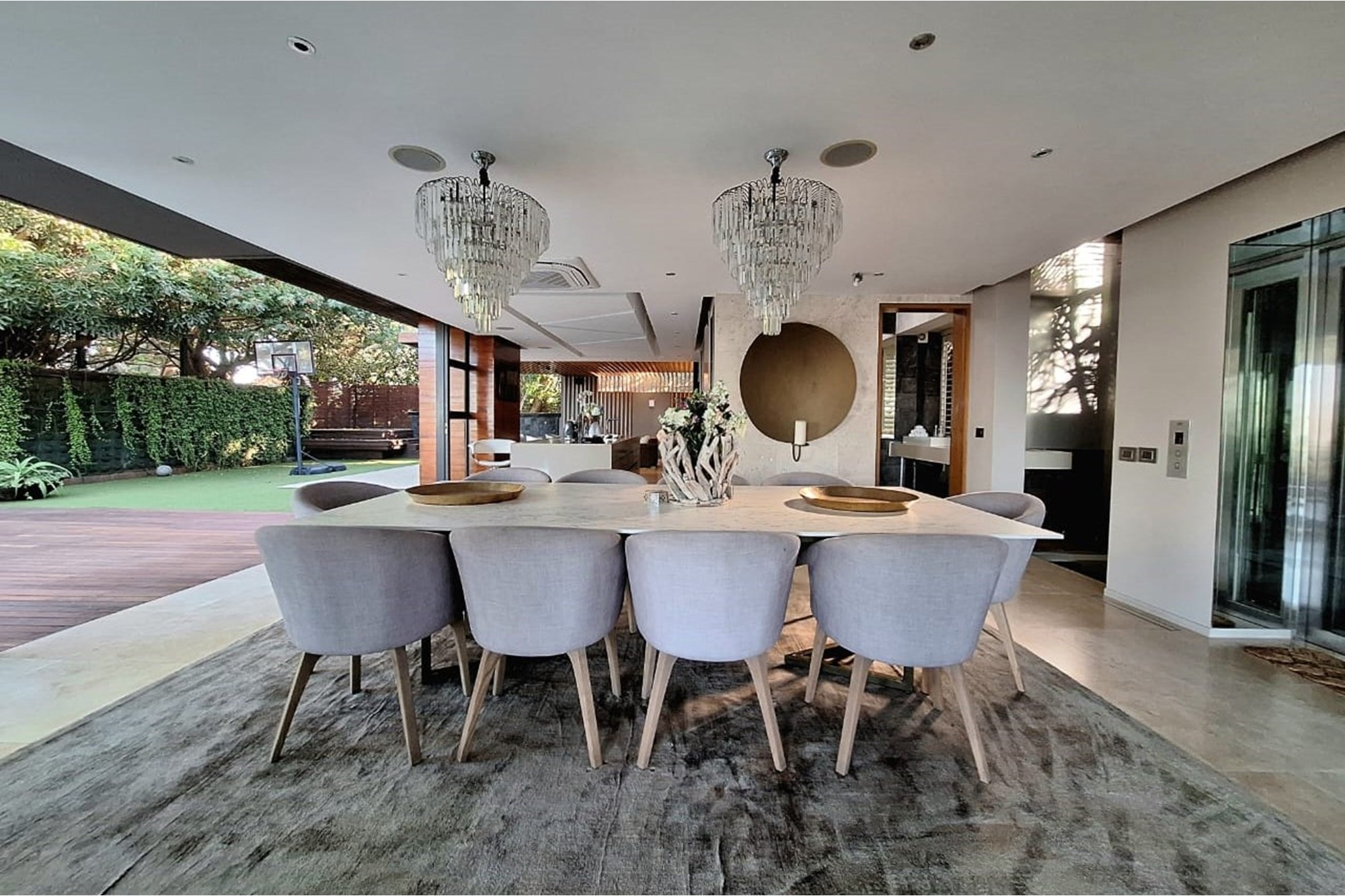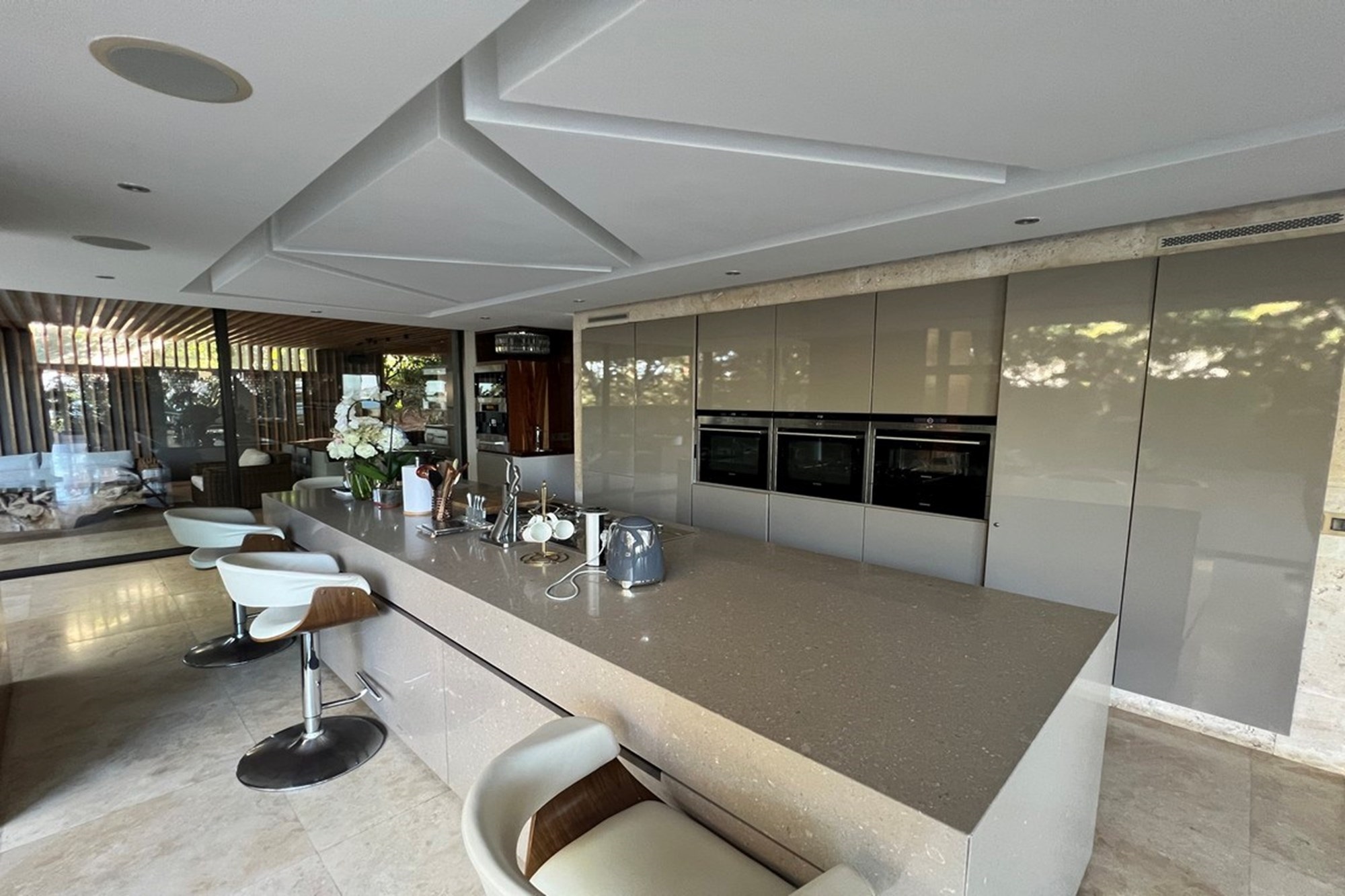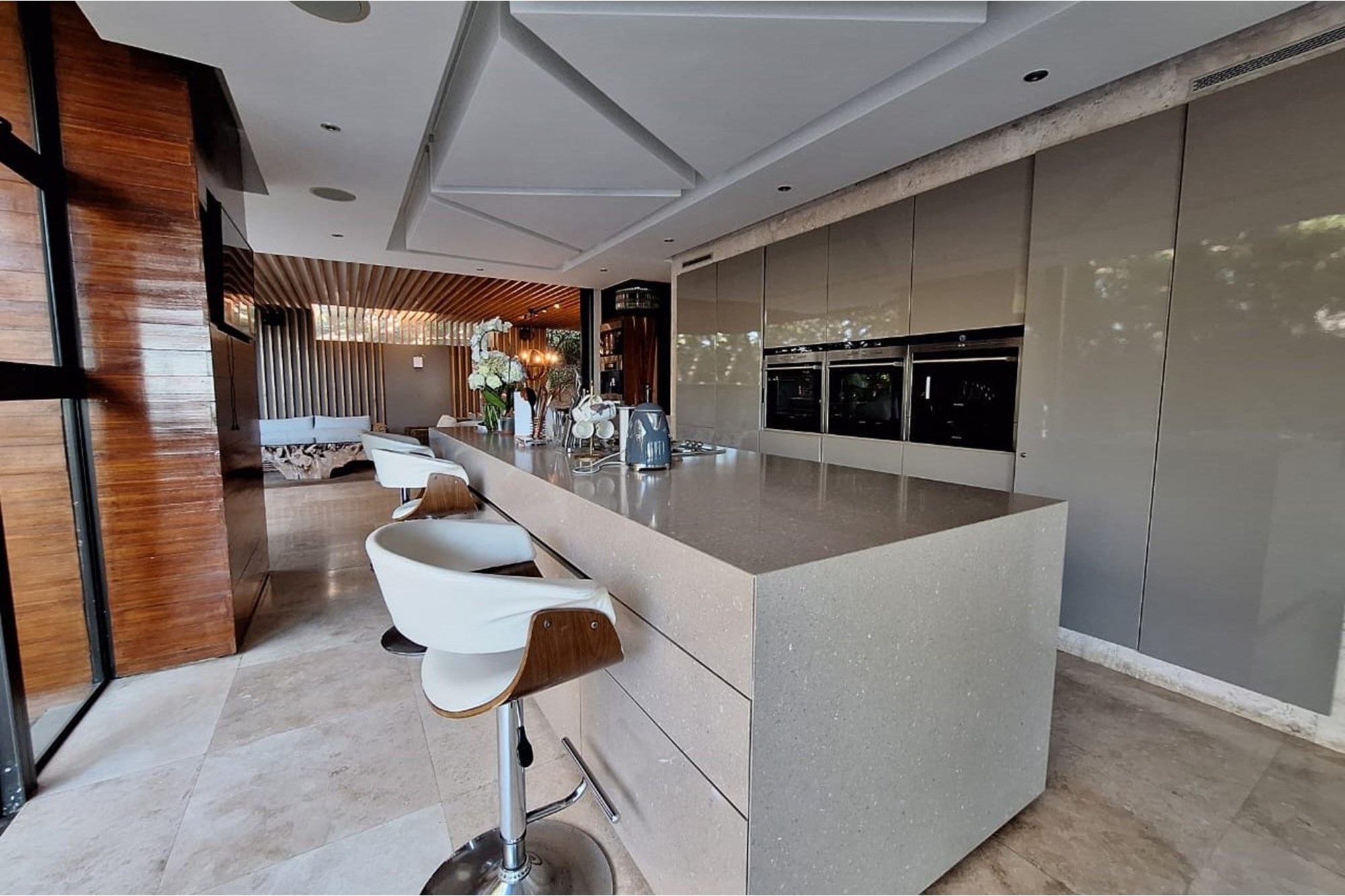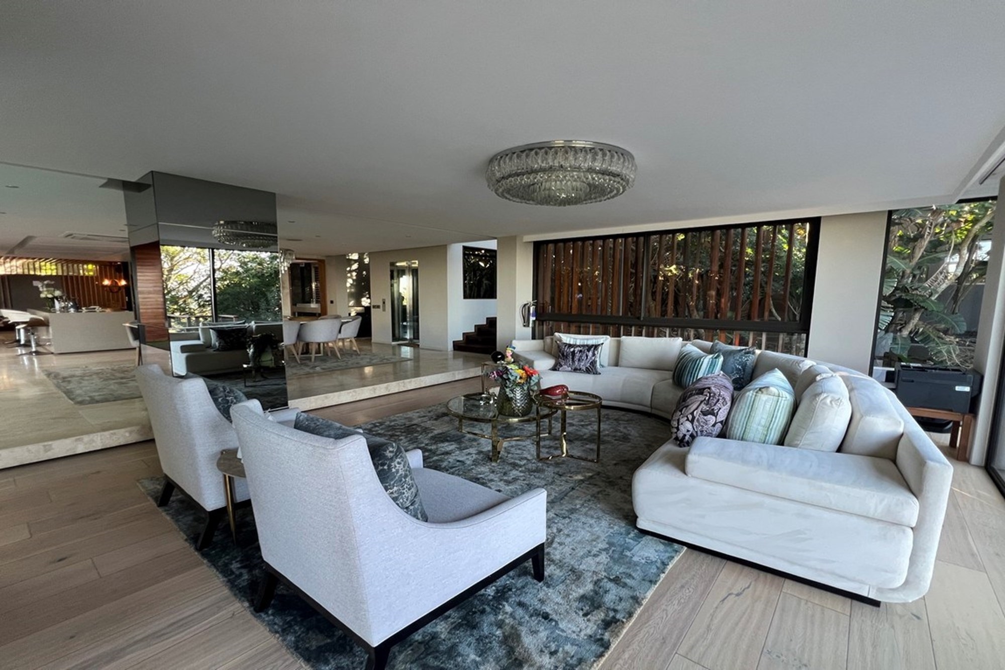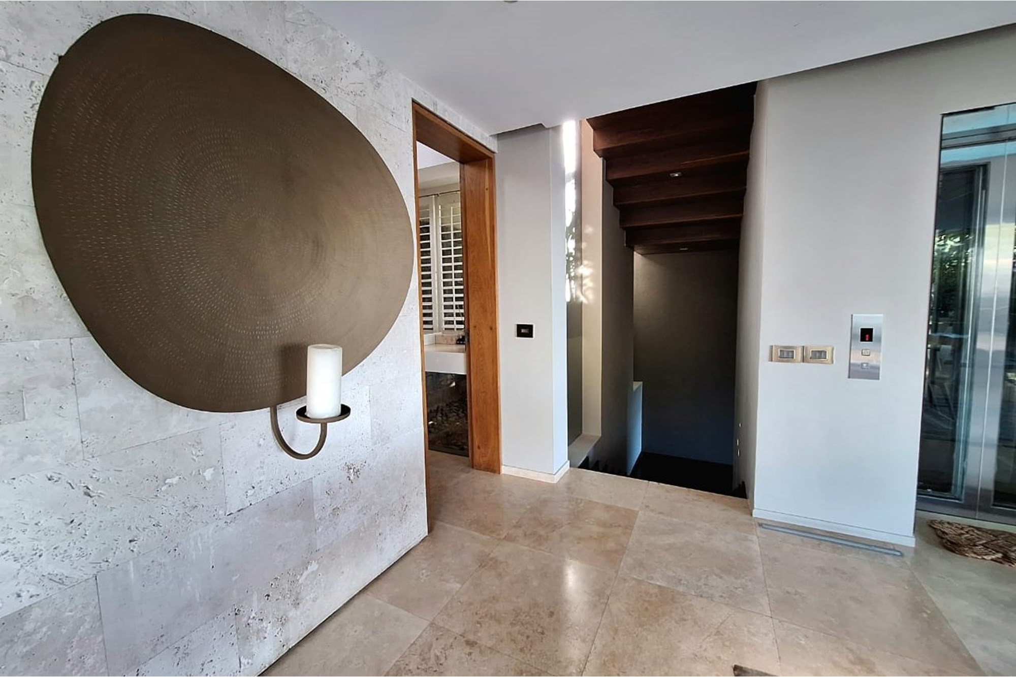 A private lift connects all levels of the home, making movement effortless from the triple garage to the bedroom level. The home features spacious open-plan living areas, a state-of-the-art kitchen, and large glass doors that open to covered patios, a beautiful pool, and a lush garden—perfect for indoor-outdoor living.