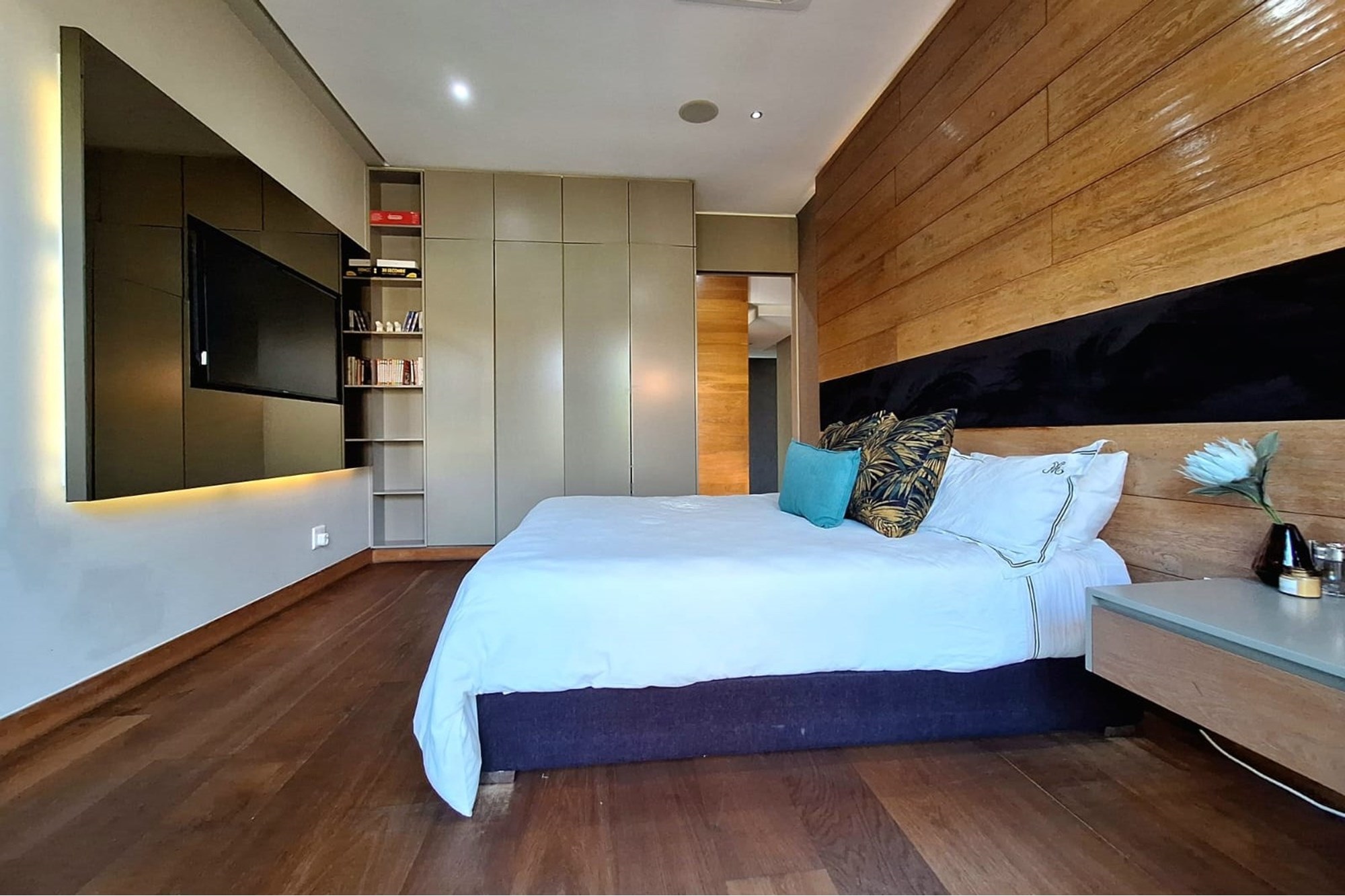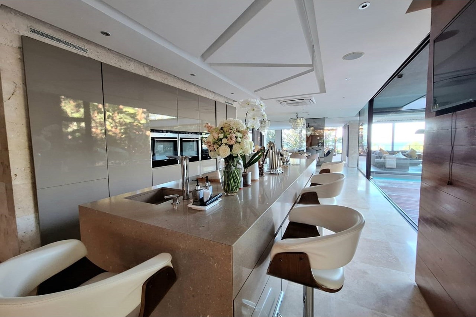 Special features include a private cinema room, built-in appliances, an outdoor kitchen with gas braai and minibar fridge, and ducted air-conditioning. The master suite is a true retreat, with sea views, a walk-in closet, freestanding bath, and gas fireplace.