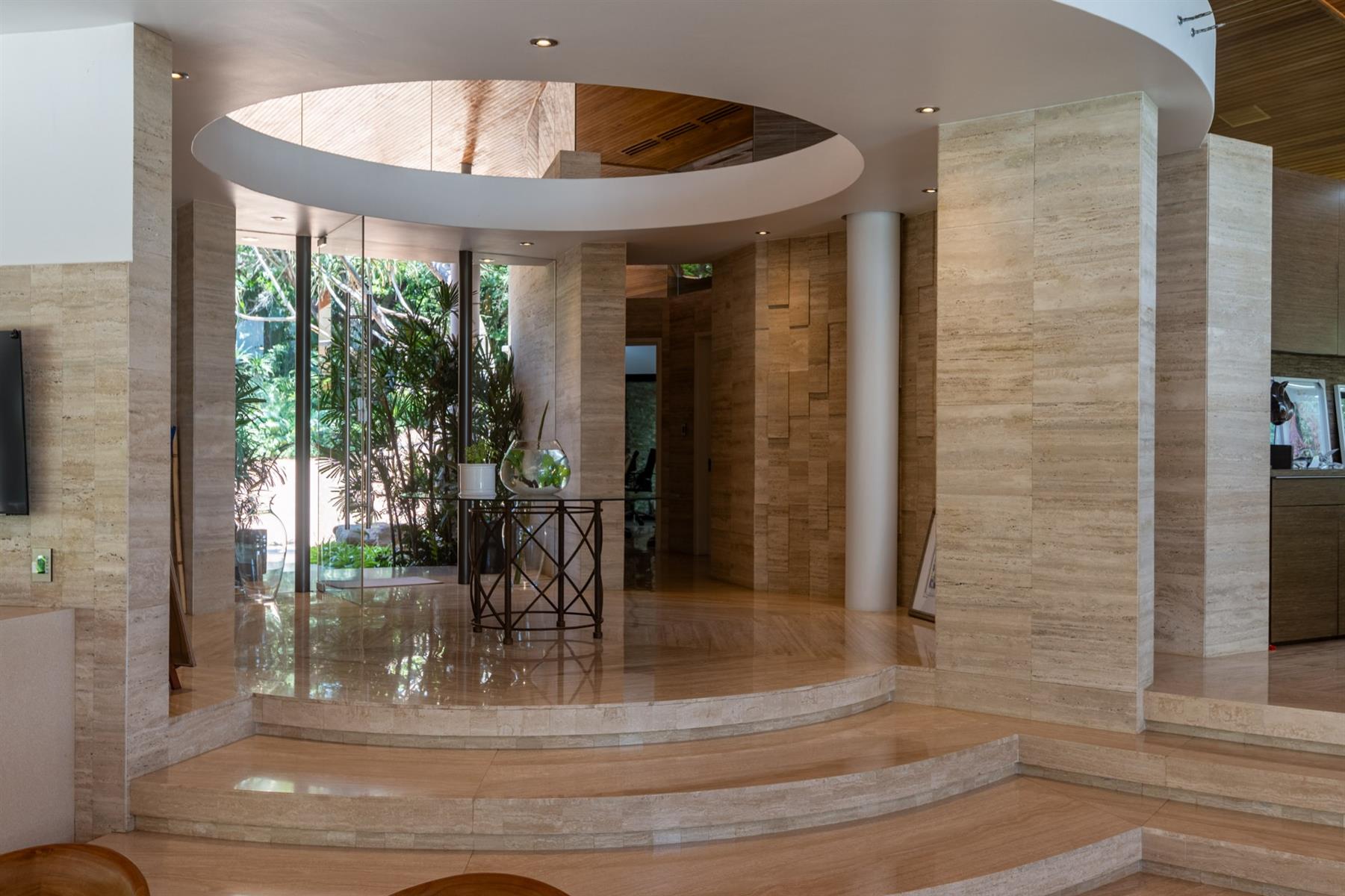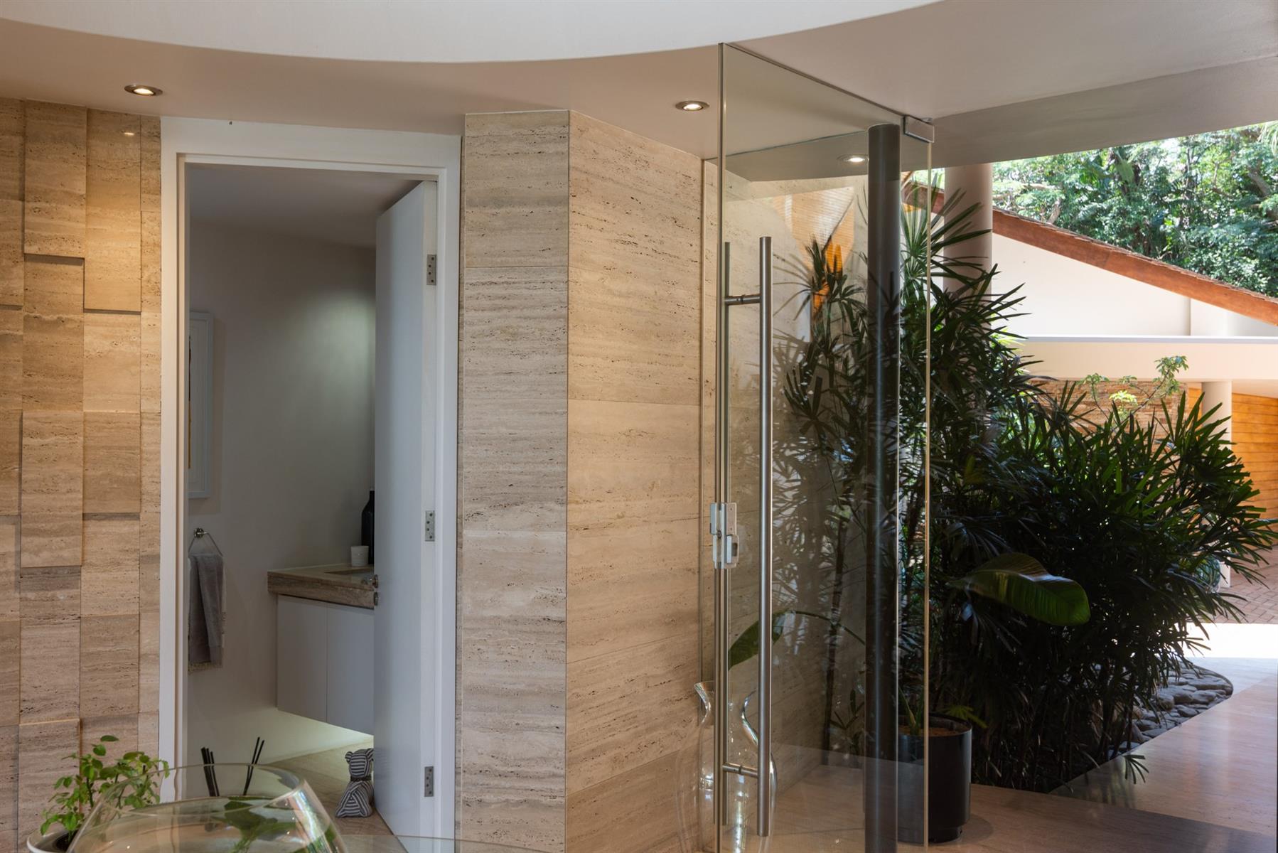 The double volume living spaces feature vaulted ceilings lined with imported Pau Marfim Brazilian hardwood, adding warmth and scale to the interior. Large glass windows and folding sliding doors open most of the living areas fully to the outside, letting in natural light and creating a strong indoor-outdoor flow.